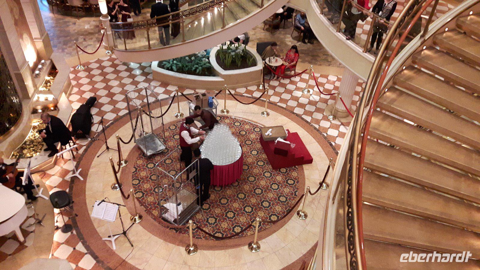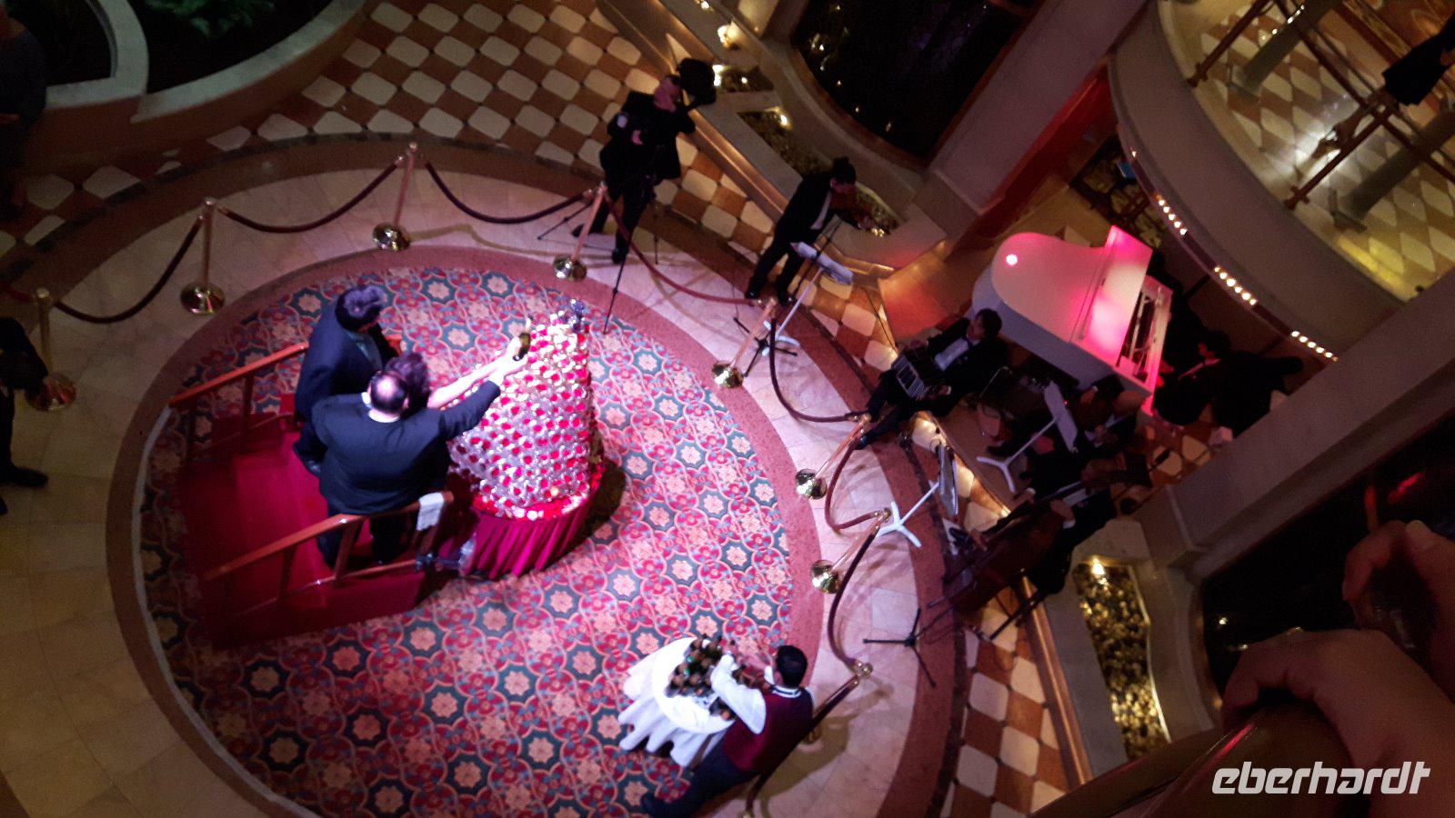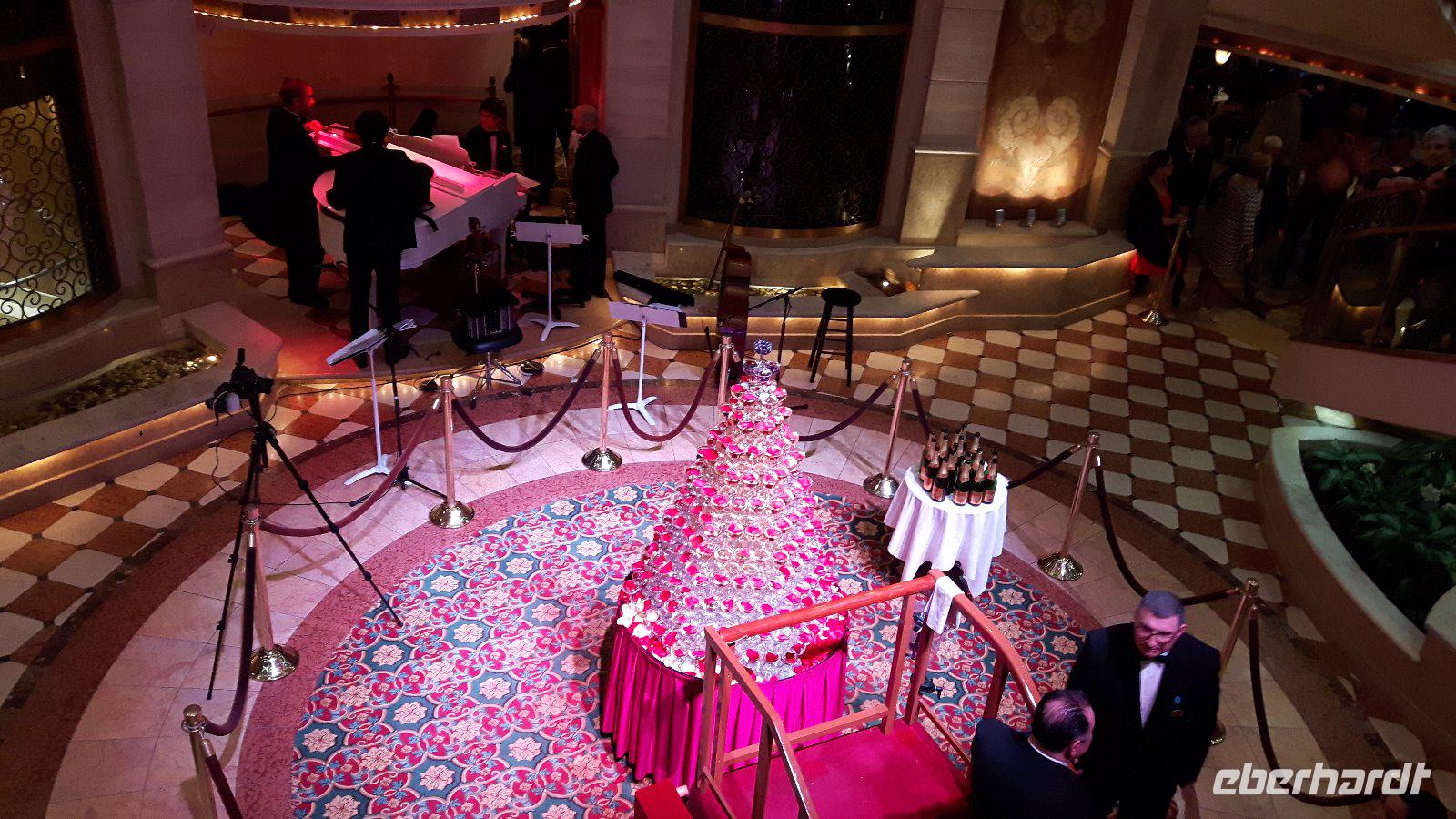 Am späteren Vormittag treffen wir uns dann an der Bar um offene Fragen und Wünsche der Eberhardt Reisegäste zu besprechen. Am Nachmittag heißt es dann sich „in Schale zu werfen", der erste formelle Abend steht auf dem Programm. Besonders gediegen wird heute im Speisesaal serviert, im Atrium wird verschwenderisch der Champagnerbrunnen gefüllt.
