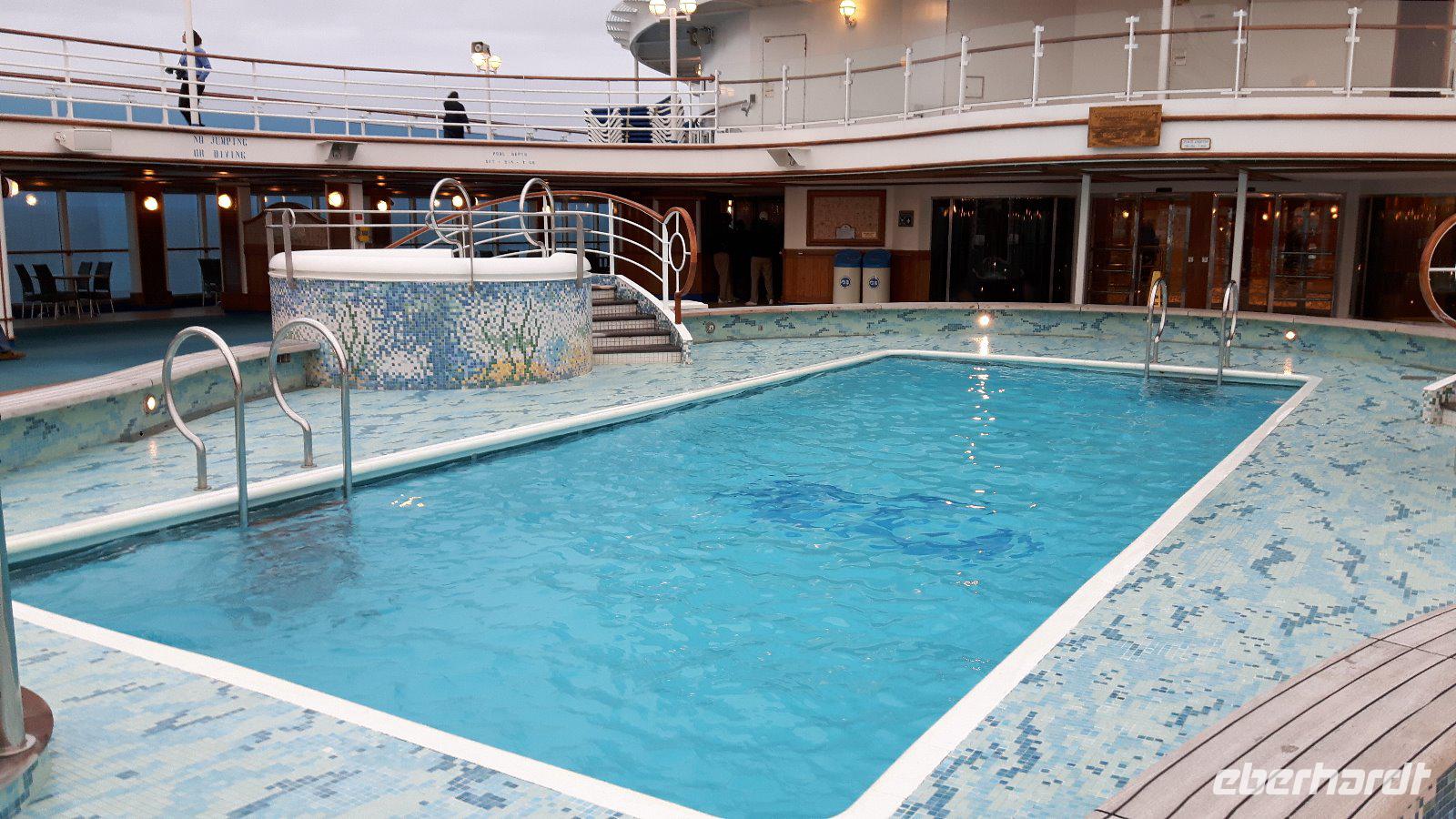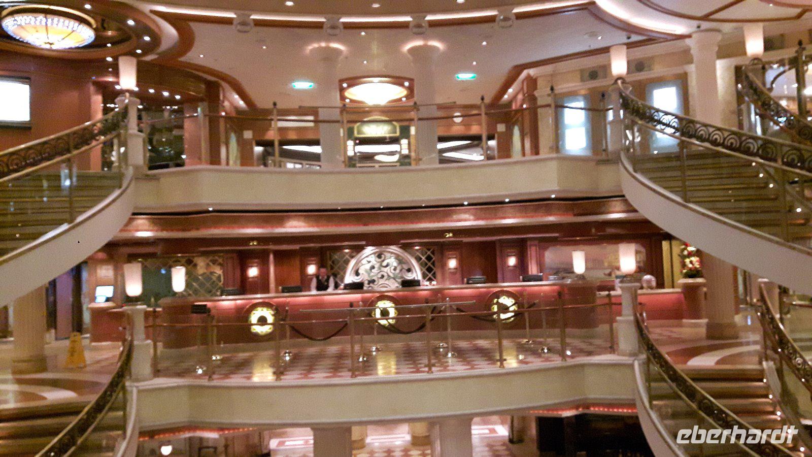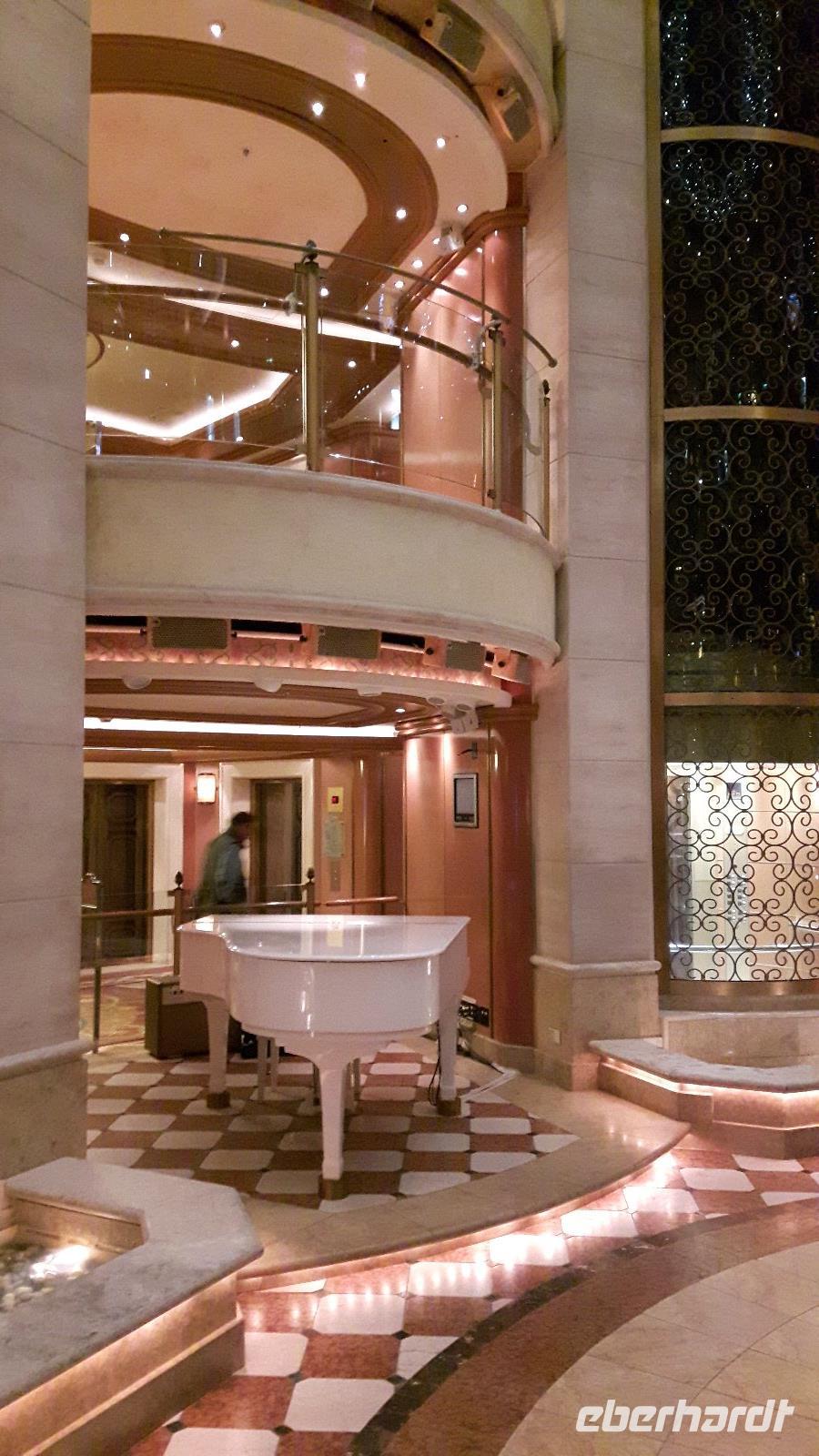 Am späteren Vormittag treffen wir uns dann an der Bar um offene Fragen und Wünsche der Eberhardt Reisegäste zu besprechen. Am Nachmittag heißt es dann sich „in Schale zu werfen", der erste formelle Abend steht auf dem Programm. Besonders gediegen wird heute im Speisesaal serviert, im Atrium wird verschwenderisch der Champagnerbrunnen gefüllt.