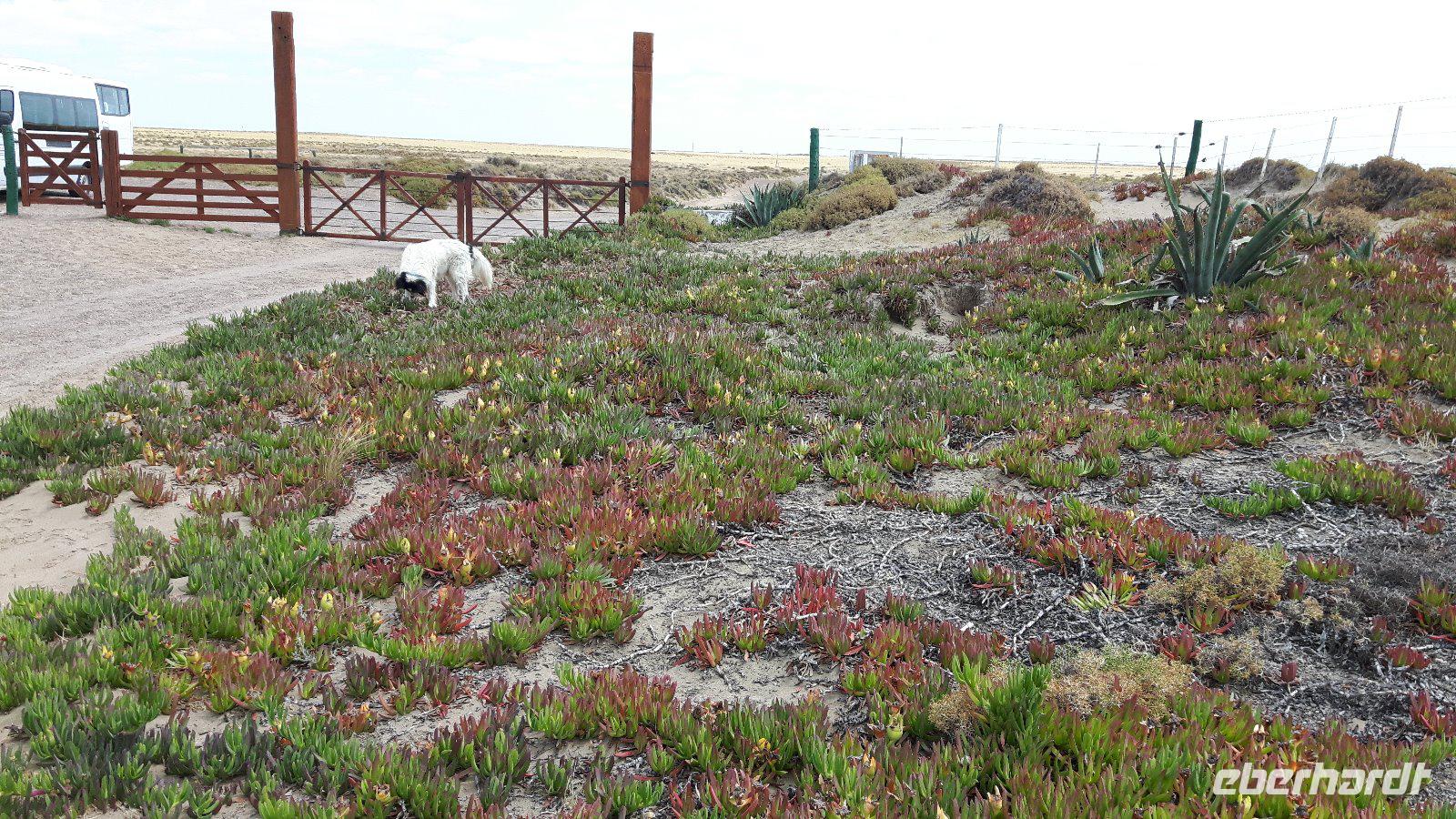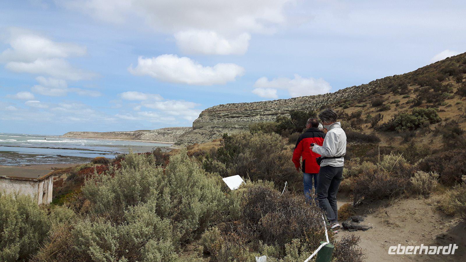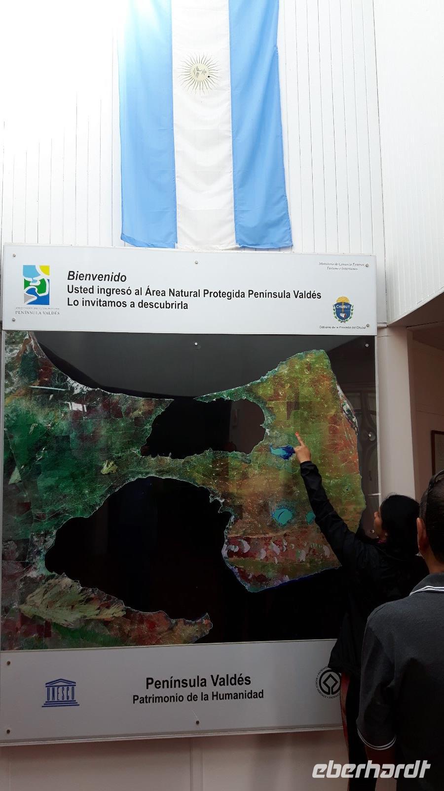 Nach dem Frühstück gehen wir von Bord, unsere örtliche Reiseleiterin, Marianne, erwartet uns direkt am Pier, ein kurzer Spaziergang zum Bus und der Ausflug auf die Halbinsel Valdes kann beginnen. Der erste Stopp am Besucherzentrum „Centro de Visitantes" vermittelt einen guten Überblick über Flora und Fauna der Region und ist so ein guter Einstieg in das Naturerlebnis Patagonien. Weiter geht es über unbefestigte Straße durch die kleine Ortschaft Punta Piramides, vorbei an Salzseen (Salina Grande, Salina Chica) zum Punta Delgado.