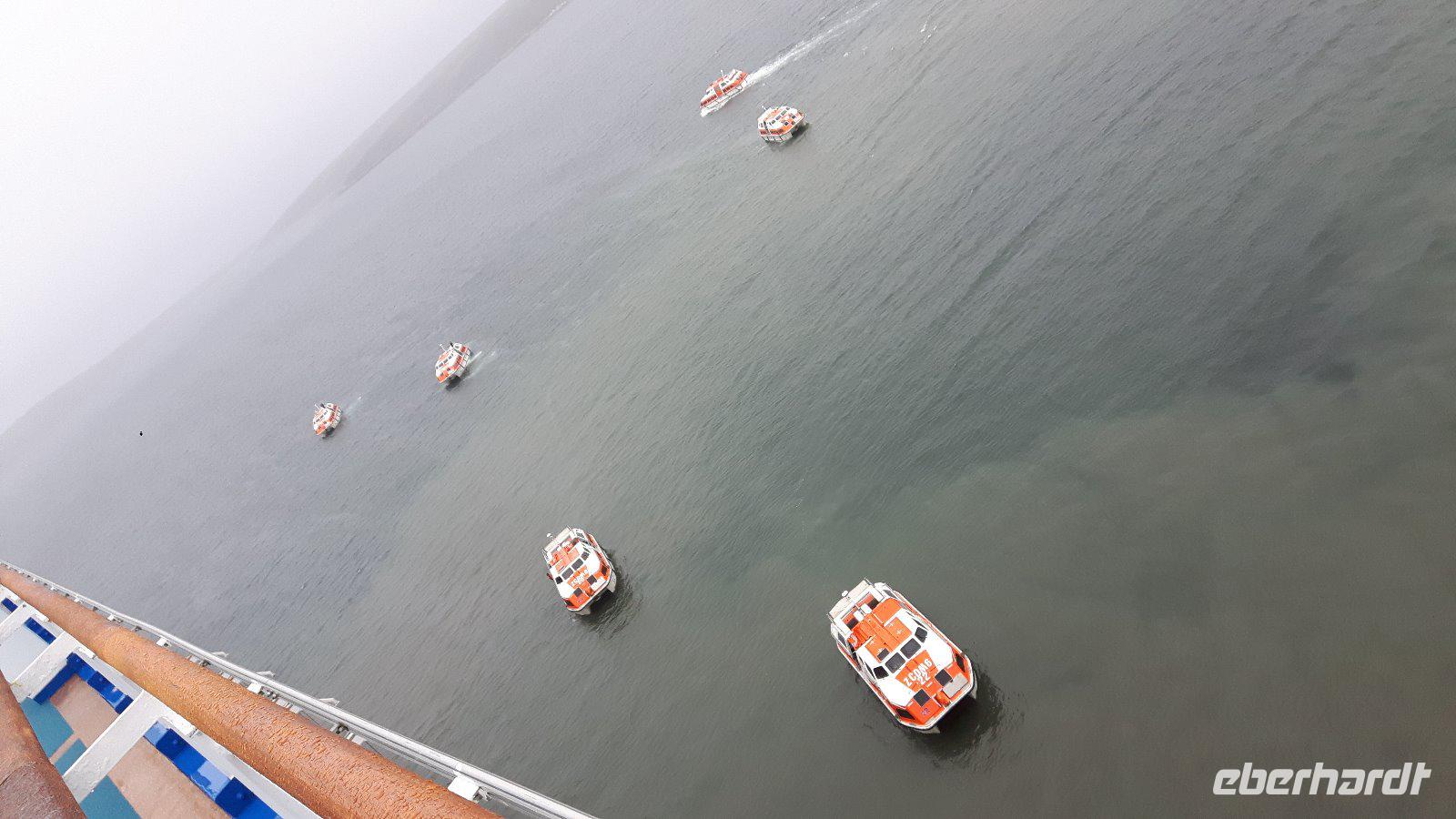 Leider gestaltet es sich hier problematisch an Land zu kommen; zunächst fehlt dem Schiff die notwendige Freigabe durch die Hafen- Autorität, dann sind inzwischen die beiden zur Verfügung stehenden Piers durch andere Kreuzfahrtschiffe belegt. Die Tenderboote können aufgrund des niedrigen Wasserstandes erst eingesetzt werden, nachdem man angemietete Katamarane als „Zwischenstufe" am Pier anlegen lassen hat. Der immense Zeitverzug führt dazu, dass unser geplanter Ausflug von der Reederei gestrichen wird.