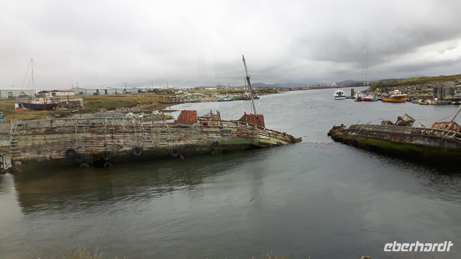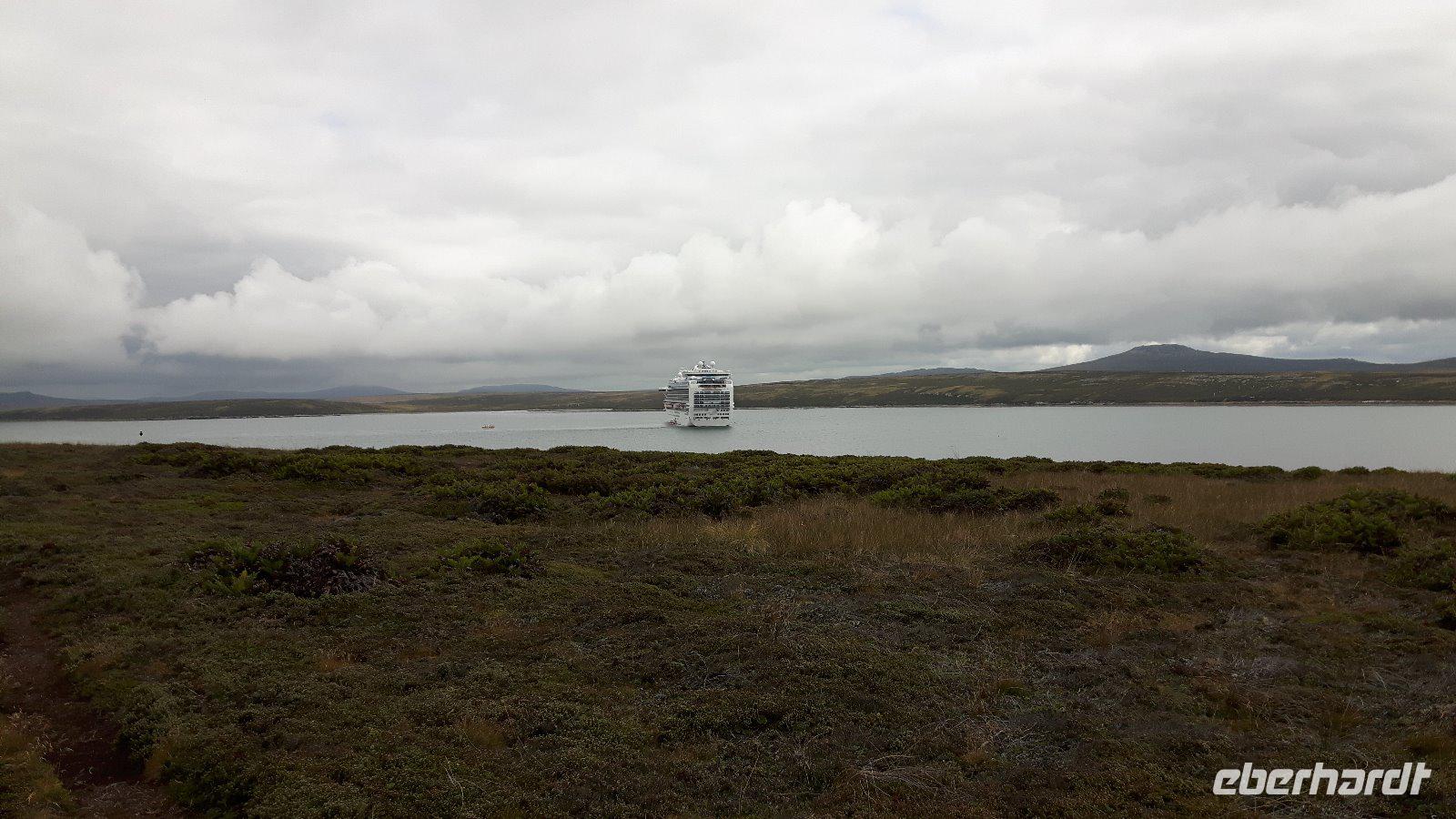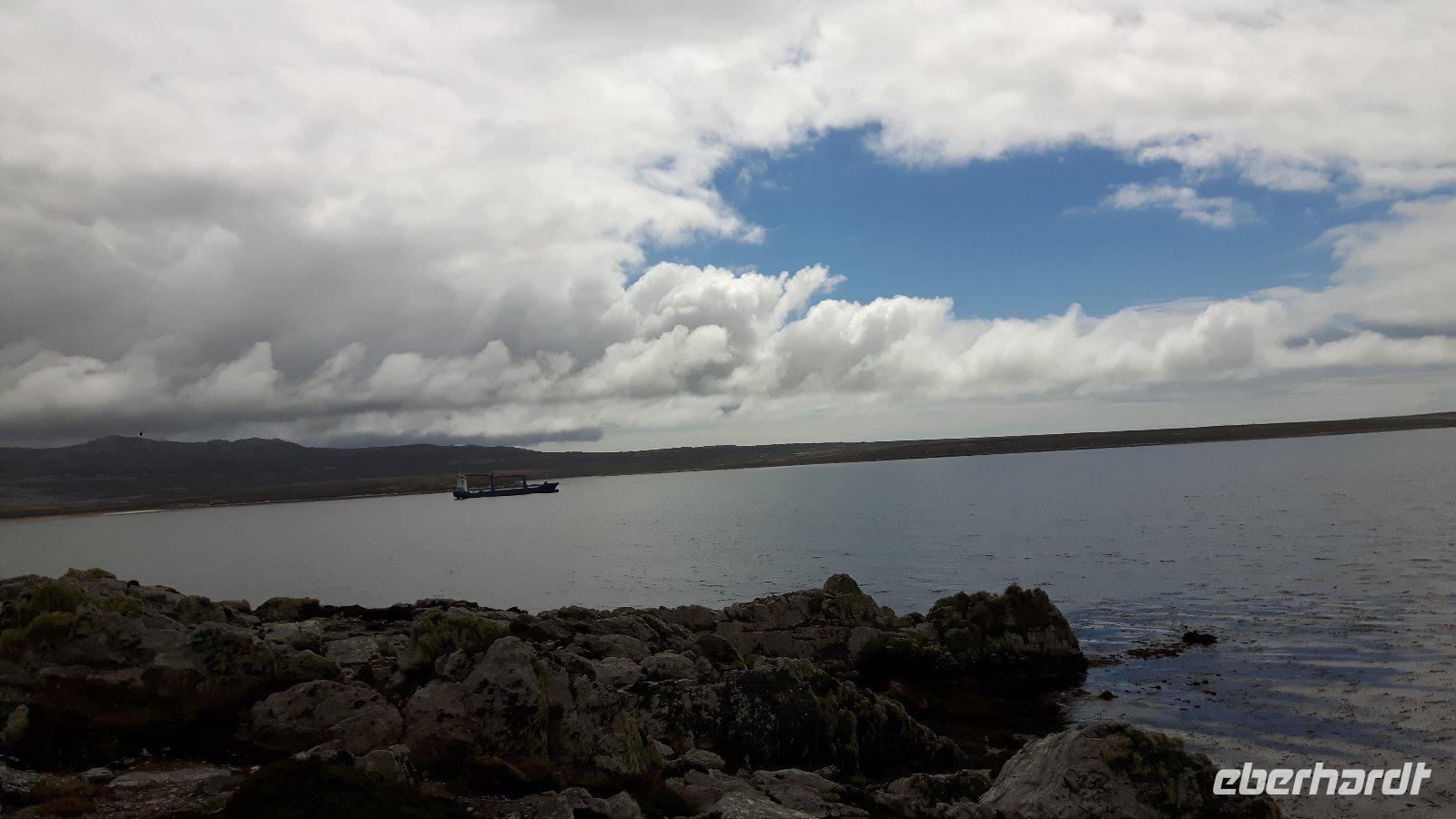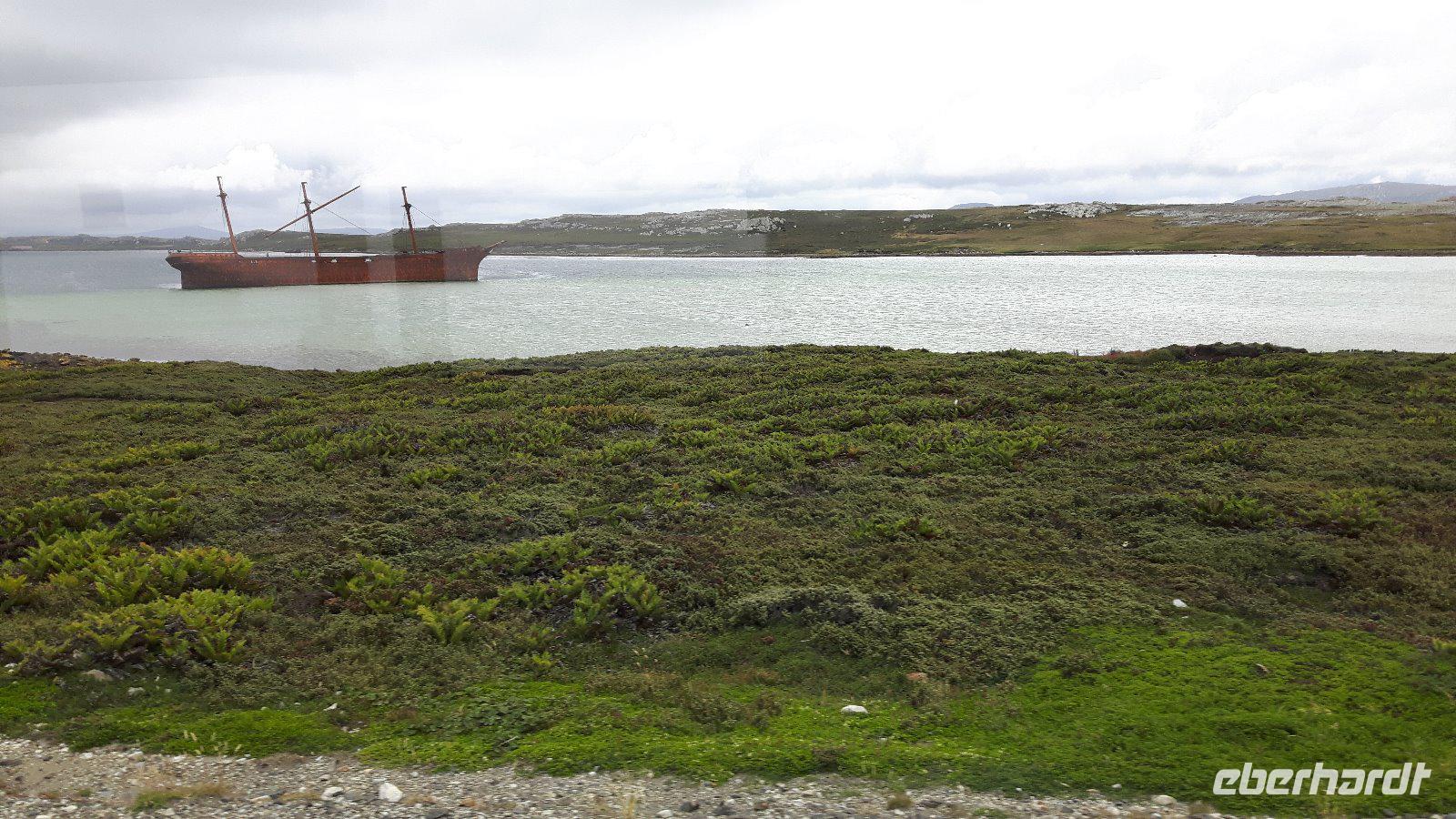 Wir ankern vor der Hauptstadt Stanley in einer schönen, geschützt gelegenen Bucht und lassen uns wieder von Tenderbooten an Land bringen. Wir verzichten heute auf einen örtlichen Guide und erkunden Falkland als Eberhardt Reisegruppe im Alleingang.