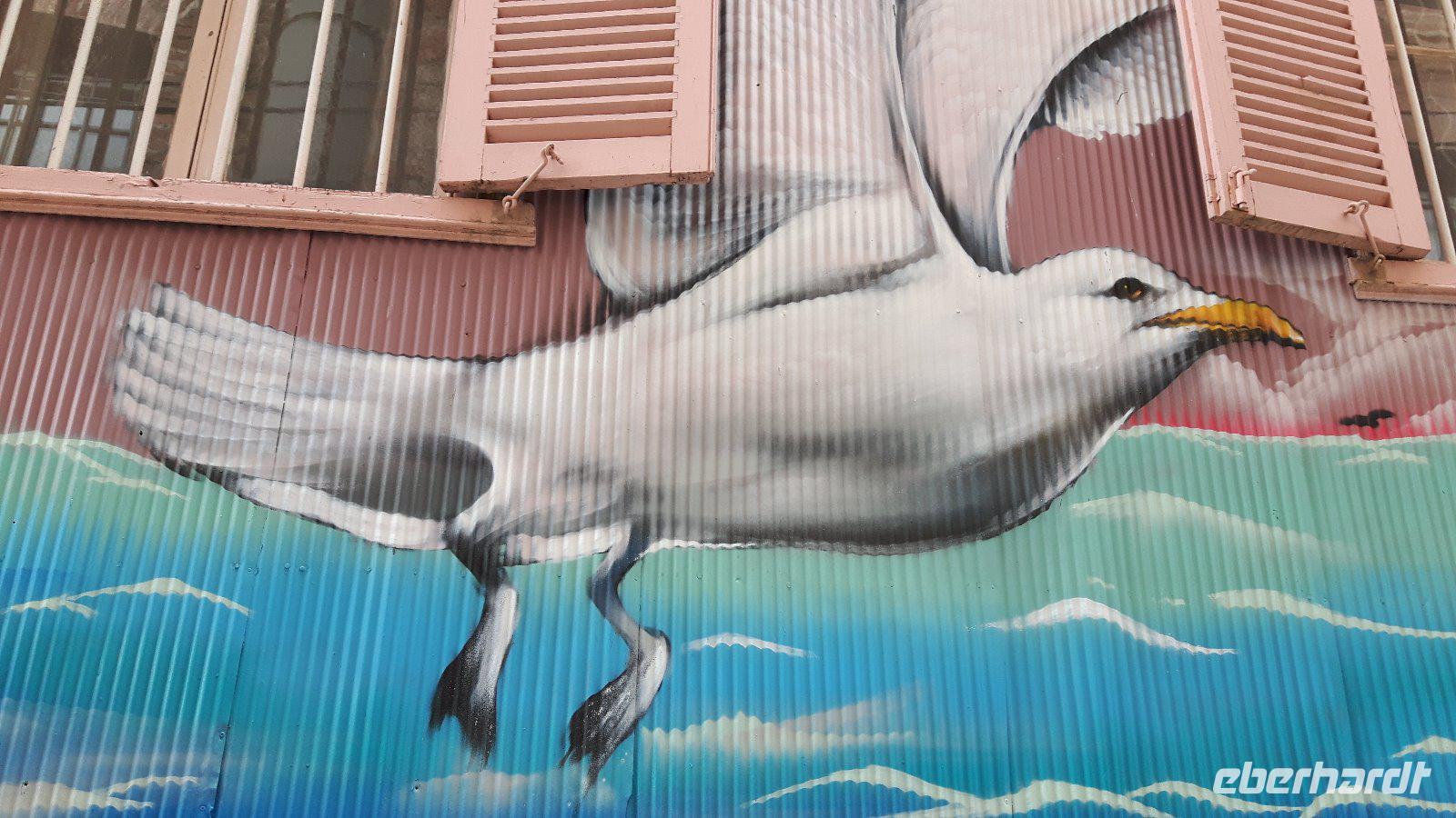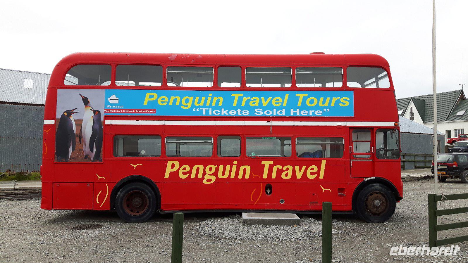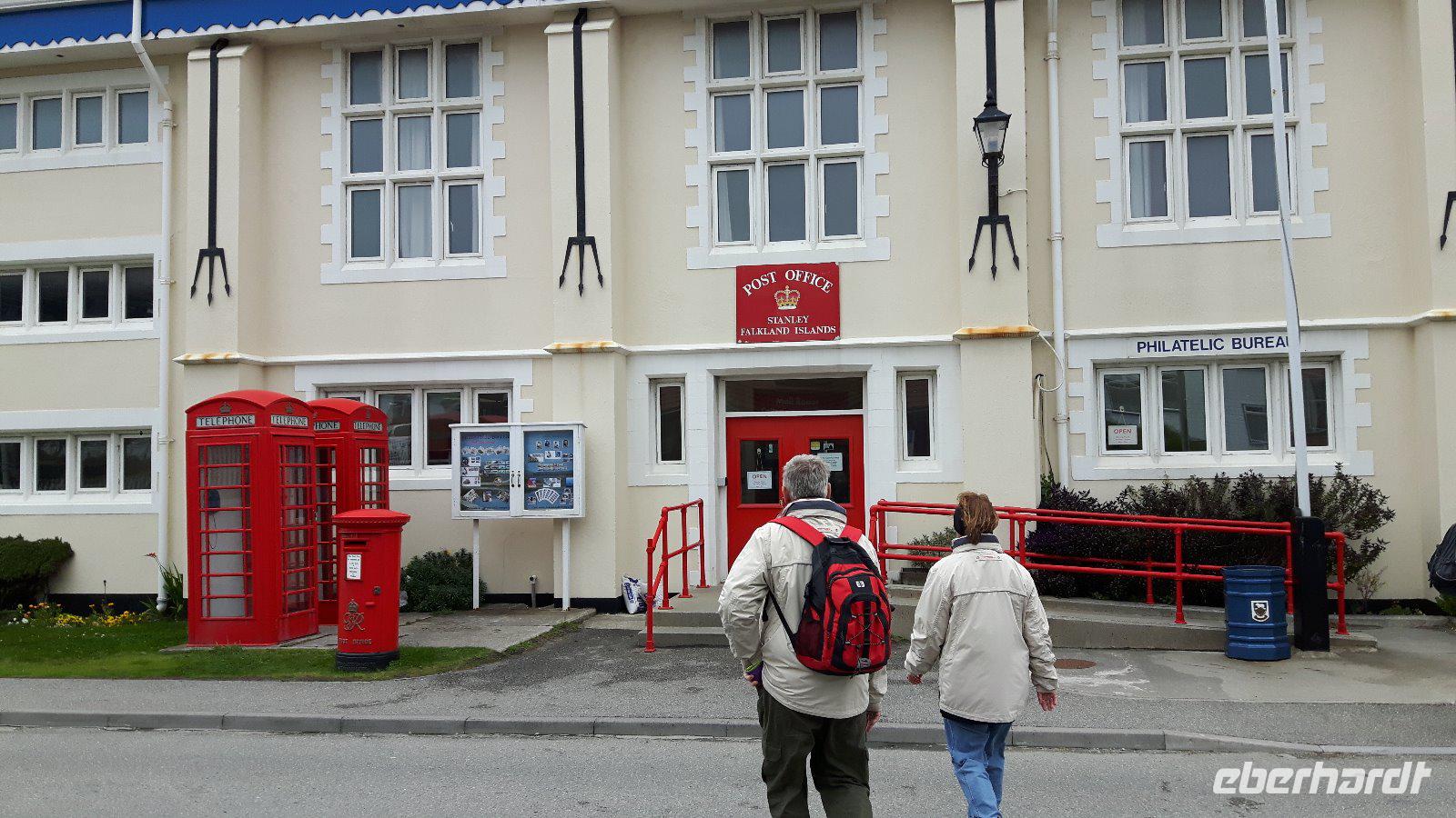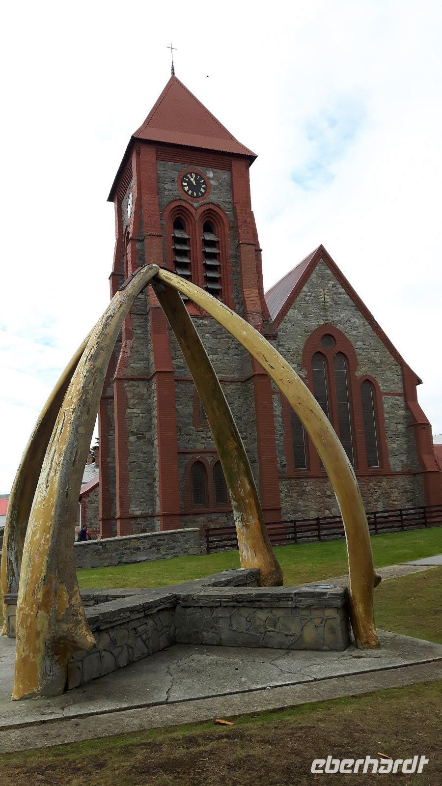 Nachdem uns der Bus wieder am Hafen abgesetzt hat beginnen wir unseren Stadtrundgang; Christ Church Cathedral, die südlichste anglikanische Kathedrale der Welt, eine Konstruktion aus großen Steinen sowie rotem Wellblechdach ist der erste Punkt. Direkt daneben der als Denkmal errichtete Bogen aus Walknochen; 1933 aus den Kieferknochen zweier Blauwale gebaut, um der britischen Besatzung zu gedenken. Vorbei geht es am Regierungsgebäude; 1845 erbaut, stellt es seitdem den offiziellen Regierungssitz des von London eingesetzten Gouverneurs dar. Wir passieren die Poststation der Falklandinsel, wo schnell ein paar Grüße von diesem entlegenen Zipfel der Welt nach Hause gesandt werden.