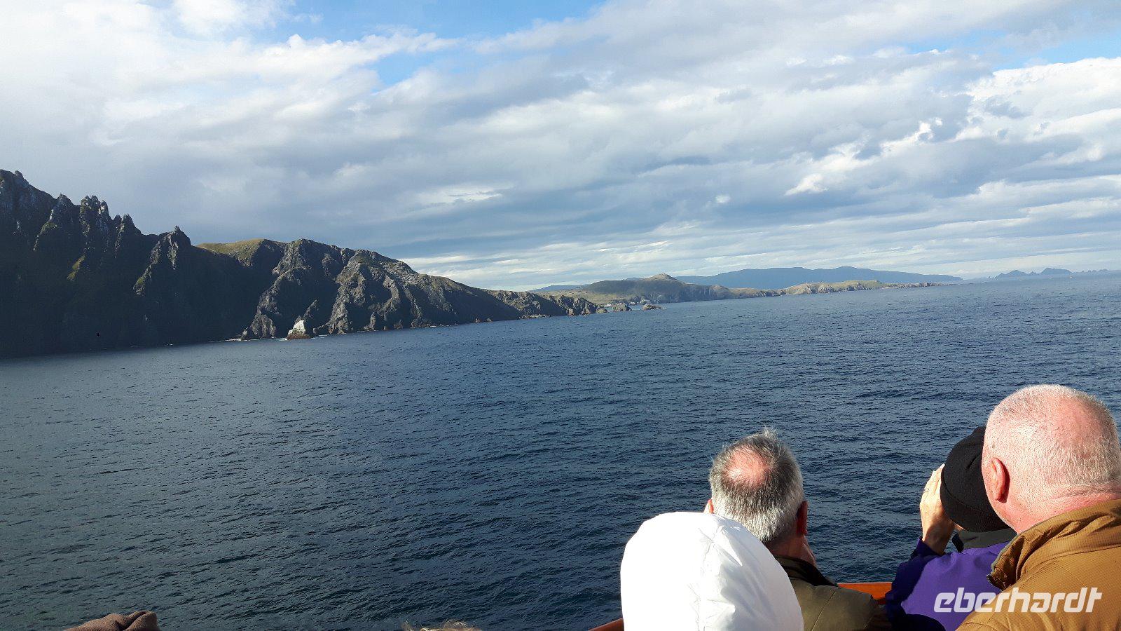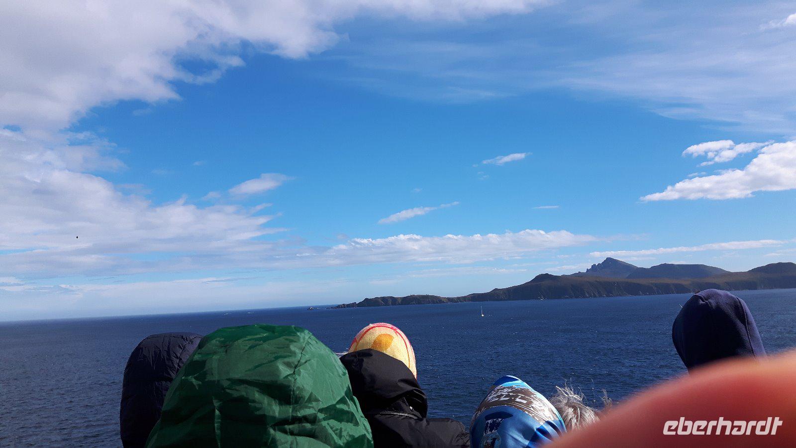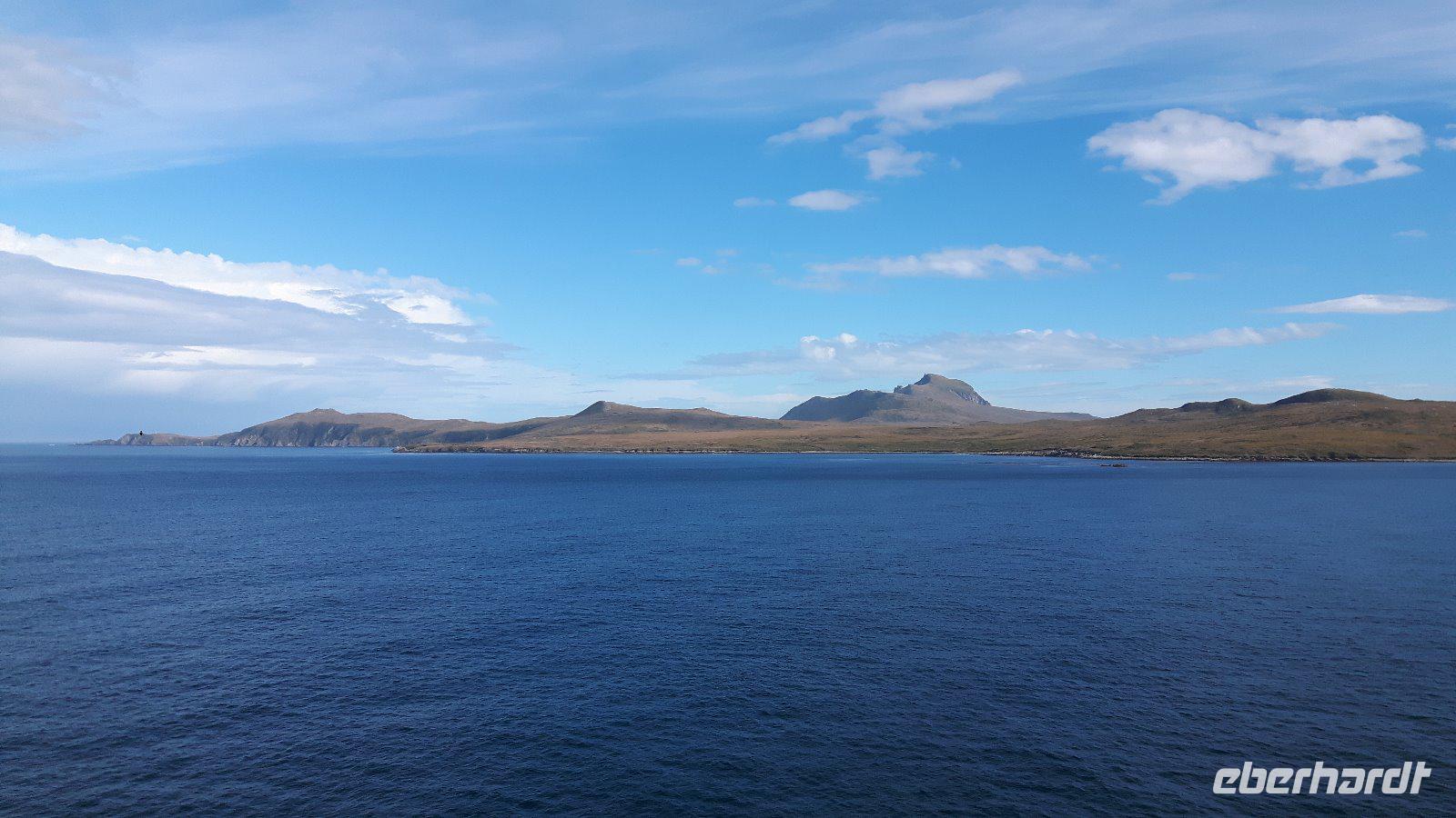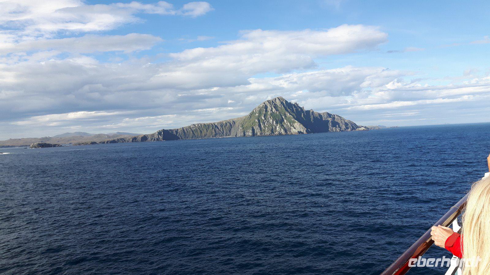 Wir können bestens damit leben, dass sich das Wetter heute ganz und gar untypisch präsentiert; ruhige und strahlender Sonnenschein und damit beste Sicht, nicht vielen Besuchern des Kaps ist dieses Bild vergönnt. Das Schiff umfährt die Isla Hornos und wir sehen von weitem den Leuchtturm, der auf der höchsten Erhebung der Insel steht.