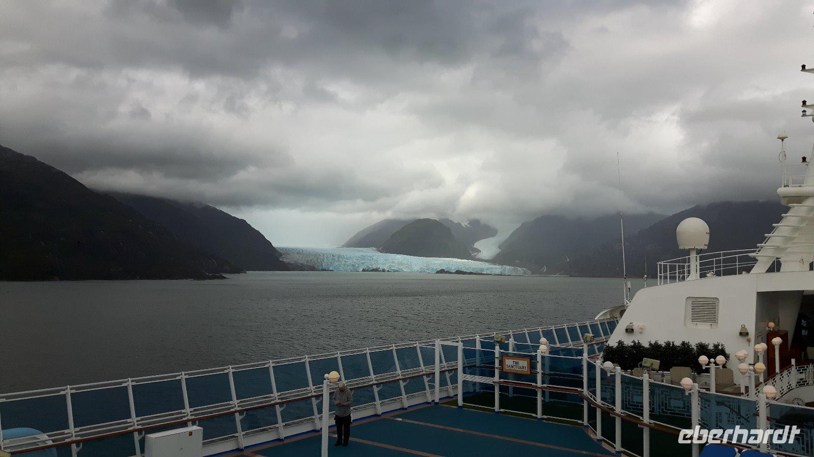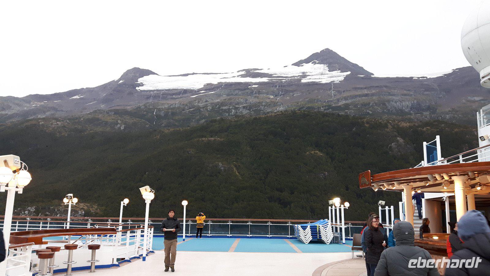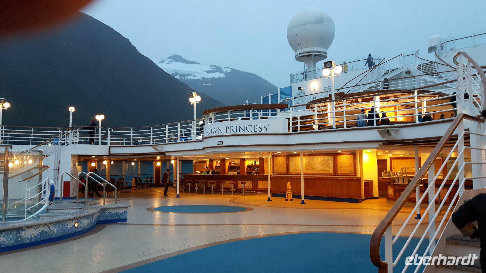 Am zeitigen Abend legt die „Crown Princess" wieder ab, gerade zeitig genug, dass man nach einem entspannten Abendmenü auf dem Oberdeck die „Gletscherallee", eine Folge imposanter Gletscher bestaunen kann.