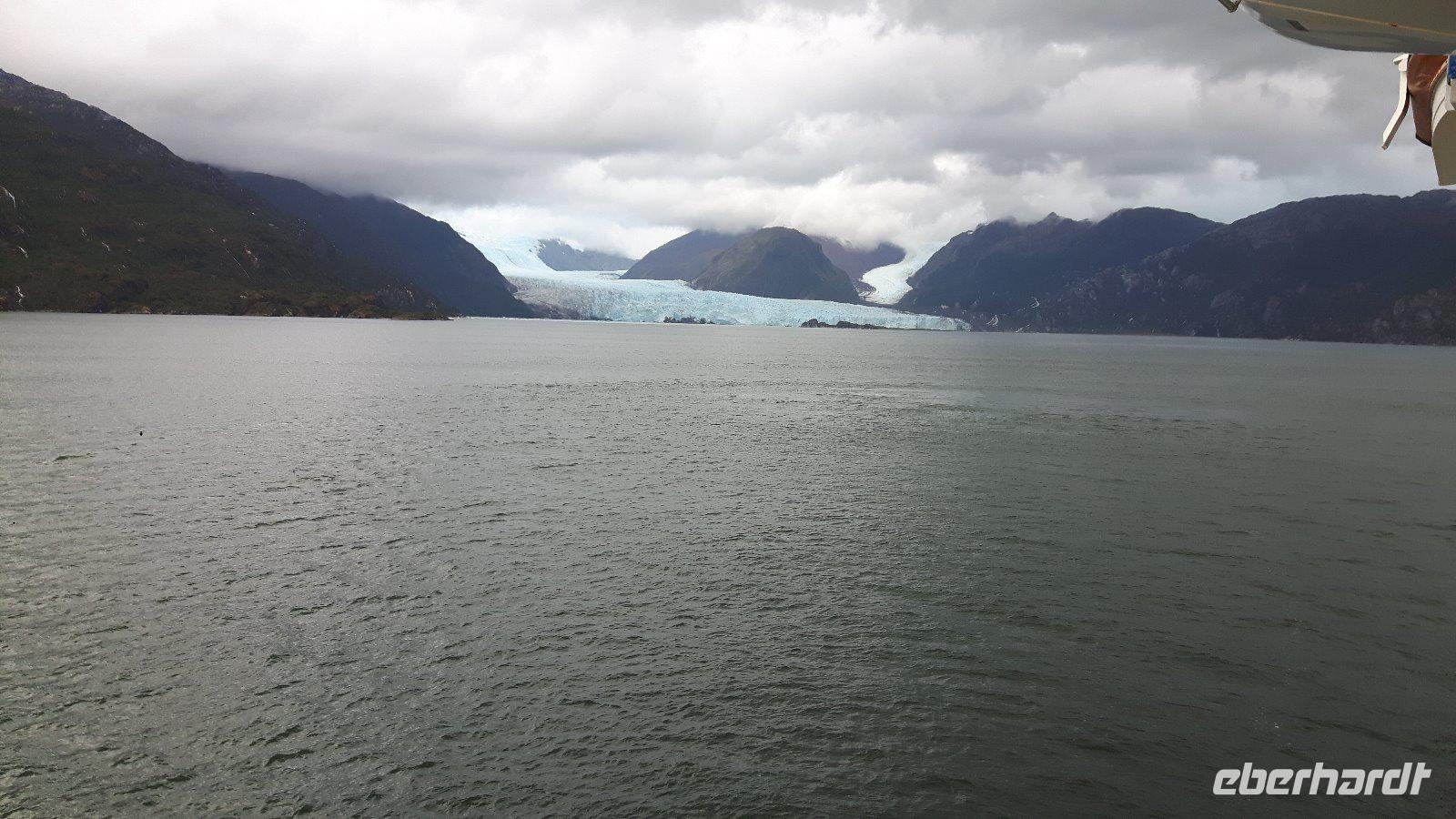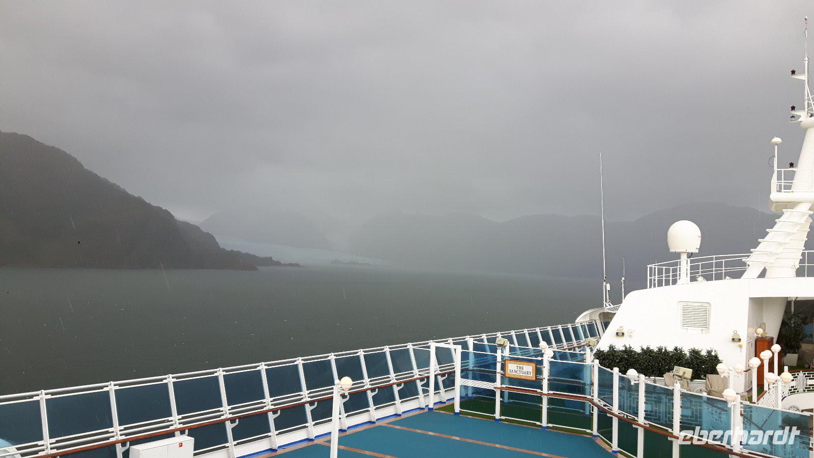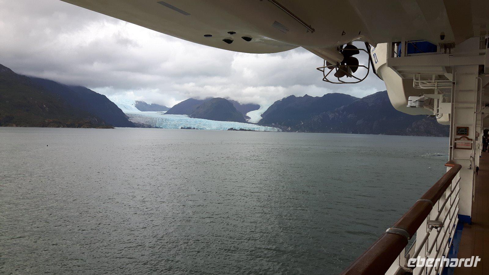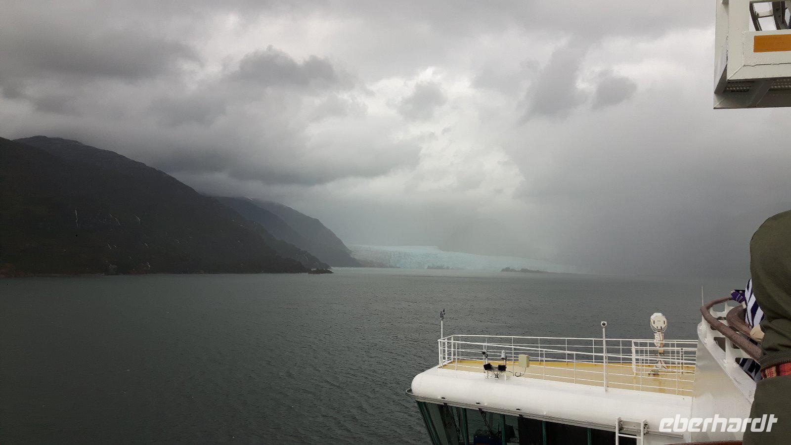 Der Stille Ozean wird heute hier an seinem südöstlichen Ende der Bezeichnung „Stiller Ozean" nicht gerecht. Am Nachmittag passieren wir den Amalia-Gletscher, der sich inmitten einer einsamen Region von schneebedeckten Gipfeln und endlosen Wäldern befindet. Es regnet und ist kalt; die Sicht sehr schlecht. Doch kaum hat sich unser Schiff vor dem Gletscher positioniert zieht ein Regenbogen auf, die Sonne bricht durch und die Sicht auf die Eismassen ist frei.