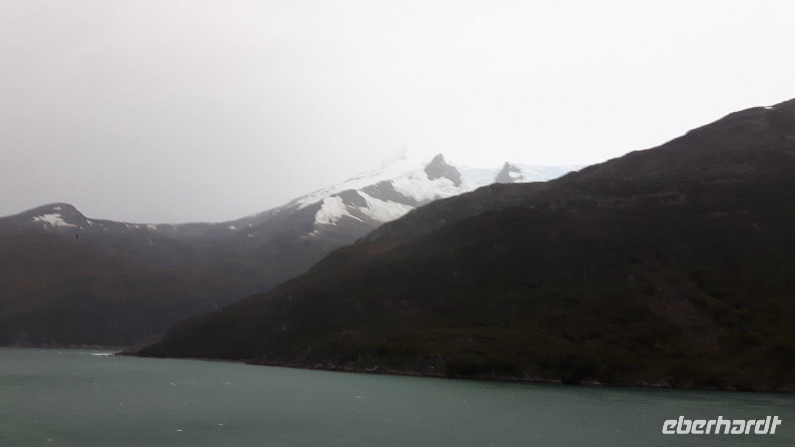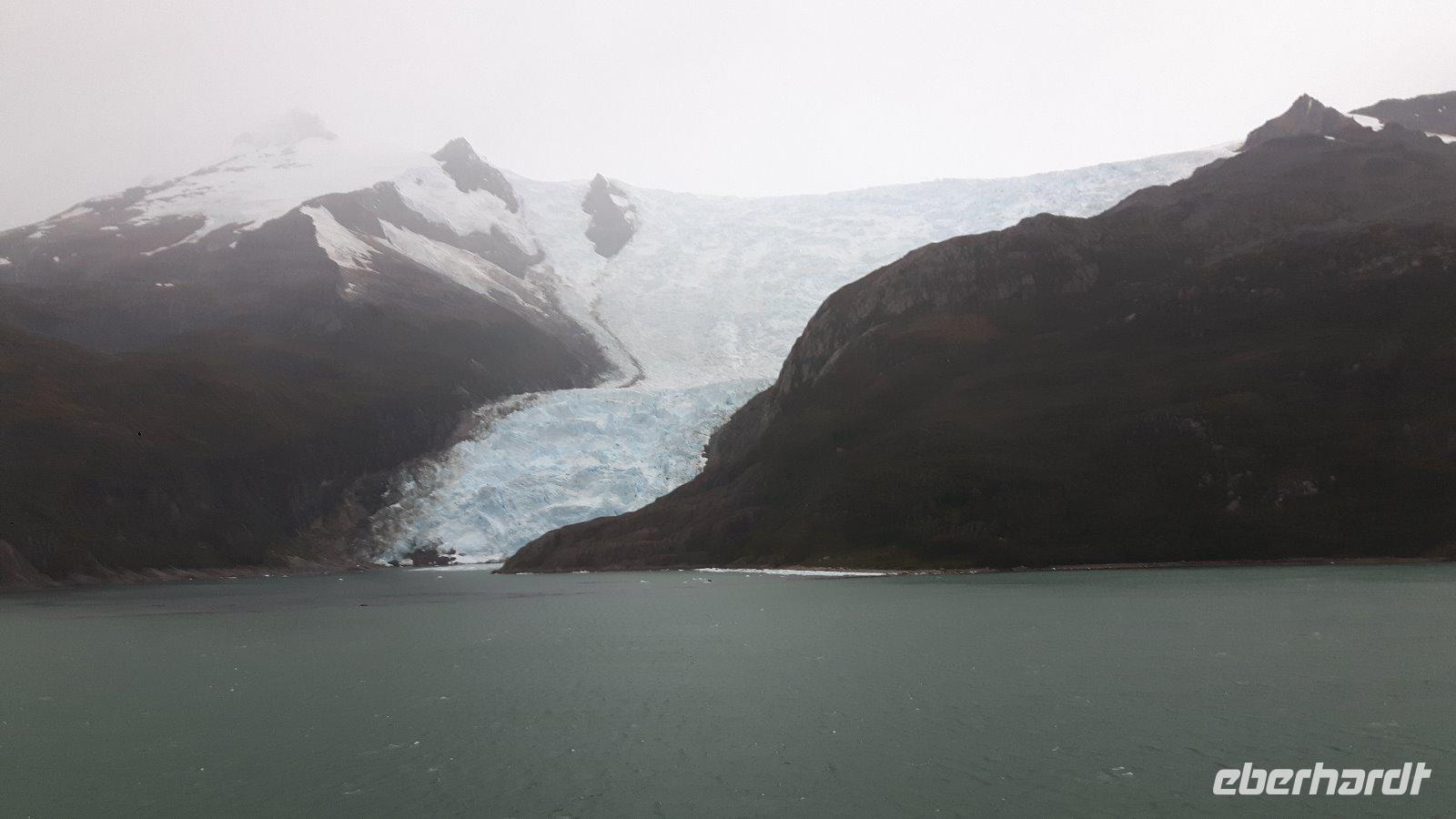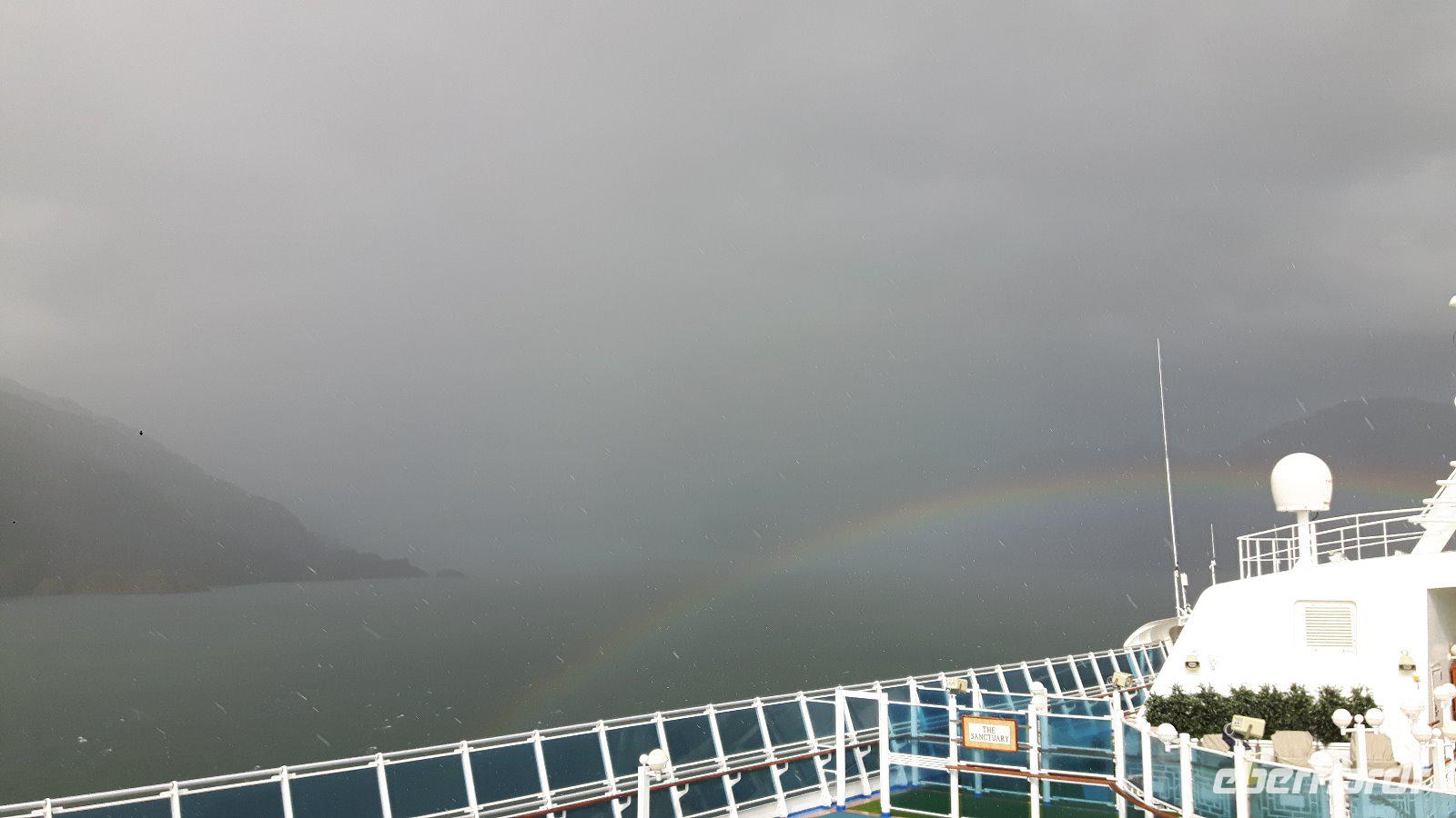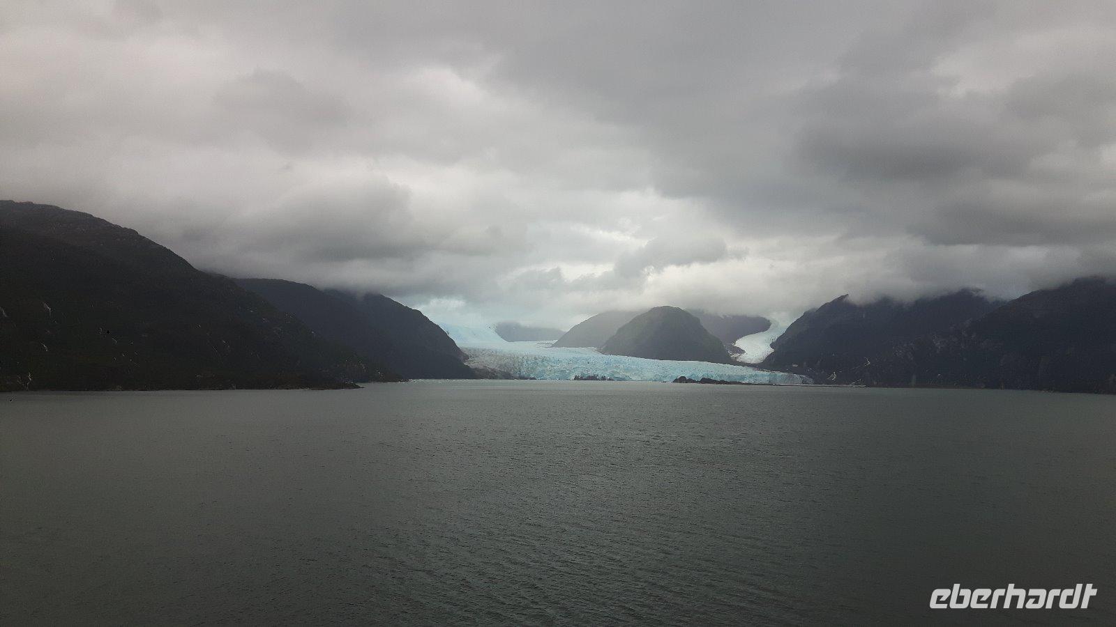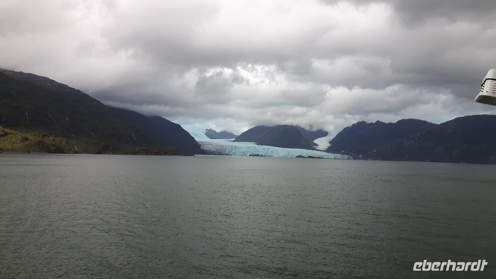 Der Stille Ozean wird heute hier an seinem südöstlichen Ende der Bezeichnung „Stiller Ozean" nicht gerecht. Am Nachmittag passieren wir den Amalia-Gletscher, der sich inmitten einer einsamen Region von schneebedeckten Gipfeln und endlosen Wäldern befindet. Es regnet und ist kalt; die Sicht sehr schlecht. Doch kaum hat sich unser Schiff vor dem Gletscher positioniert zieht ein Regenbogen auf, die Sonne bricht durch und die Sicht auf die Eismassen ist frei.