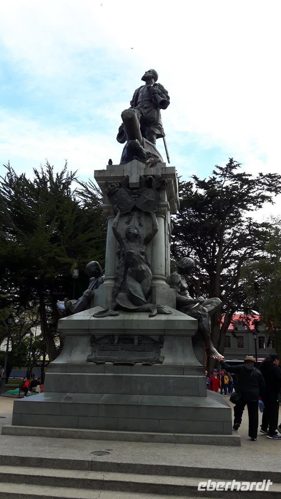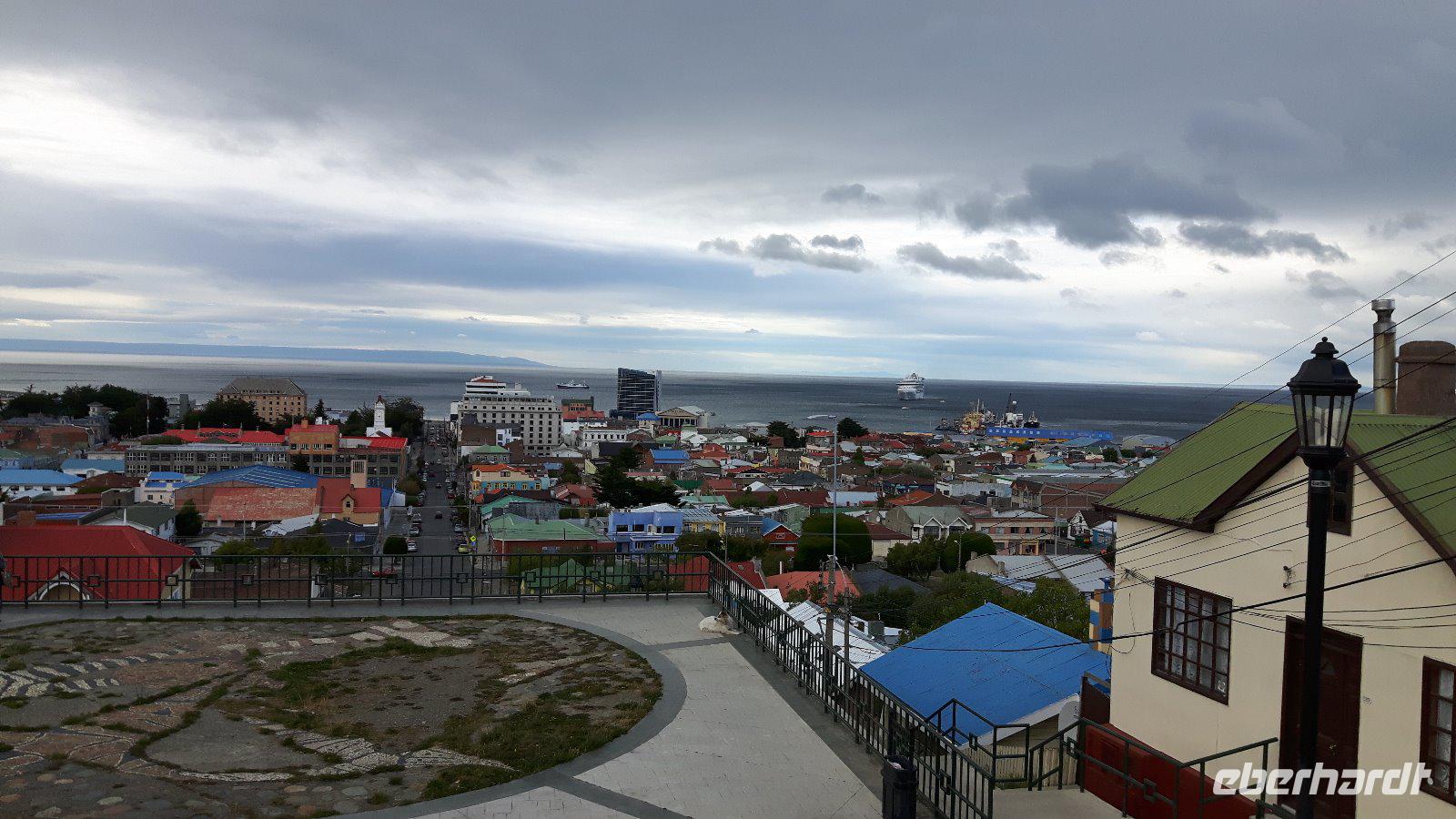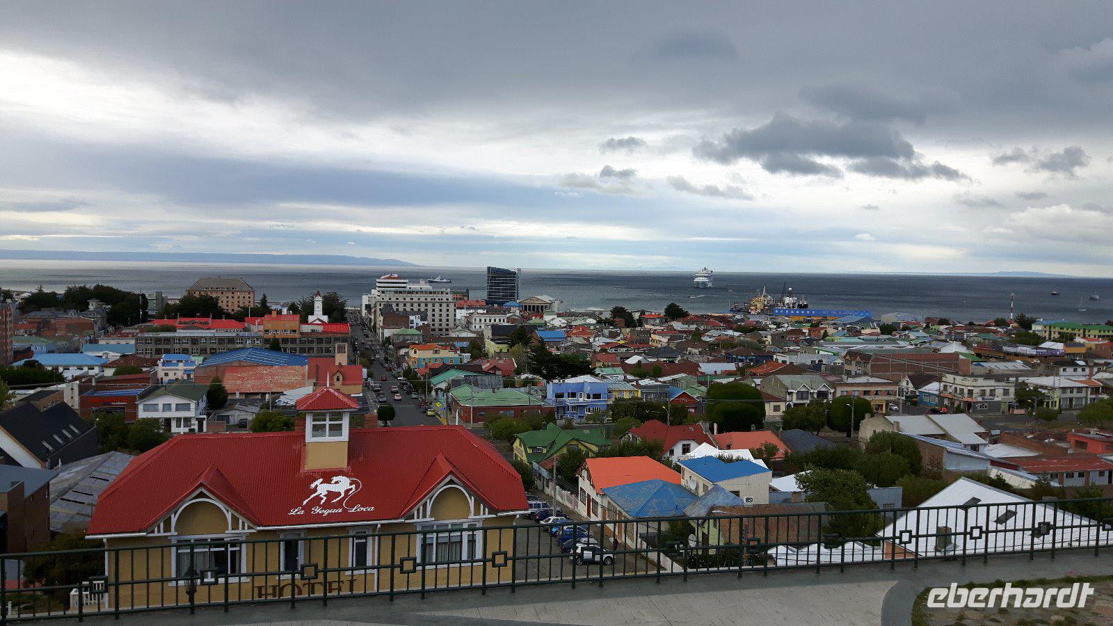 Vom Aussichtspunkt Cerro La Cruz blicken wir auf die bunt gestrichenen Häuser der Stadt mit der Magellanstraße im Hintergrund, welche einst das Ende der Welt markierte. Auf der prunkvollen Plaza ist das Denkmal Magellan Denkmal Blickfang, die Bebauung ringsherum wiederum zeugt vom ehemaligen Reichtum der Stadt bzw. ihrer „Schafbarone".