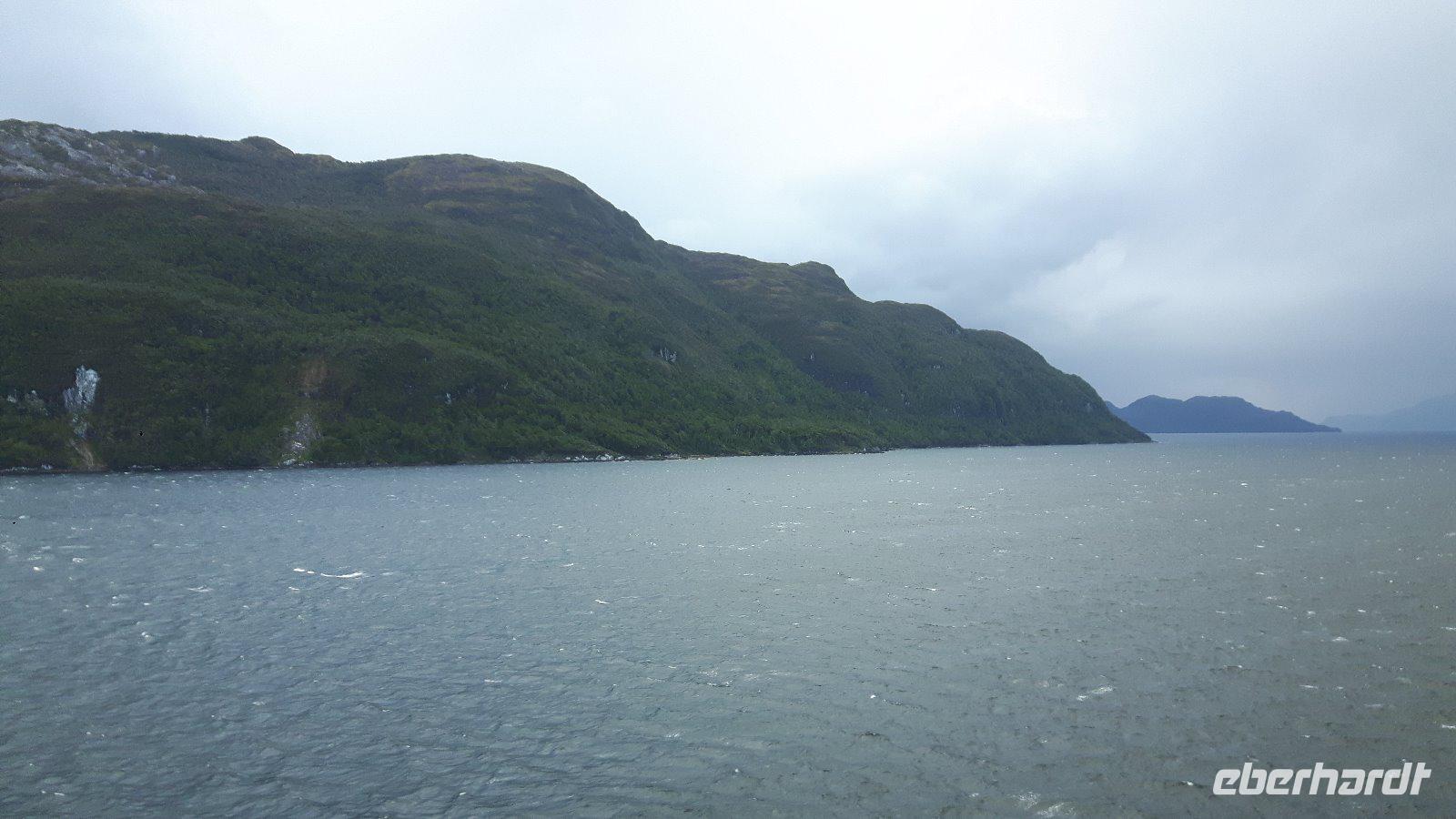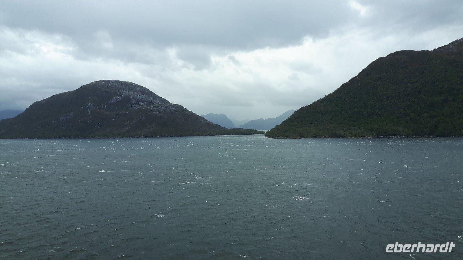 Die Ausfahrt aus der Magellanstraße in den Pazifik geht mit stärkerem Seegang einher.