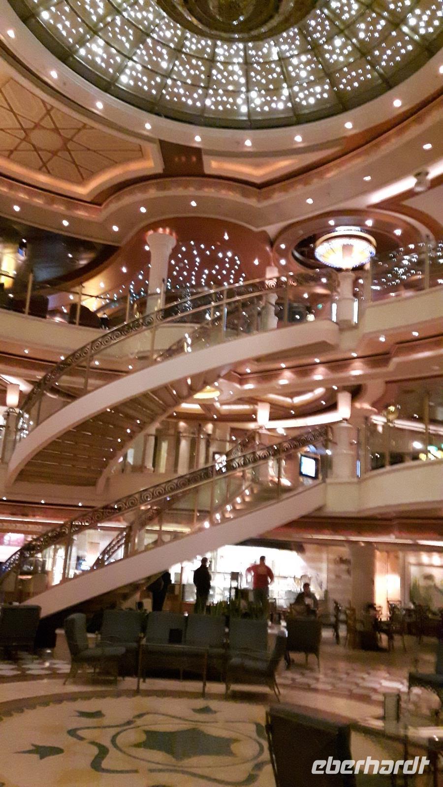Eberhardt Travel hat im Vorfeld entsprechend Tische in einem der Dining-Rooms für ein stilvolles gemeinsames tägliches Abendessen mit Bedienung durch rührige Kellner reserviert. So lassen wir es uns dann bei einem ersten exzellenten Wahlmenü gutgehen. Wir beschließen den Tag mit einem gemeinsamen Rundgang über das Schiff, machen uns so mit den wichtigsten Restaurants und Unterhaltungsbereichen vertraut.