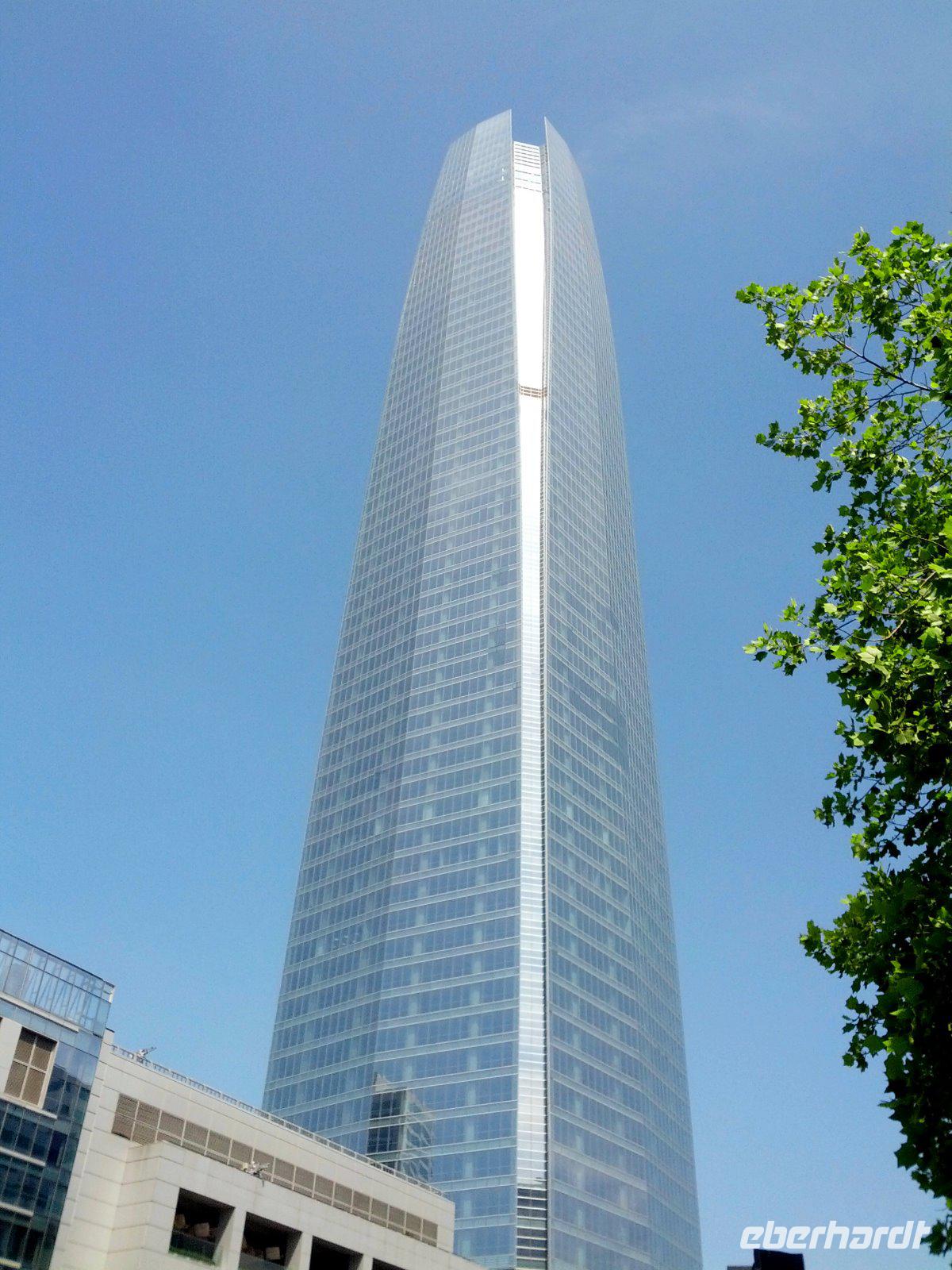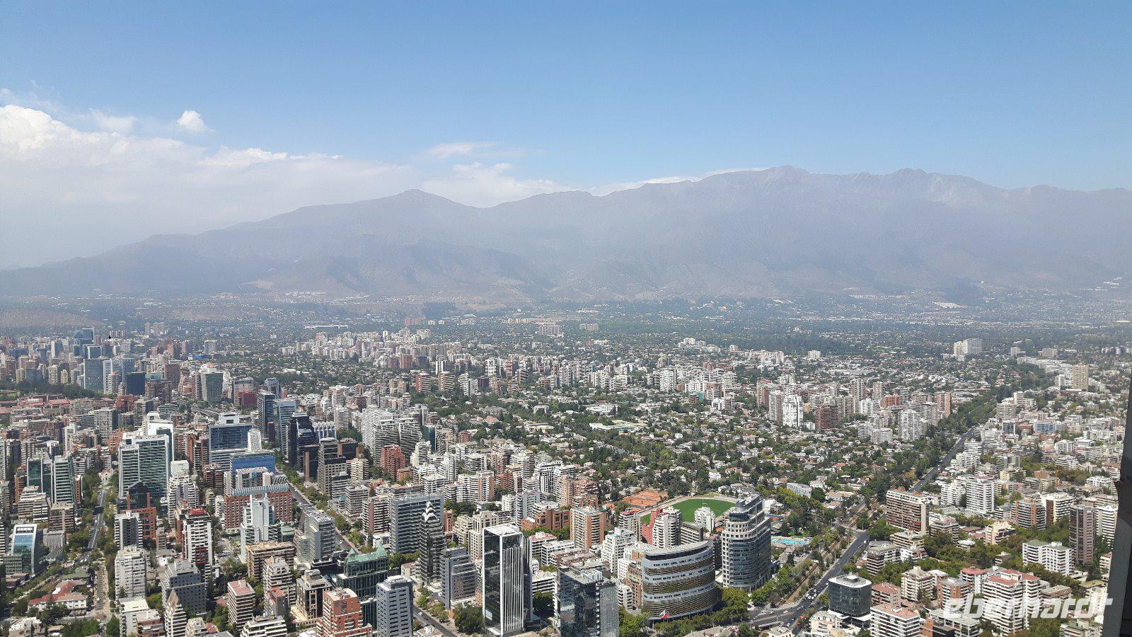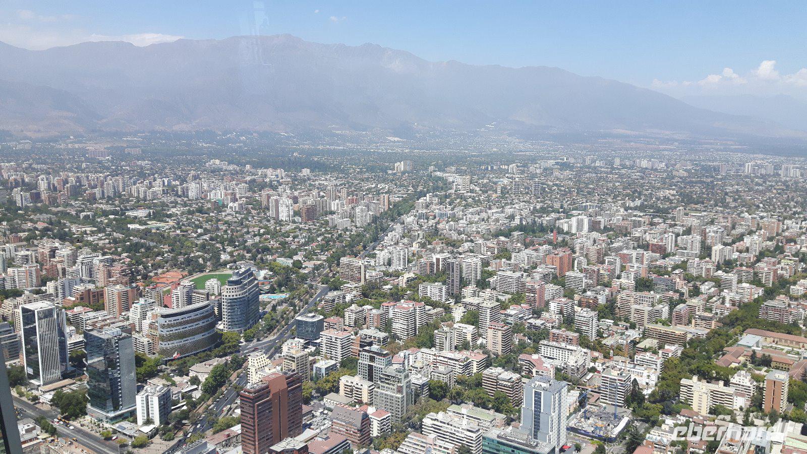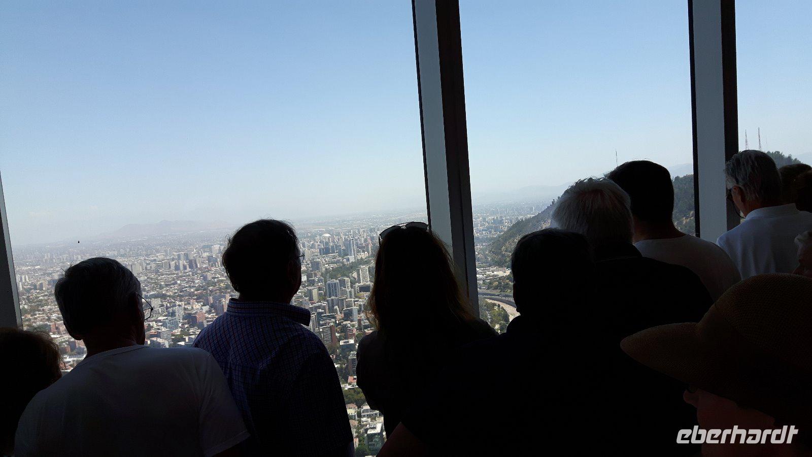Genügend Zeit für die Auffahrt zum Gran Torre Santiago, dem mit 300 Metern höchstem Gebäude in ganz Südamerika. Die Aussicht ist entsprechend überwältigend; ganz Santiago sowie das Umland liegen uns zu Füßen.