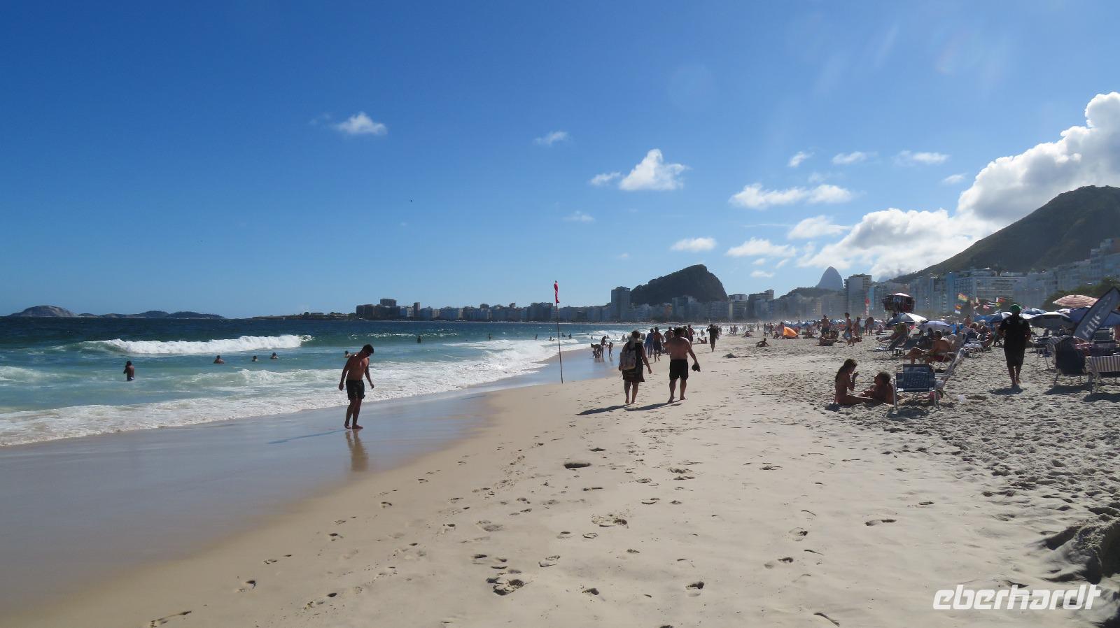 Nachdem wir gestern erfahren haben, dass der Wettergott keine SMS mehr empfängt, sondern auch schon auf WhatsApp umgestiegen ist, klappt es auch mit der Bestellung. Der Himmel über uns ist blau und so starten wir mit hohen Erwartungen in den Tag. Das Programm versprach aber auch einiges, Zuckerhut, Cocovado, plantschen und Sandburgen bauen an der berühmten Copacabana. Da springt das Reiseherz doch doppelt so hoch. Um auf den Cocovado zu kommen, nutzen wir die Zahnradbahn. Diese bringt uns gemütlich die 3,7 Kilometer lange Strecke zunächst nach oben und man kann schon während der Fahrt erahnen, was es gleich für einen herrlichen Ausblick geben wird. Von dem 710 Meter hohen Berg gibt es einen sagenhaften Blick und man bekommt hierbei einen sehr guten Einblick über die Stadt. Von hier oben erscheint die Stadt sehr grün und hügelig und man fragt sich, wo eigentlich die vielen Einwohner leben. Nachdem wir der riesigen 38 Meter hohen Christusstatue Adios gesagt haben, geht es weiter zum nächsten Höhepunkt, dem Zuckerhut. Um auf den Gipfel zu stehen, nutzten wir die Seilbahn gleich doppelt. Die zweite Seilbahn bringt uns auf knapp 440 Metern und von hier sehen wir die Stadtteile Ipanema, Leblon und die Copacabana. Der Nachmittag steht zu freien Verfügung und die meisten machen einen Abstecher an den Strand. Dieser ist wunderschön und hat ein ganz eigenes Flair. Wenn man dazu noch einen Maracuja Cocktail trinkt, die Füße in den warmen Sand steckt und die Sonne von oben lacht, dann möchte man nie mehr von hier fort. Aber um das Abendessen nicht zu verpassen, müssen irgendwann die Füße wieder ausgegraben werden. Nach dem Abendessen versammelt sich der größte Teil der Gruppe auf der Dachterrasse, um nochmal das Glas zu erheben und sich gedanklich von Rio zu verabschieden.