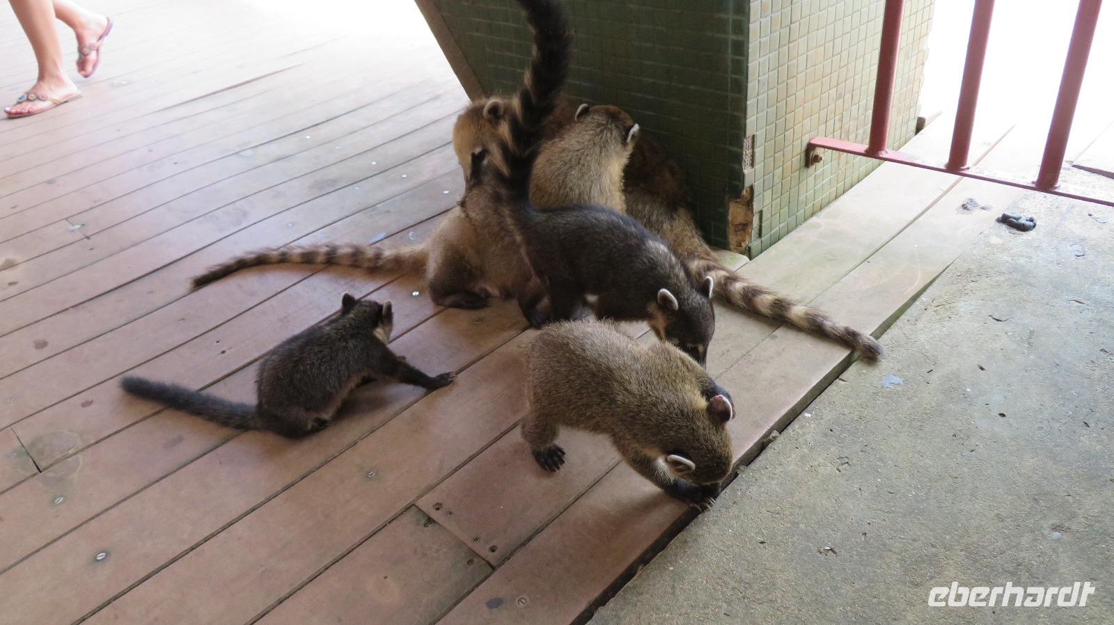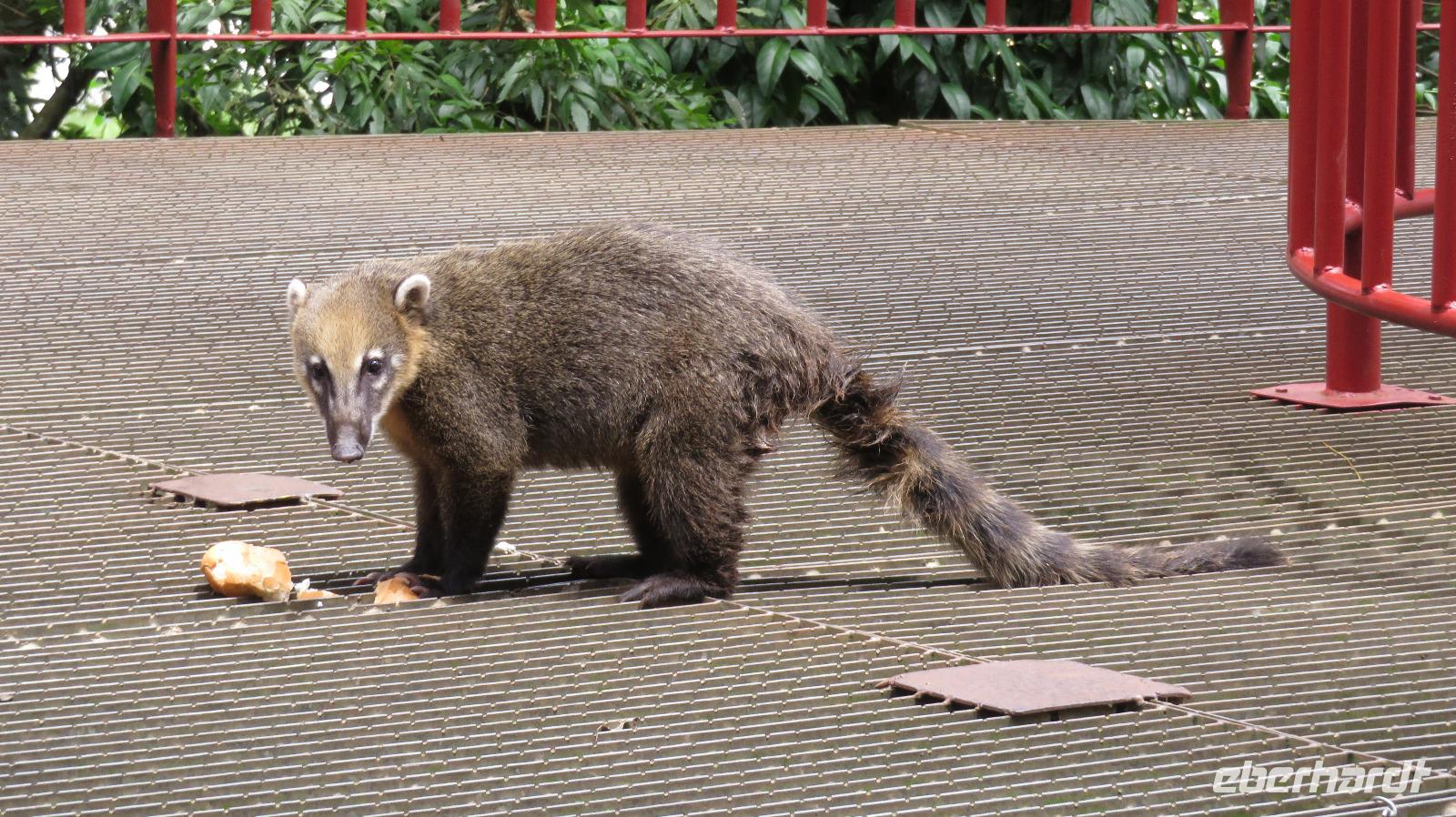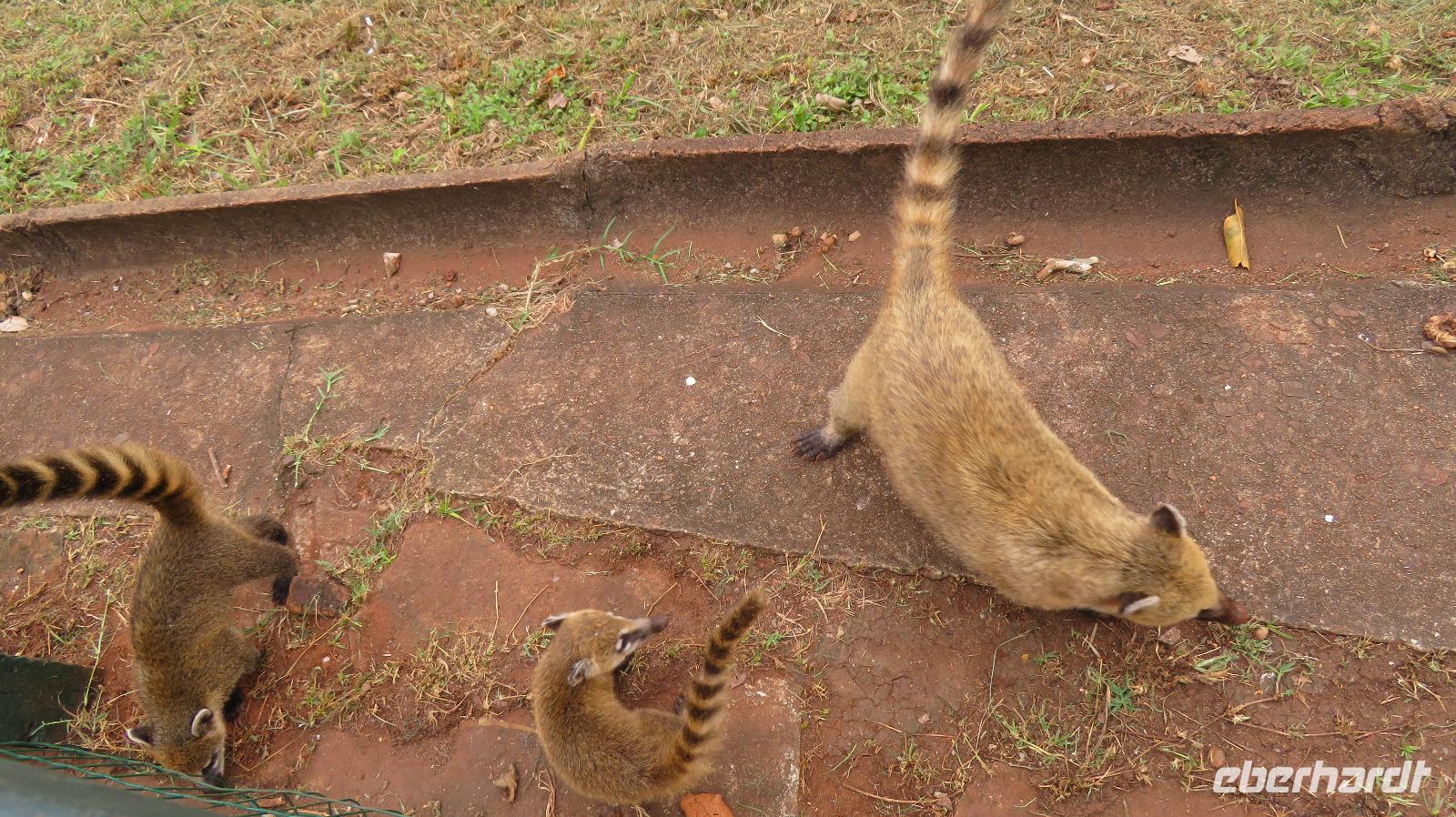 Am frühen Morgen hieß es leider schon Abschied zu nehmen. Wir verließen die Stadt mit einem lachenden und einem weinenden Auge. Zum einen, weil wir gerne nochmal einen Tag in die Stadt eingetaucht wären und am Nachmittag nochmal die Copacabana unsicher gemacht hätten, aber zum anderen, freuten wir uns auch auf die Wasserfälle. Nach rund zwei Stunden Flug empfängt uns Maike und wir tauchten direkt in die Natur ein. Nach dem Trubel der Großstadt, heißt es hier Idylle und Natur satt. Wir fuhren direkt vom Flughafen zum Nationalpark. Hier angekommen, gab es erst einmal eine Stärkung und man merkte direkt, dass Wetter ist hier anders als in Rio. Nachdem wir noch ein kurzes Stück mit dem Bus unterwegs waren, empfingen uns direkt am Eingang die Nasenbären mit ihren kleinen Kindern. Man könnte sich gar nicht richtig entscheiden, ob man nun das erste Bild von den süßen kleinen Nasenbären oder von den Wasserfällen machen möchte. Wenig später ist es aber ganz klar, die Wasserfälle haben gewonnen. Diese gehören neben den Niagara Fällen und den Victoria Fällen zu den größten Wasserfällen der Welt. Insgesamt erstrecken sich die durchschnittlichen 275 Wasserfälle auf 3 km Länge. Am imposantesten ist die Teufelsschlucht am Ende des Weges. Hier bekommt man ein wenig das Gefühl vermittelt, wie viel Wassermassen hier nach unten sausen. Obendrauf gab es noch eine Dusche Gratis. ? Am Nachmittag lassen wir die Seele am Pool baumeln und sammeln diese dann am späten Abend wieder ein, um das Abendessen im Hotel zu genießen.