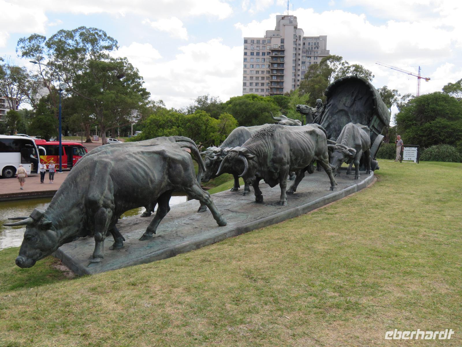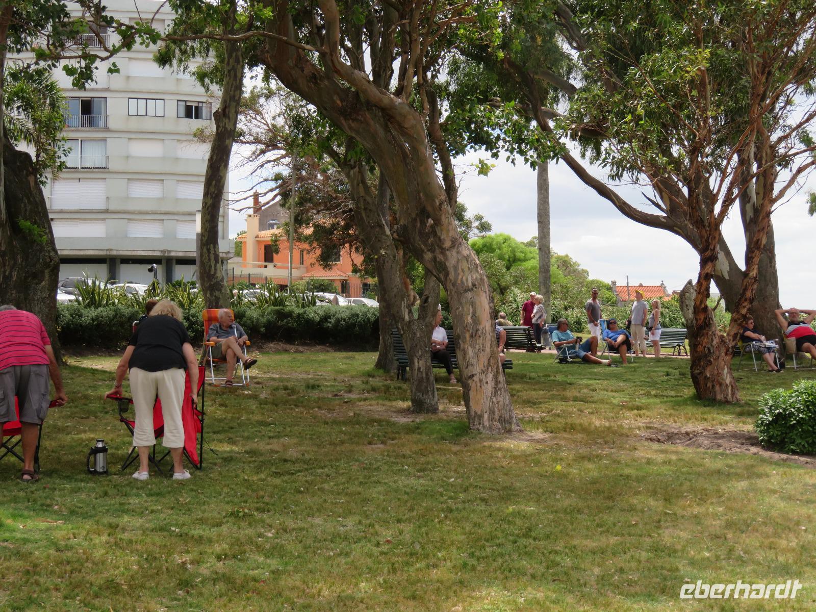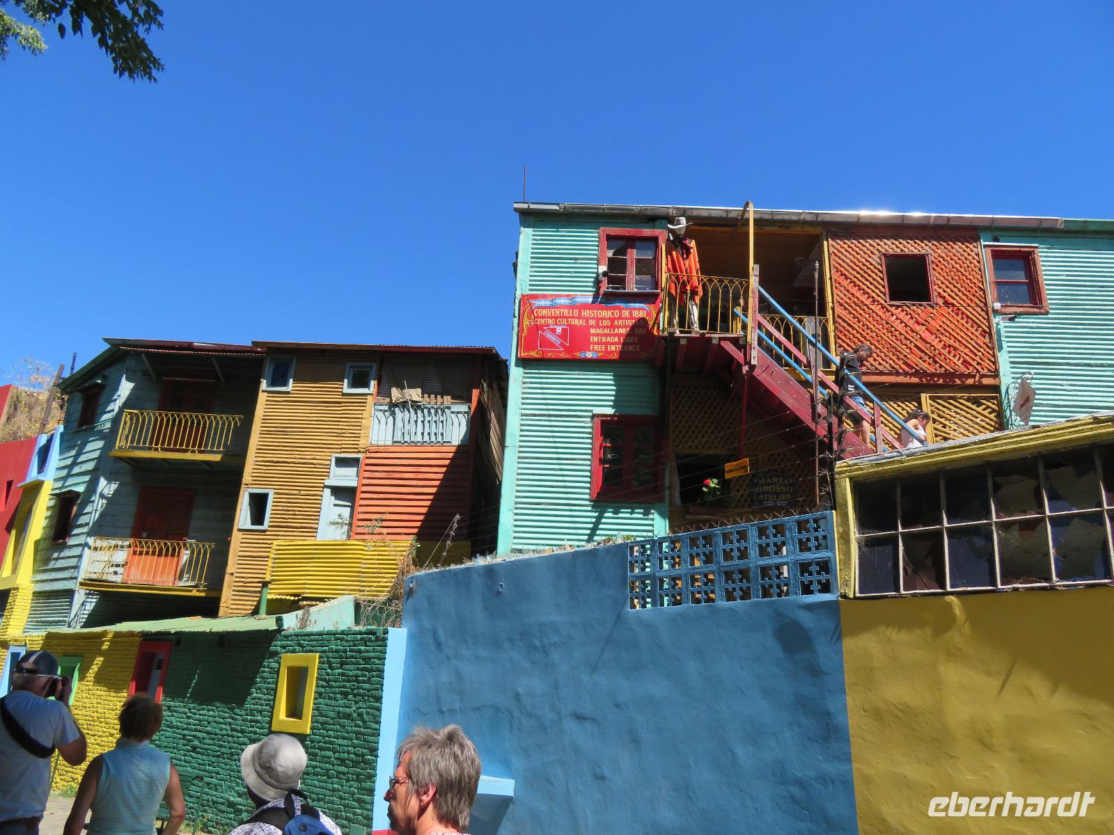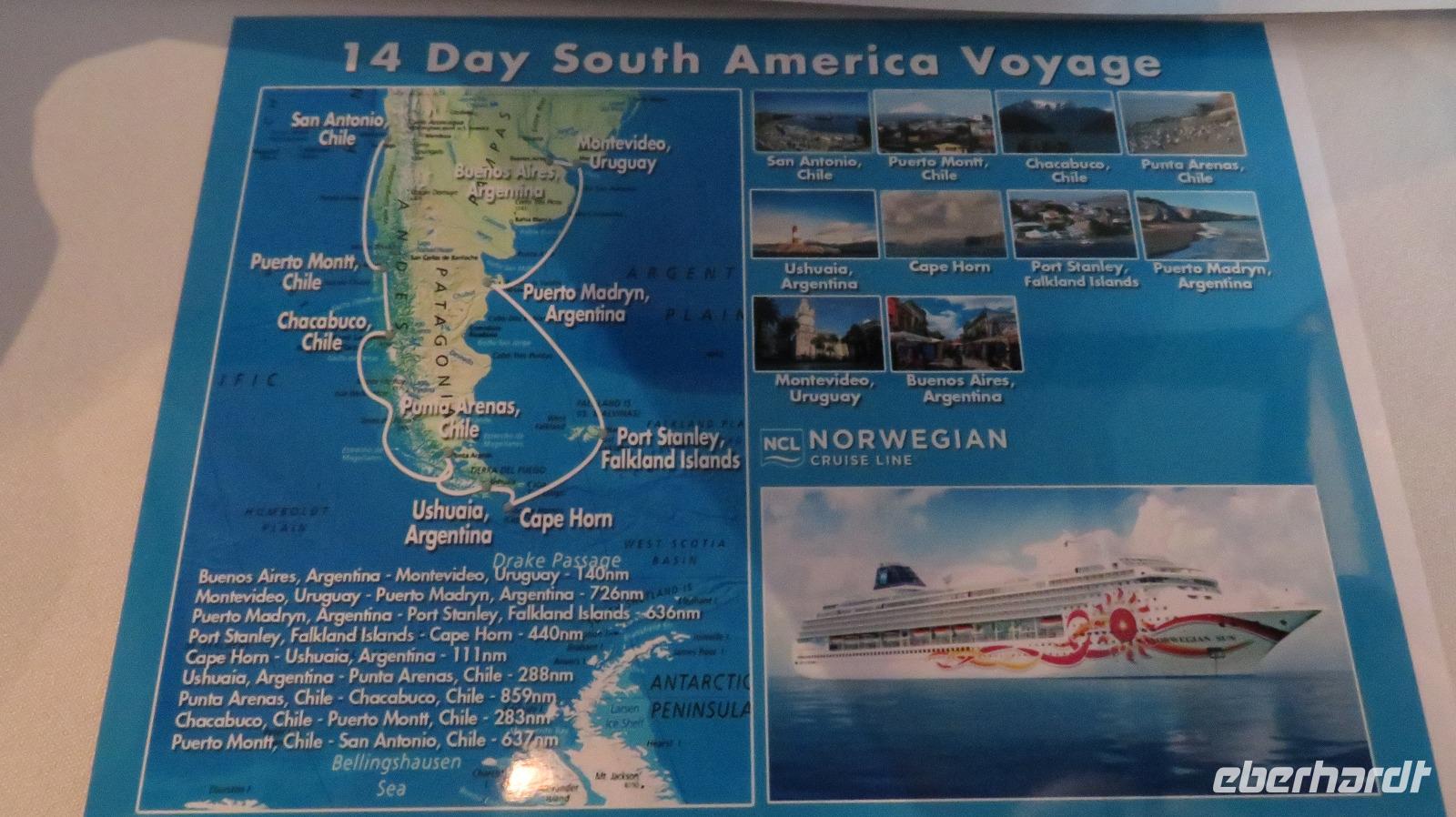 Guten Morgen Buenos Aires. Nachdem wir gestern schon einen kleinen Eindruck in der Nacht bekommen hatten, schauen wir uns heute mal die Stadt bei herrlichem Sonnenschein an. Wir besichtigen unter anderem die Floralis Generica, bummeln durch den Rosengarten Paseo del Rosedal und beobachten die vielen Sportler, die heute unterwegs sind. Im Anschluss daran fahren wir zum Friedhof La Recoleta, wo sich das Mausoleum der Familie Duarte und ebenso das Grab von Eva Peron befinden. Hier trafen wir auf die andere Eberhardt Reisegruppe, die gerade vom Schiff gestiegen ist und erhielten den einen oder anderen nützlichen Tipp. Nachdem wir gehört haben, dass das Essen auf dem Schiff vorzüglich ist, bekommen wir auch Hunger und so folgten wir dem Tipp unserer Mariel und gingen ins Restaurant Desnivel. Ein urigeres Restaurant hätten wir nicht wählen können und nachdem wir den Grill mit den riesigen Steaks gesehen haben, wussten wir, hier sind wir richtig. Anscheinend zählen die Steaks unter 400 Gramm in Argentinien als Aufschnitt und so teilen sich die meisten von uns das köstliche Fleisch. Mit einem zufriedenen Lächeln geht es zurück in die Sonne und wir besuchen noch das Stadtviertel La Boca und anschließend geht es endlich zu unserer neuen Heimat, der Norwegian Sun. Das Einschiffen geht sensationell schnell und so sind wir nach wenigen Minuten schon auf dem Schiff. Die erste Aktion auf dem Schiff nennt sich Rettungsübung. Hier wurde mir berichtet, dass die ersten Gäste bereits die Cocktailkarte studiert und getestet haben und ich war daher gleich stolz auf meine Reisegruppe. Zum Abendessen hatten wir Tische reserviert und so konnten wir einfach an der Schlange vorbei spazieren und uns an den eingedeckten Tisch setzten. Nach dem Abendessen konnte jeder das machen, worauf er Lust hatte. Die einen horchten, was das Bett zu sagen hat, die anderen besuchten das Theater oder schauten an den vielen Bars vorbei. Schließlich hatten wir Premium All Inklusive und diese Karte musste auch genutzt werden.