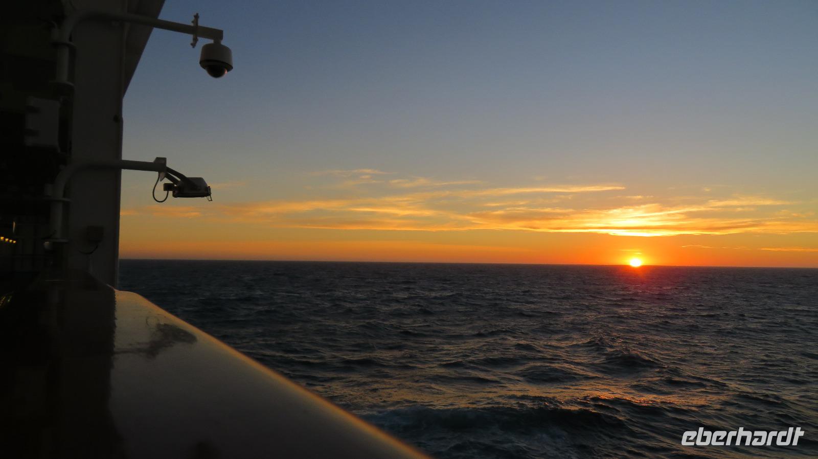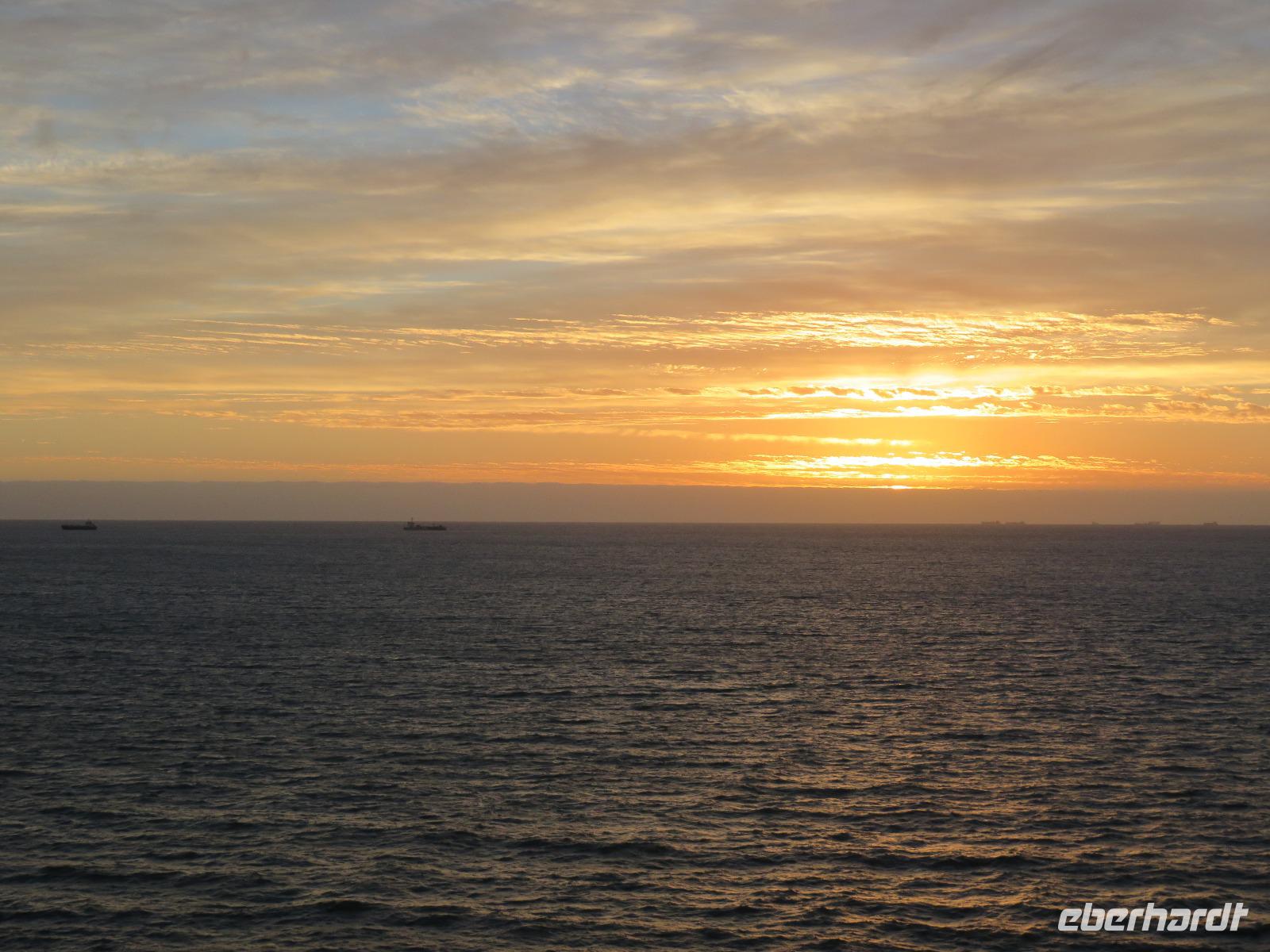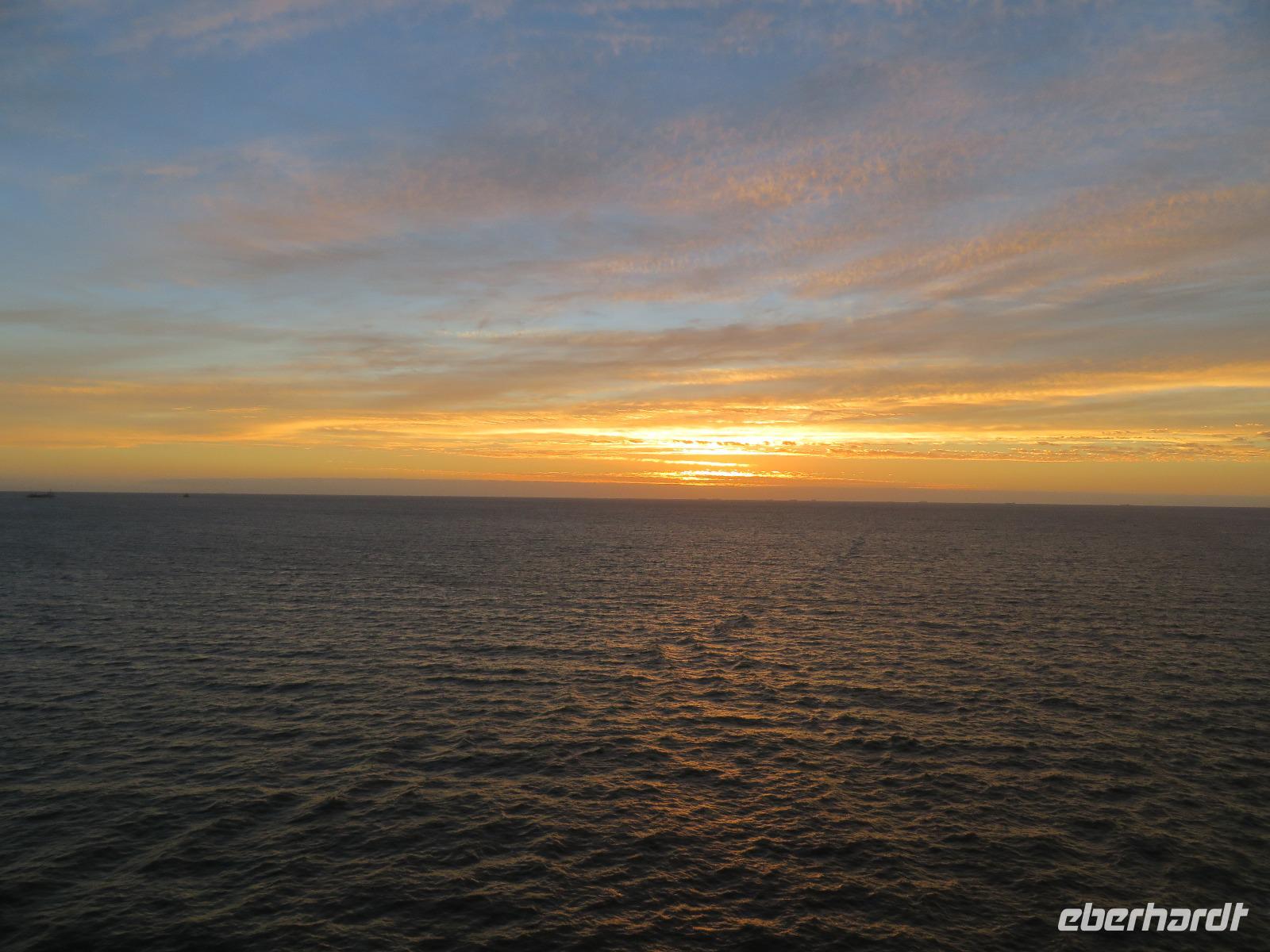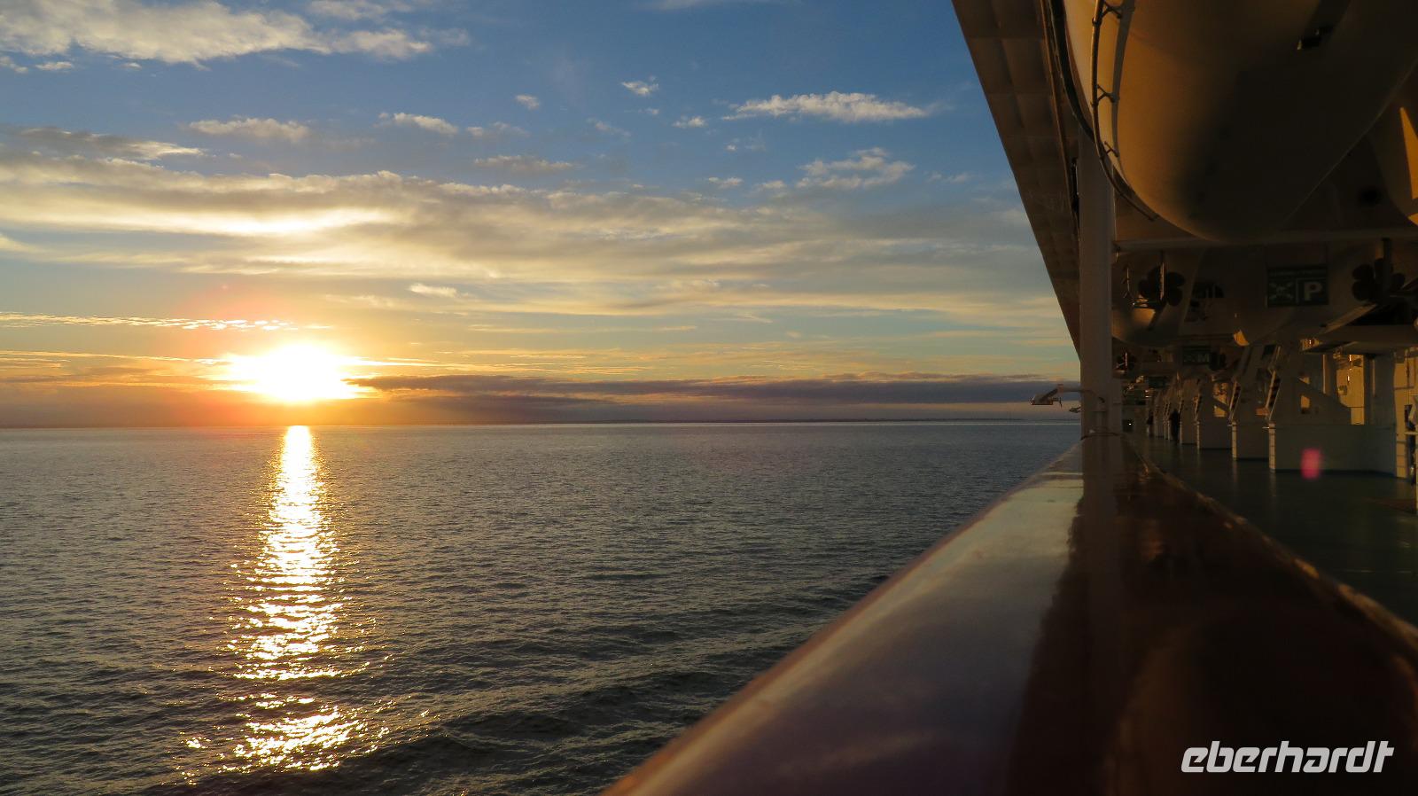Juhu, die Sonne lacht und das Meer ist annähernd spiegelglatt. So lässt sich doch ein Tag auf See ausgiebig genießen. Heute wird nochmal alles auf dem Schiff ausprobiert und zeitgleich Adios gesagt. So wird hier und da ein Cocktail getrunken, nochmal getestet, ob das Softeis genauso lecker schmeckt, wie in den vergangenen Tagen und ob die Sauna immer noch Dampf hat. Gegen 17:30 Uhr versammelt sich wieder die Sherlock Holmes Gemeinschaft und löst Geschichten rund um spektakuläre Ereignisse und kuriose Morde. Nebenbei spielen wir auch noch gemeinschaftlich das Quiz vom Schiff und Fragen uns immer mehr, wer das eigentlich wissen soll. Nichtsdestotrotz haben wir unsere Bonuspunkte durch ehrliches spielen und minimales schummeln voll bekommen und können uns am Abend „atemberaubende" Gewinne abholen. Nach dem letzten Abendessen auf See, müssen wir dann alle Koffer vor die Tür stellen, um sie dann morgen wieder an Land entgegen zu nehmen. Zumindest hoffen wir auf ein Wiedersehen.
