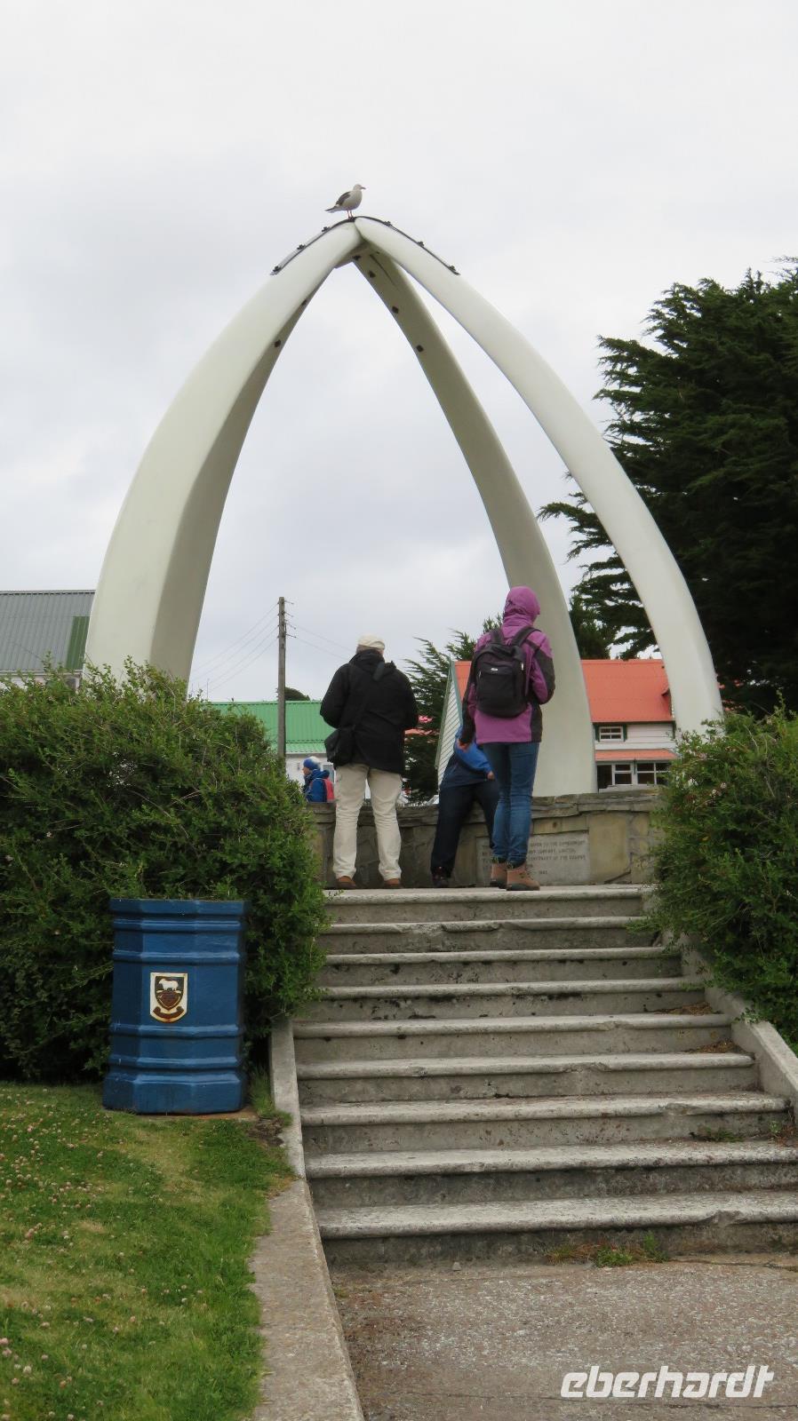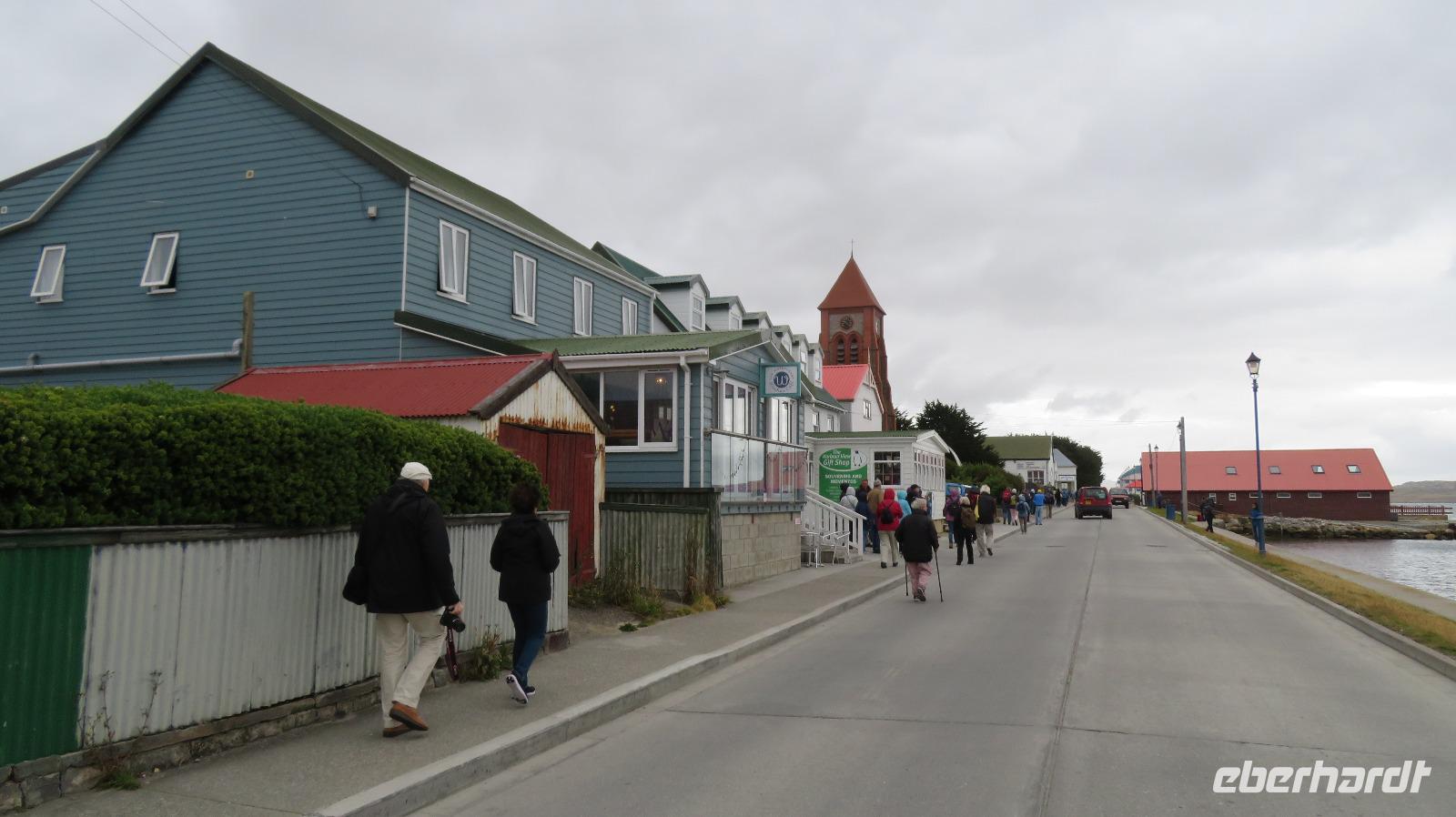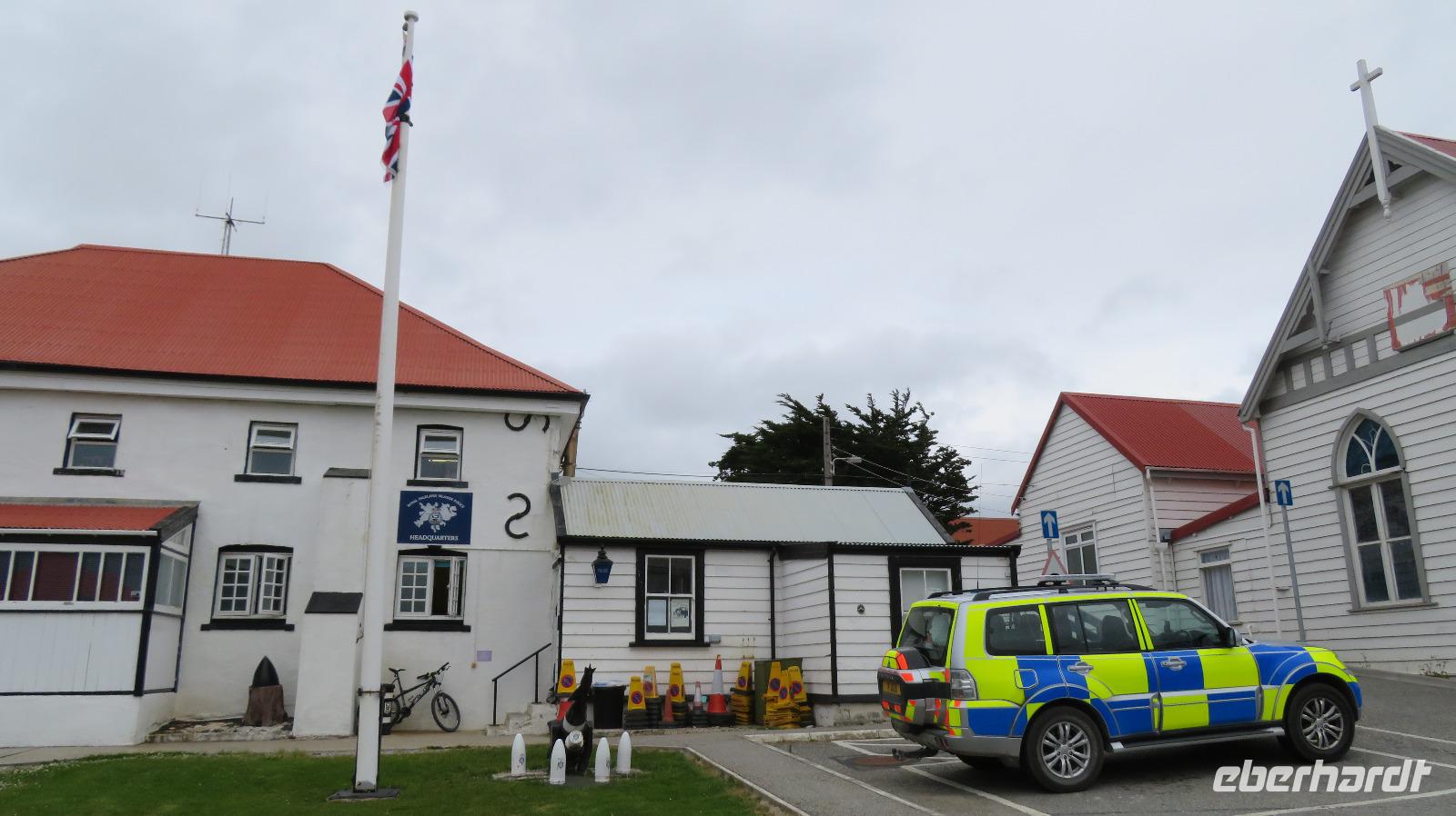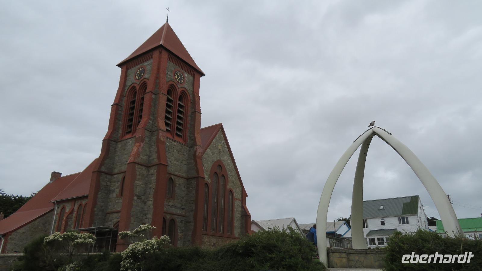 Am zeitigen Morgen mussten die Tickets für das Tendern besorgt werden. Nachdem dieses geglückt war, verließen wir das Schiff und schipperten gemütlich in Richtung Stanley. Die Falklandinseln sind relativ klein und mit etwas mehr als 1500 Einwohner auch nur spärlich bewohnt. Dennoch hat das kleine Städtchen einen netten eigenen Charme. Da es zu dem Vereinigten Königreich gehört, muss man sich direkt auf den Linksverkehr einstellen. Dieses glückt aber recht gut, da sich der Verkehr in Grenzen hält. Nachdem wir uns alle mit italienischen Stadtplänen eingedeckt haben, starten wir unseren kleinen Rundgang. Zunächst besichtigen wir die Christ Church Kathedrale, welche die südlichste Kathedrale der Welt ist. Direkt neben der Kirche steht ein Bogen aus Walknochen. Diese wurden 1933 aus Kieferknochen zweier Blauwale gebaut und eine Möwe bewacht die ganze Zeit das Bauwerk. Neben den kleinen Souvenir Geschäften befindet sich noch ein größerer Supermarkt, die Poststation und das Museum auf der lebendigen Straße. Interessant hierbei ist der Ort der hiesigen Bank. Diese befindet sich genau gegenüber der Polizeistation, die immerhin Platz für 13 Insassen hat.