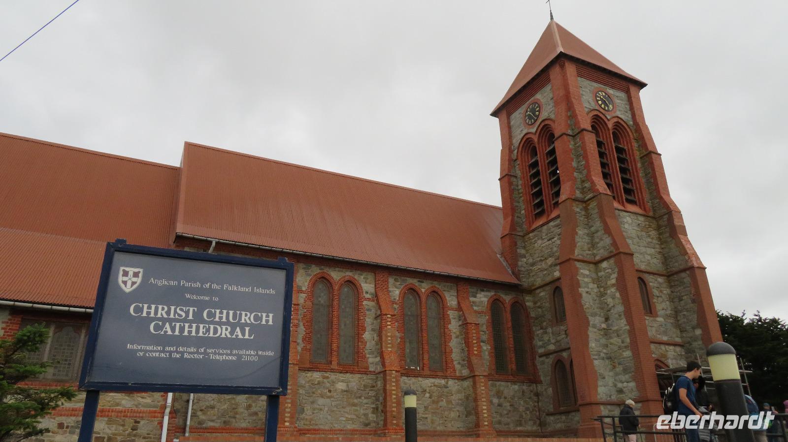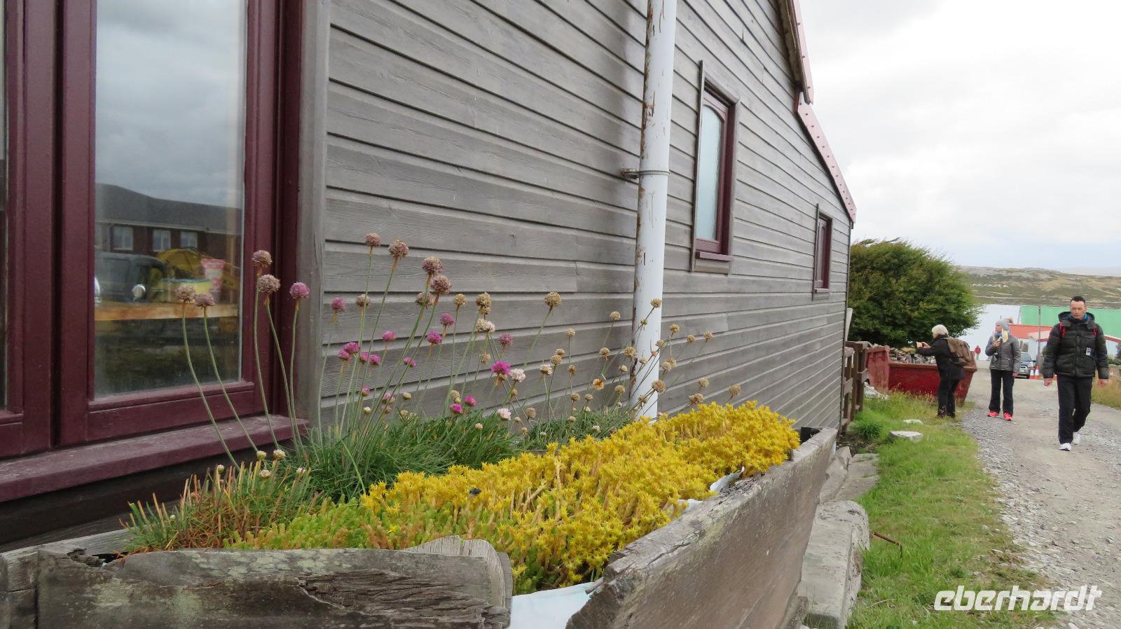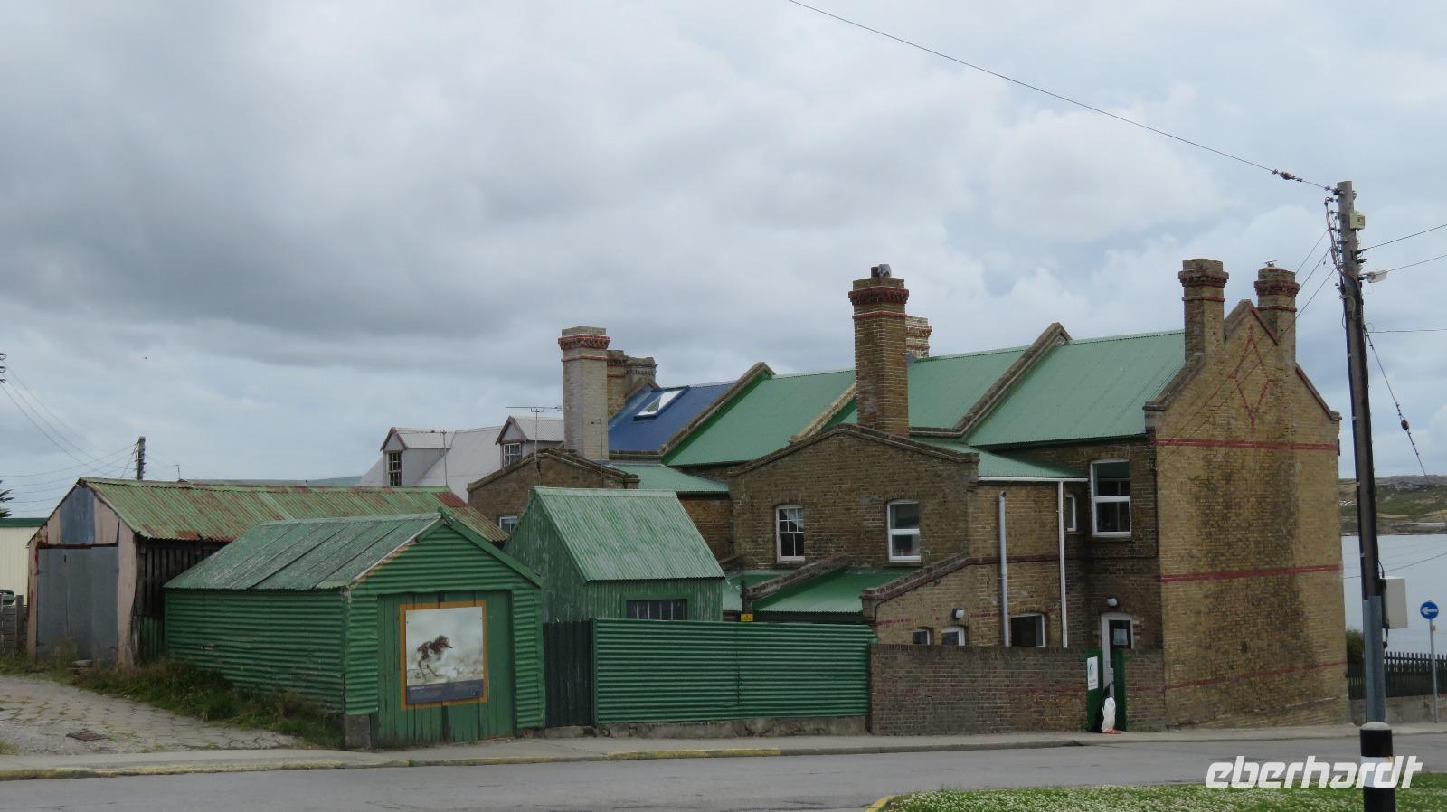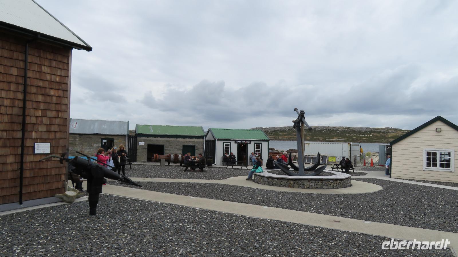 Am zeitigen Morgen mussten die Tickets für das Tendern besorgt werden. Nachdem dieses geglückt war, verließen wir das Schiff und schipperten gemütlich in Richtung Stanley. Die Falklandinseln sind relativ klein und mit etwas mehr als 1500 Einwohner auch nur spärlich bewohnt. Dennoch hat das kleine Städtchen einen netten eigenen Charme. Da es zu dem Vereinigten Königreich gehört, muss man sich direkt auf den Linksverkehr einstellen. Dieses glückt aber recht gut, da sich der Verkehr in Grenzen hält. Nachdem wir uns alle mit italienischen Stadtplänen eingedeckt haben, starten wir unseren kleinen Rundgang. Zunächst besichtigen wir die Christ Church Kathedrale, welche die südlichste Kathedrale der Welt ist. Direkt neben der Kirche steht ein Bogen aus Walknochen. Diese wurden 1933 aus Kieferknochen zweier Blauwale gebaut und eine Möwe bewacht die ganze Zeit das Bauwerk. Neben den kleinen Souvenir Geschäften befindet sich noch ein größerer Supermarkt, die Poststation und das Museum auf der lebendigen Straße. Interessant hierbei ist der Ort der hiesigen Bank. Diese befindet sich genau gegenüber der Polizeistation, die immerhin Platz für 13 Insassen hat.