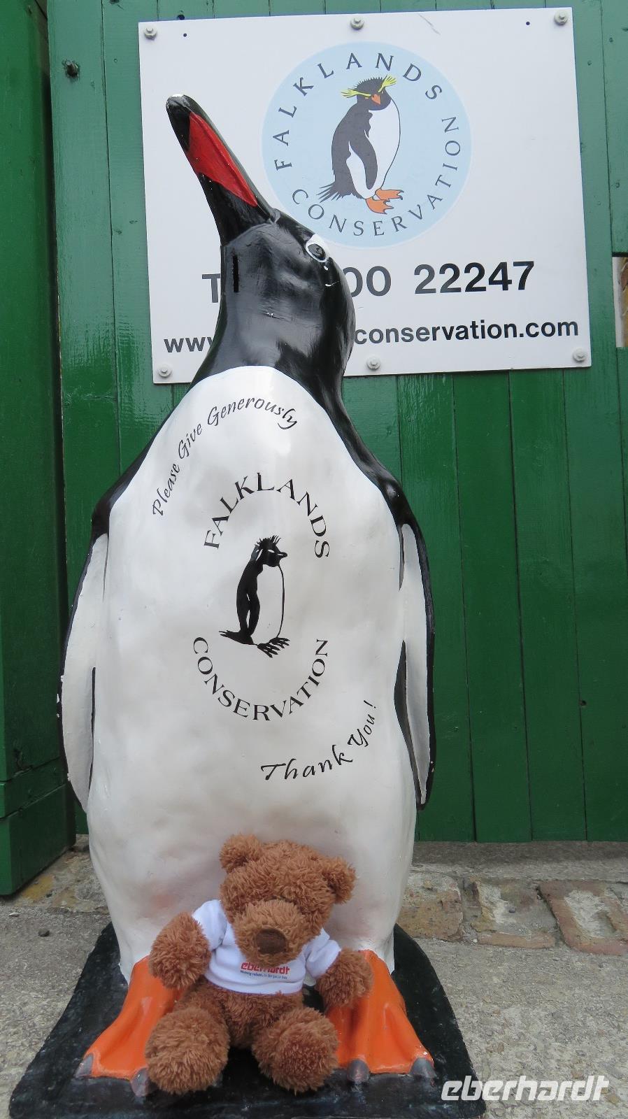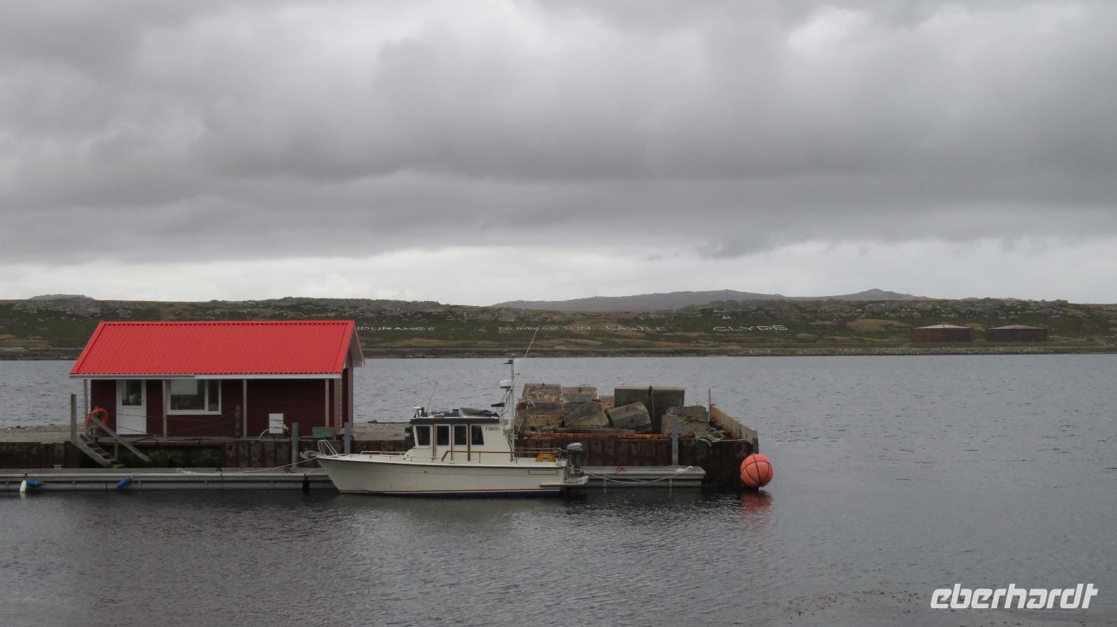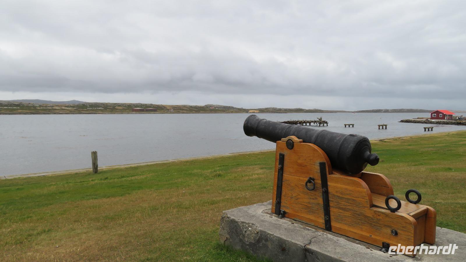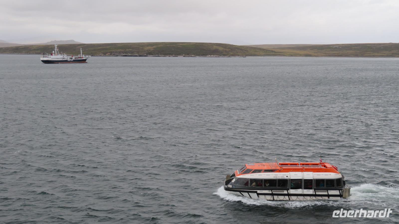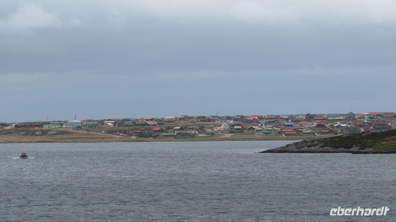 Am zeitigen Morgen mussten die Tickets für das Tendern besorgt werden. Nachdem dieses geglückt war, verließen wir das Schiff und schipperten gemütlich in Richtung Stanley. Die Falklandinseln sind relativ klein und mit etwas mehr als 1500 Einwohner auch nur spärlich bewohnt. Dennoch hat das kleine Städtchen einen netten eigenen Charme. Da es zu dem Vereinigten Königreich gehört, muss man sich direkt auf den Linksverkehr einstellen. Dieses glückt aber recht gut, da sich der Verkehr in Grenzen hält. Nachdem wir uns alle mit italienischen Stadtplänen eingedeckt haben, starten wir unseren kleinen Rundgang. Zunächst besichtigen wir die Christ Church Kathedrale, welche die südlichste Kathedrale der Welt ist. Direkt neben der Kirche steht ein Bogen aus Walknochen. Diese wurden 1933 aus Kieferknochen zweier Blauwale gebaut und eine Möwe bewacht die ganze Zeit das Bauwerk. Neben den kleinen Souvenir Geschäften befindet sich noch ein größerer Supermarkt, die Poststation und das Museum auf der lebendigen Straße. Interessant hierbei ist der Ort der hiesigen Bank. Diese befindet sich genau gegenüber der Polizeistation, die immerhin Platz für 13 Insassen hat.