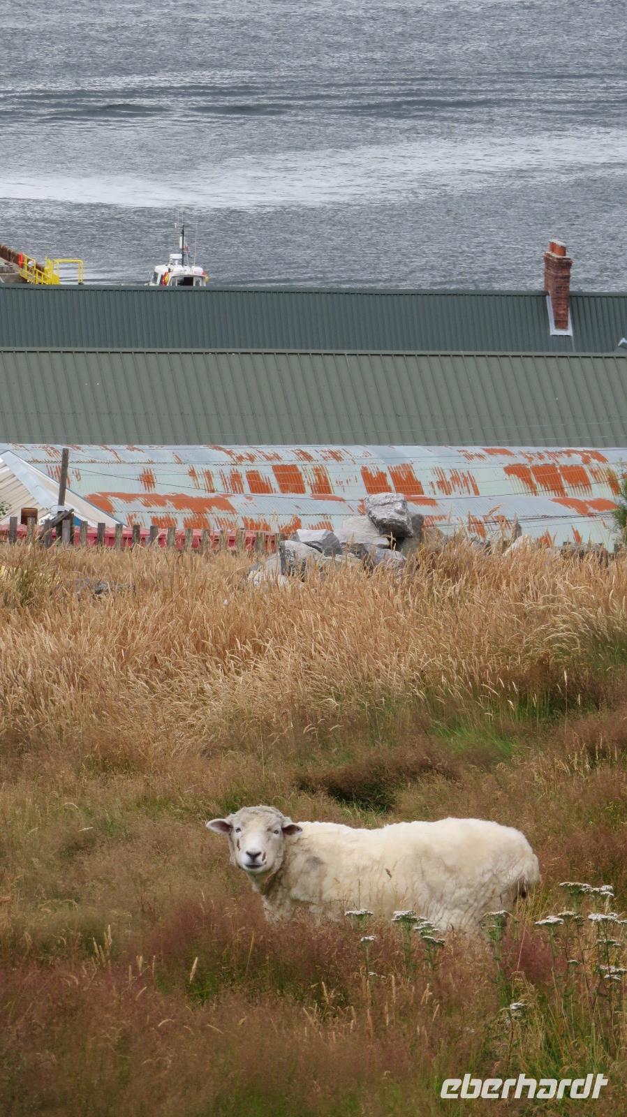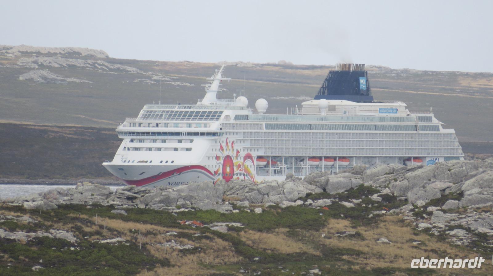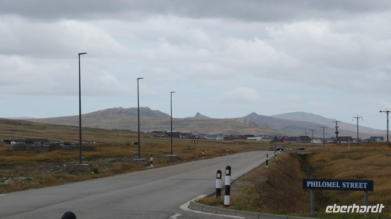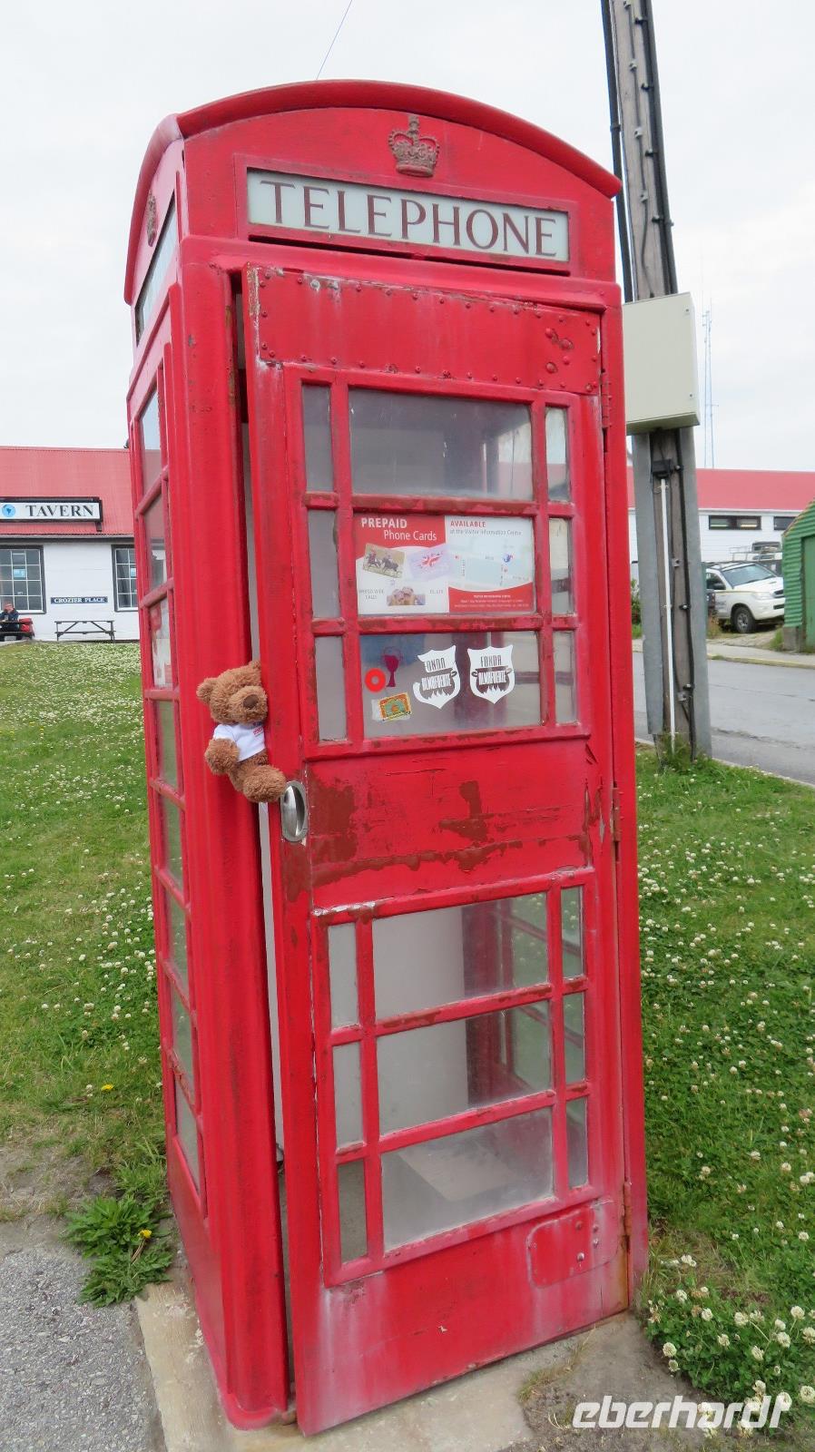 Am zeitigen Morgen mussten die Tickets für das Tendern besorgt werden. Nachdem dieses geglückt war, verließen wir das Schiff und schipperten gemütlich in Richtung Stanley. Die Falklandinseln sind relativ klein und mit etwas mehr als 1500 Einwohner auch nur spärlich bewohnt. Dennoch hat das kleine Städtchen einen netten eigenen Charme. Da es zu dem Vereinigten Königreich gehört, muss man sich direkt auf den Linksverkehr einstellen. Dieses glückt aber recht gut, da sich der Verkehr in Grenzen hält. Nachdem wir uns alle mit italienischen Stadtplänen eingedeckt haben, starten wir unseren kleinen Rundgang. Zunächst besichtigen wir die Christ Church Kathedrale, welche die südlichste Kathedrale der Welt ist. Direkt neben der Kirche steht ein Bogen aus Walknochen. Diese wurden 1933 aus Kieferknochen zweier Blauwale gebaut und eine Möwe bewacht die ganze Zeit das Bauwerk. Neben den kleinen Souvenir Geschäften befindet sich noch ein größerer Supermarkt, die Poststation und das Museum auf der lebendigen Straße. Interessant hierbei ist der Ort der hiesigen Bank. Diese befindet sich genau gegenüber der Polizeistation, die immerhin Platz für 13 Insassen hat.