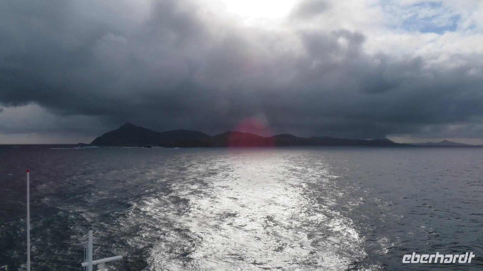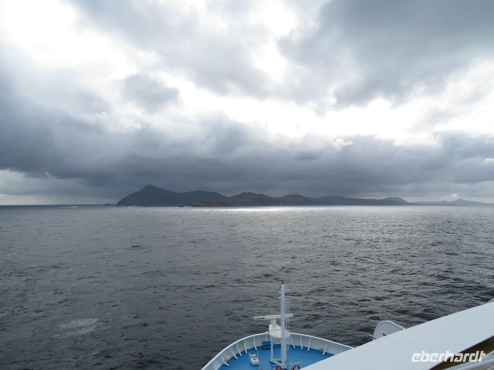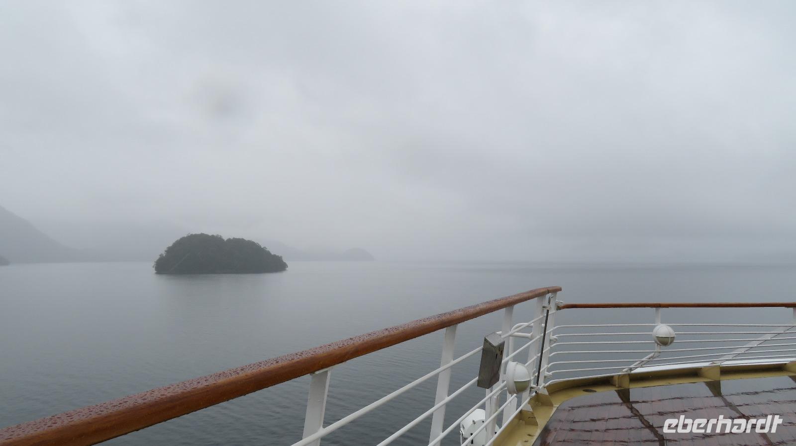 Heute wird das letzte Mal für uns die Tenderboote nach unten gelassen. Stefanie, unsere heutige Reiseleiterin zeigt uns ihr „neues" Zuhause. Das Wetter ist ziemlich nebelig aber Stefanie meint, dass verzieht sich in etwas mehr als einer Stunde definitiv. Na, sie muss es ja wissen.
