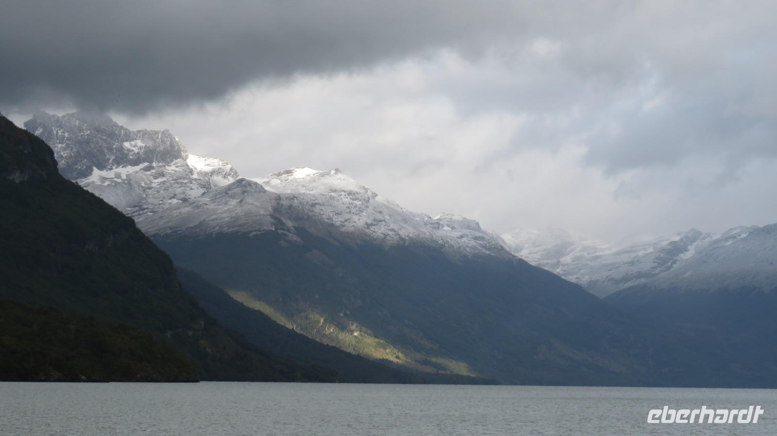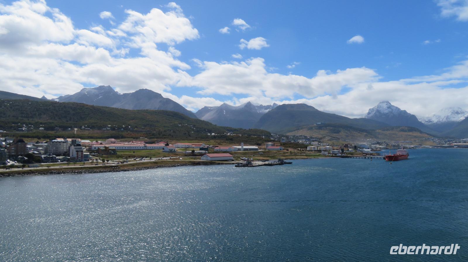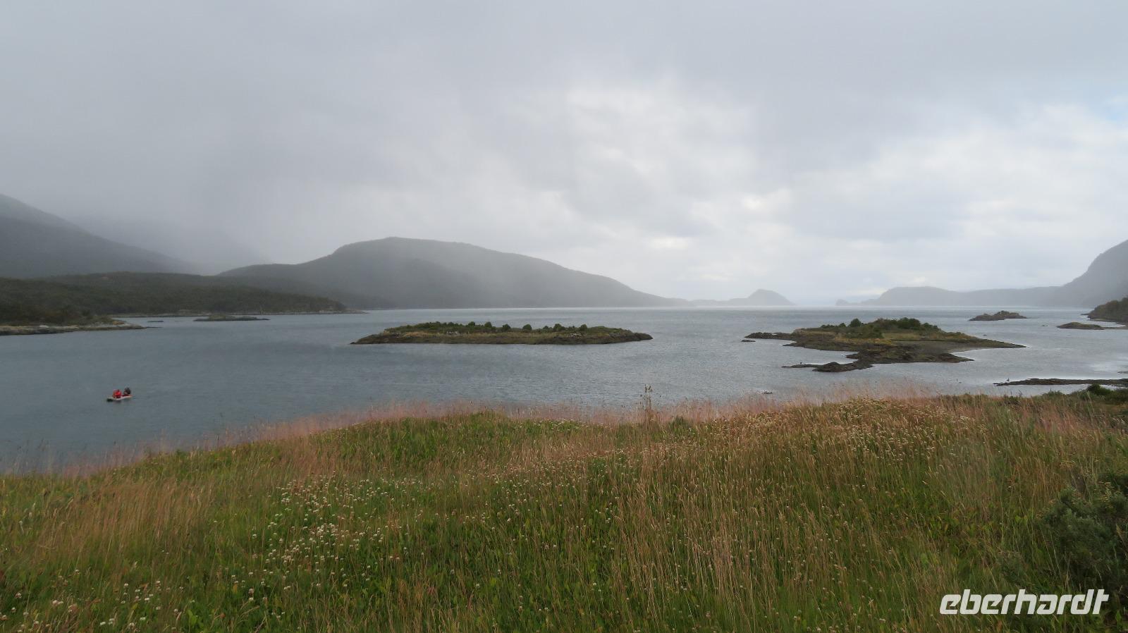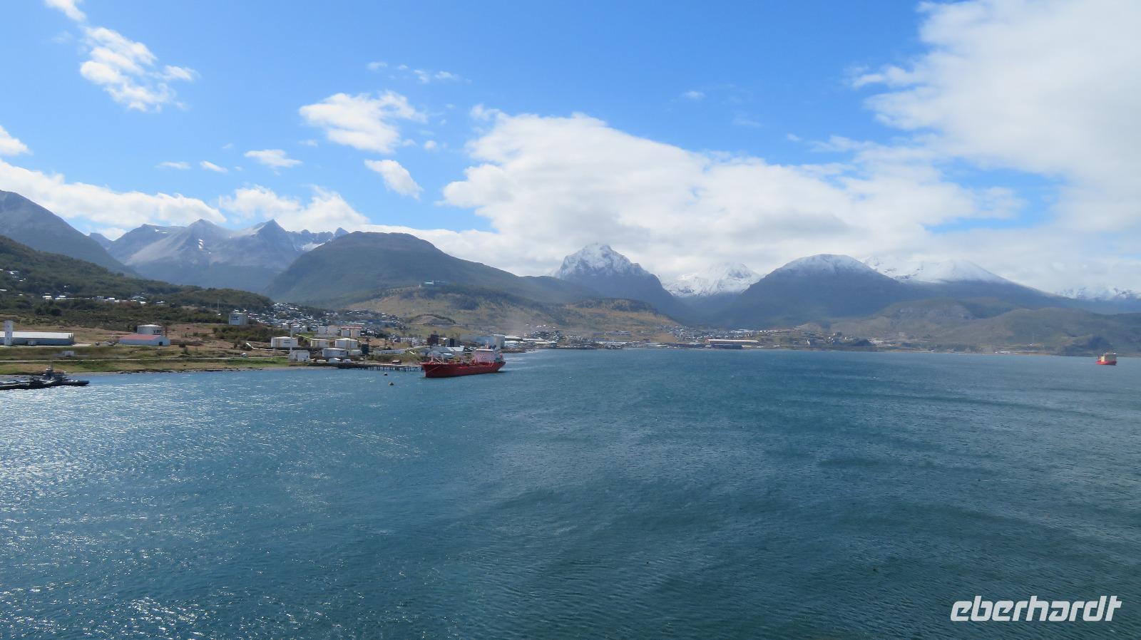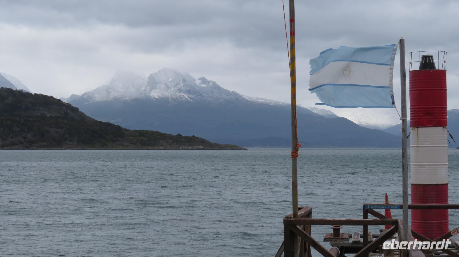 Im Anschluss daran, ziehen sich die dunklen Wolken zusammen und wir verlassen das raue Meer und fahren in den Beagle Kanal ein. Hier wird es gleich deutlich ruhiger und so schippern wir gemütlich der südlichsten Stadt der Welt entgegen.