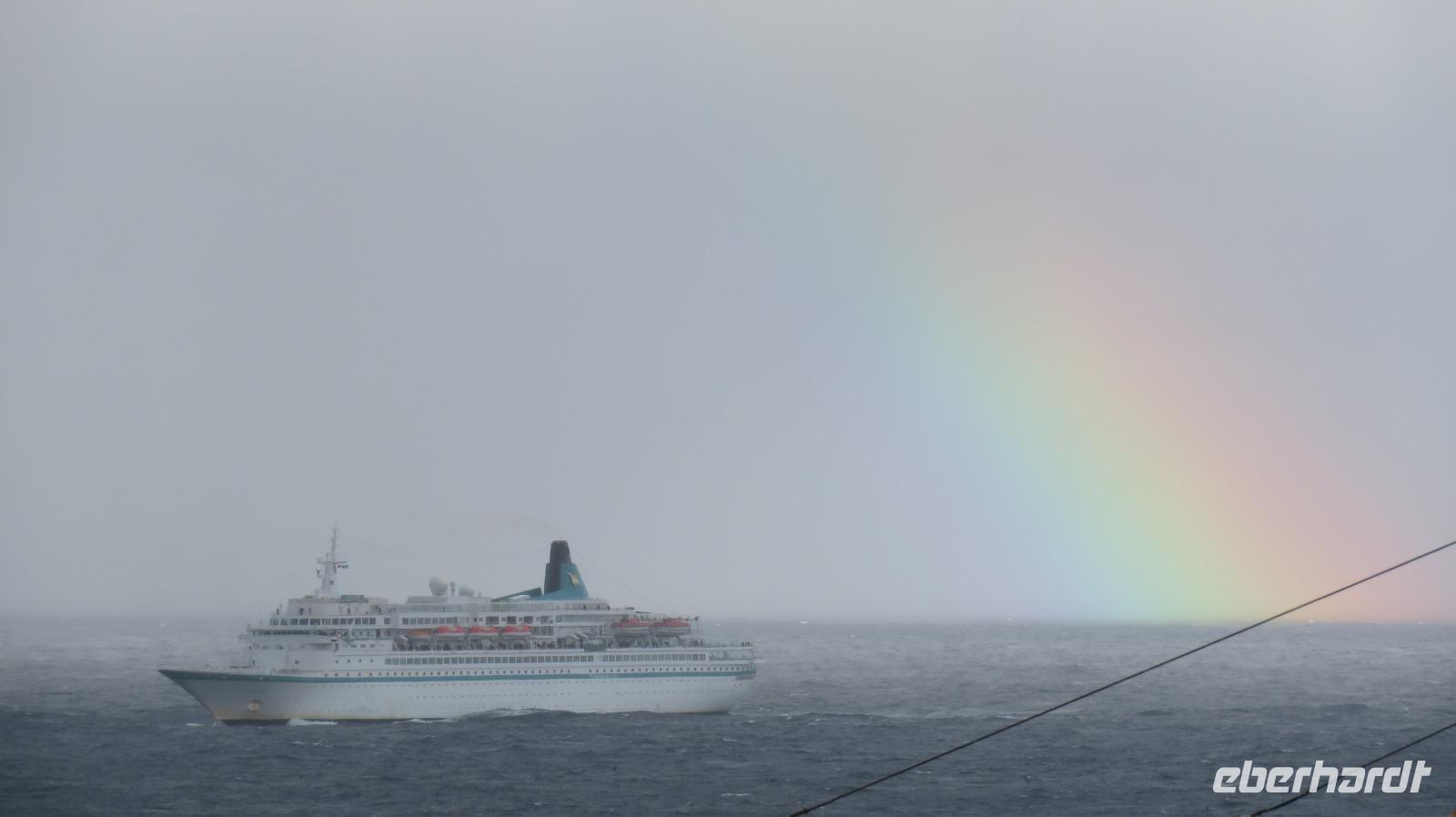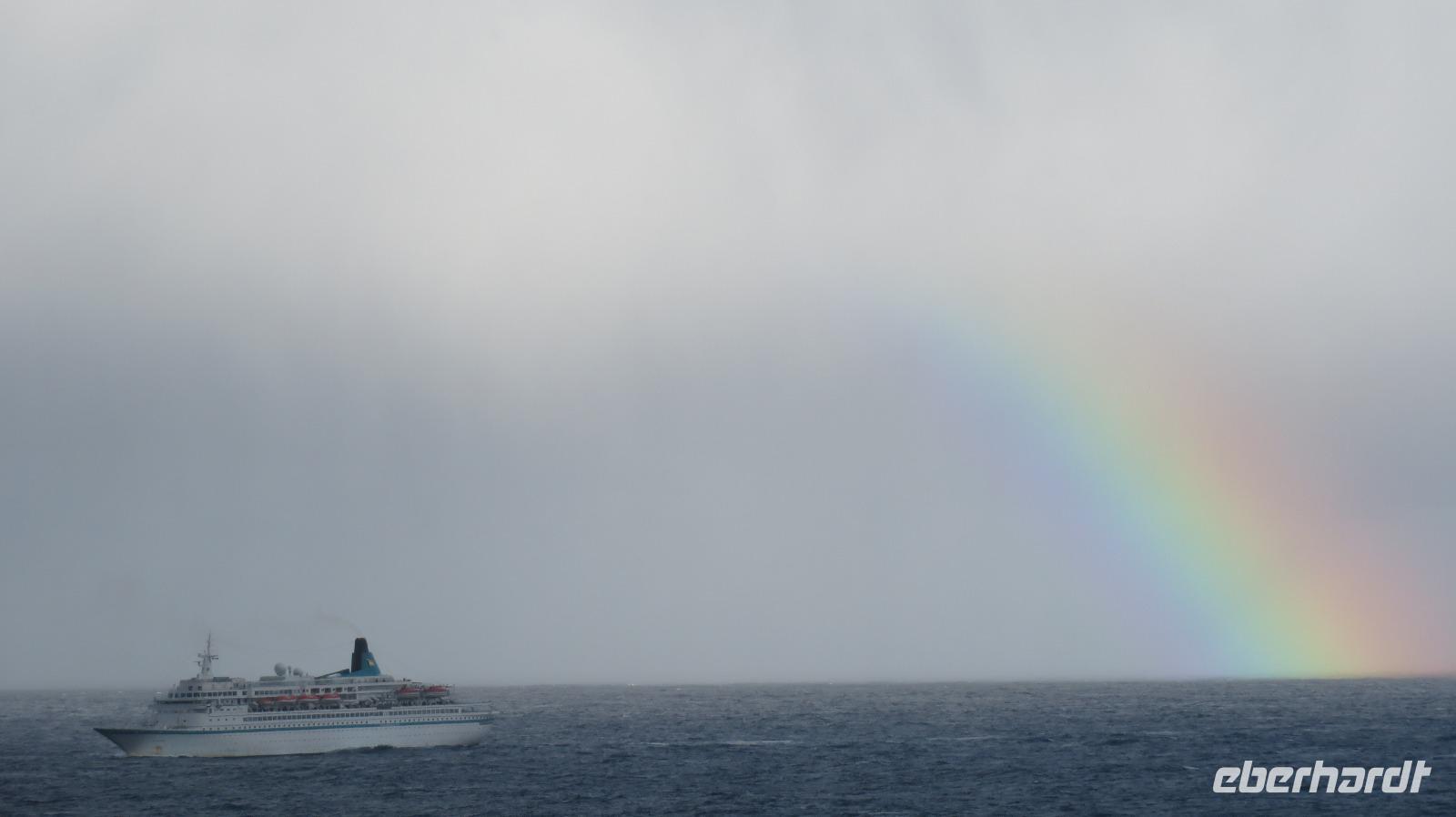 Heute ist ein besonderer Tag, den die Umschiffung des Kap Hoorn steht auf dem Programm und von daher, darf es auch ein wenig schaukeln. Sonst würde man auch nicht den vielen Geschichten glauben, die von einer schweren Umrundung des Kaps berichten. Gegen 18:30 Uhr ist es dann soweit. Das Wetter ist nur leicht rau und wir haben Glück und können den Leuchtturm von unserem Schiff aus erkennen. So wie es die Geschichte will, können wir nun in der Kneipe die Füße auf dem Tisch legen, weil wir echte Seefahrer sind und das Kap umrundet haben. :)