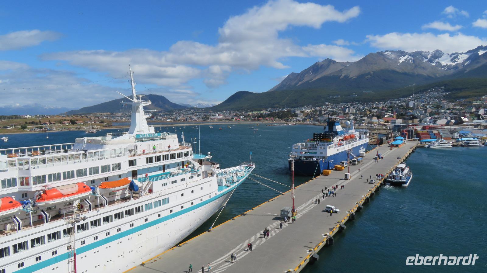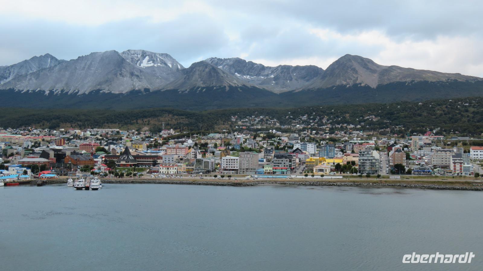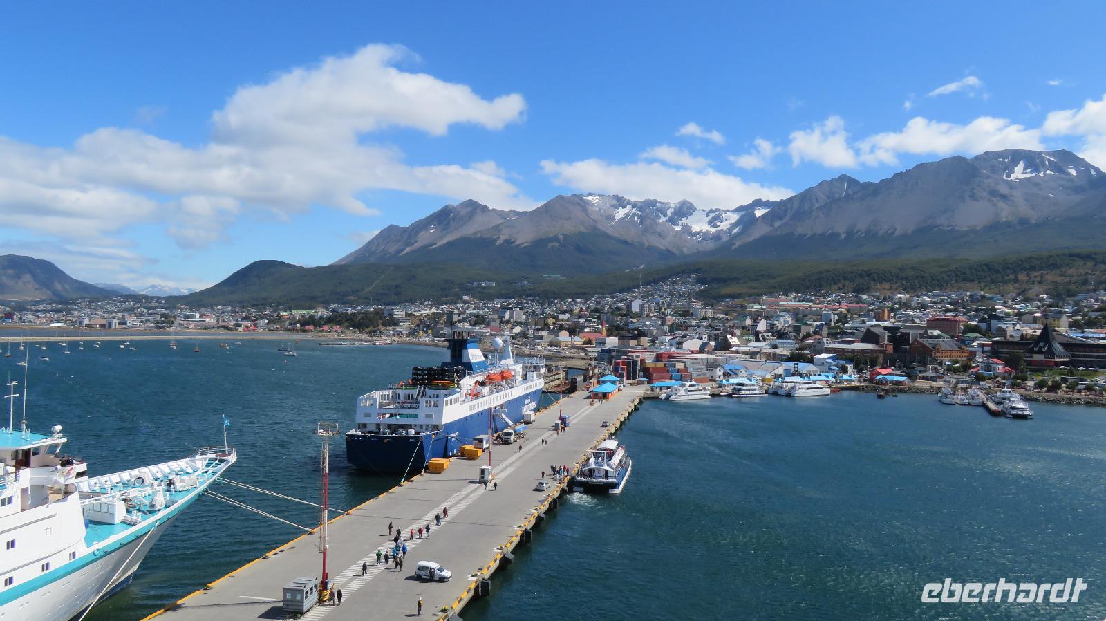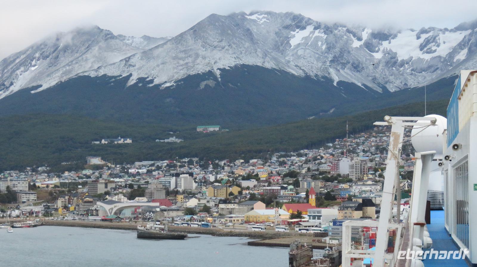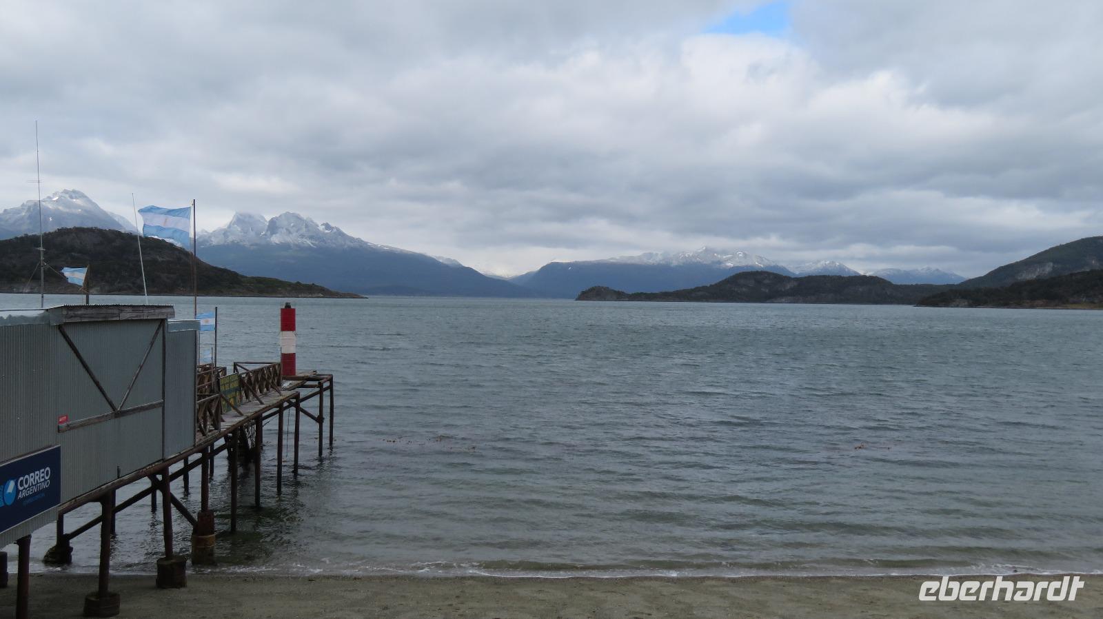 Gestern war es ja schon recht frisch aber heute erst, da muss direkt die Mütze zum Einsatz kommen. Das Panorama vom Schiff ist dagegen Weltklasse. Vorne sieht man kleine bunte Häuser und im Hintergrund drohen die gewaltigen Berge mit ihren weißen Zipfelmützen. Mit dem Bus geht es direkt in den Nationalpark und die Landschaft ist hier wunderschön. Hier würde man am liebsten die Wanderschuhe oder das Fahrrad auspacken und die Gegend genauer und ausführlicher erkunden. Am Ende unseres Ausfluges kommen wir noch am südlichsten Postamt der Welt vorbei. Die Geschichte hinter dem Postamt ist so skurril, wie die Person die darin arbeitet. Hier holen wir uns einen Poststempel ab und kaufen schicke Souvenirs. Zurück in der knapp 60.000 Einwohner zählenden Stadt, laufen wir noch einmal umher und suchen neben einem Wlan Spot das Hardrock Café. Der Ort ist im Allgemeinen geprägt von Tourismus, da hier eine große Anzahl von Expeditionen in die Antarktis starten und Schiffe auf ihrer Südamerika Route einen Zwischenstopp einlegen. Heute ist zudem die Argentinische Rugby Nationalmannschaft da und die Stadt wird daher auf Vordermann gebracht und die Bürgersteige bekommen einen neuen Anstrich.