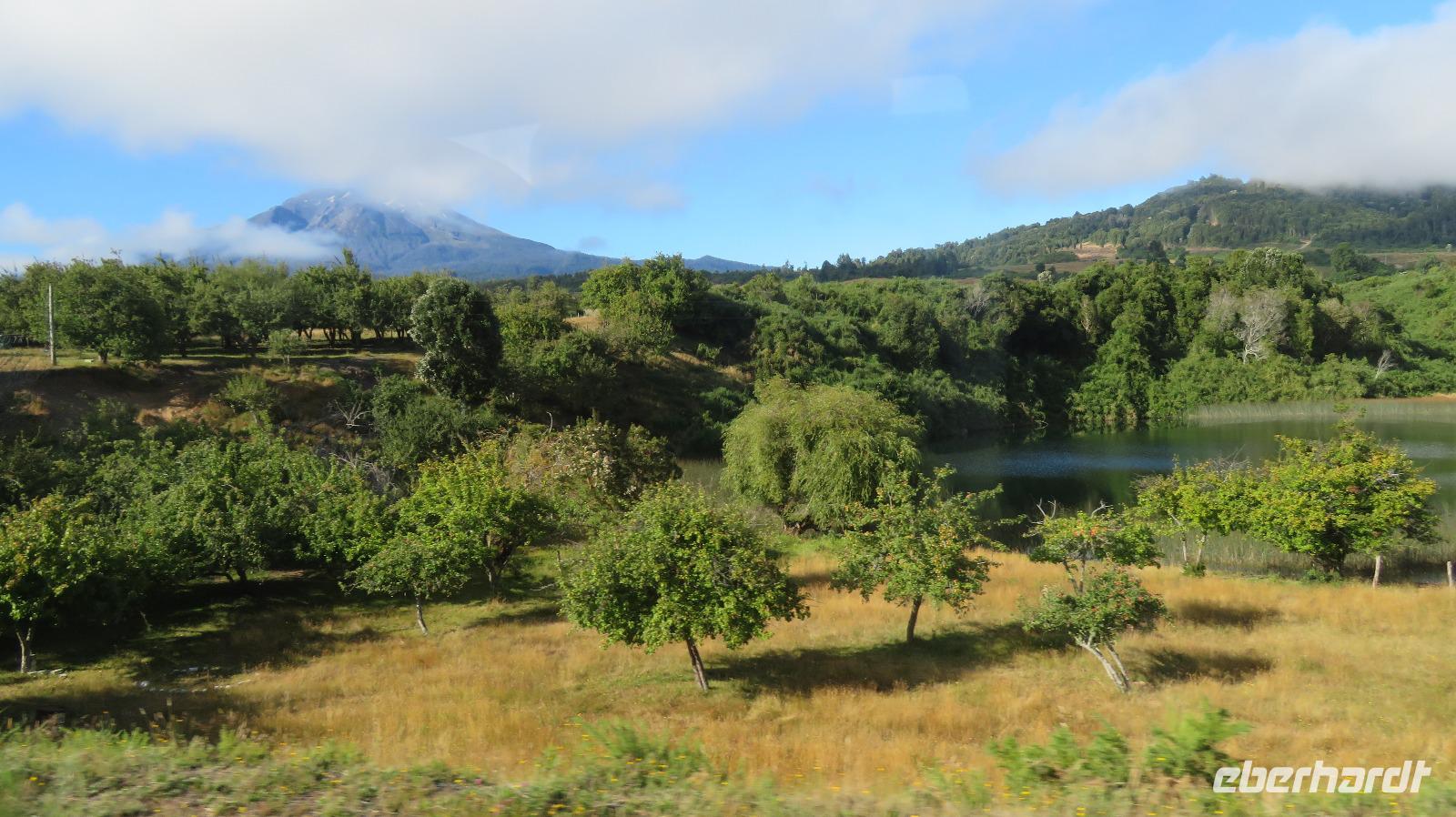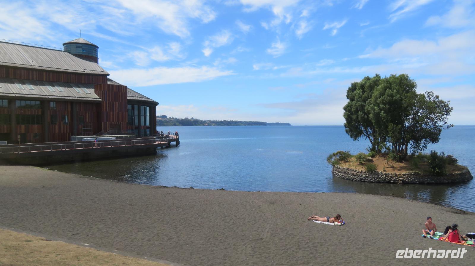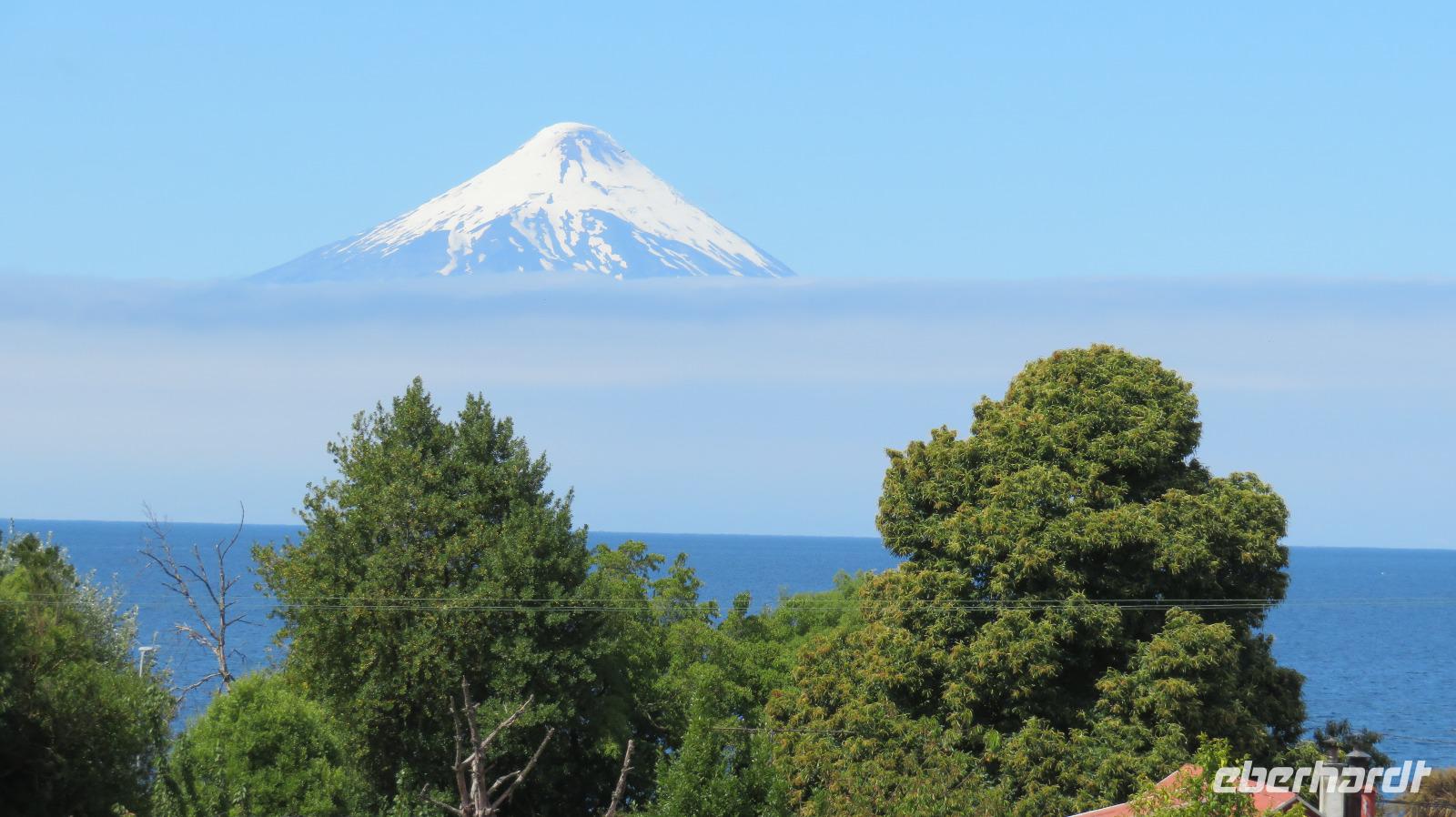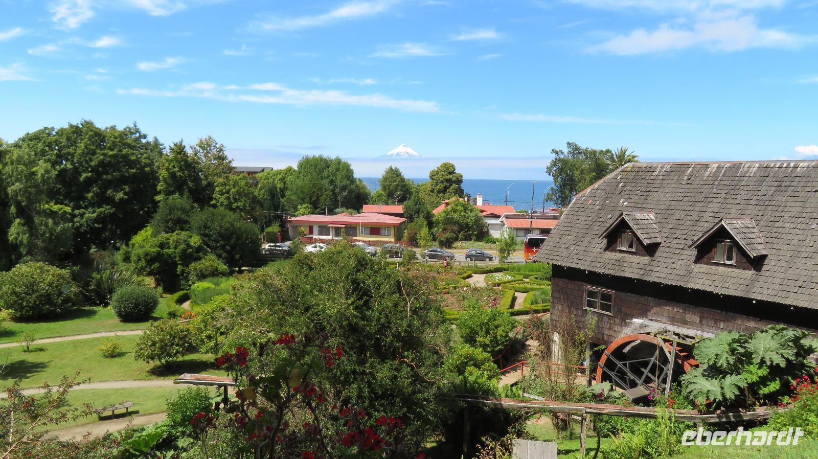 Unser erster Stopp führt uns zu den Petrohue Wasserfälle. Nachdem wir die Wasserfälle in Iguazu kennen gelernt haben, ist das natürlich Kindergarten dagegen. Aber hier macht es eindeutig auch die Umgebung. Im Hintergrund von den Wasserfällen sieht man den Vulkan Osorno, welcher wie ein Mustervulkan aussieht. Er ähnelt ein wenig dem Fuji Vulkan in Japan. Nach der vielen frischen Luft bekommen wir Hunger und speisen zum Mittag leckeren Lachs. Nun waren wir alle wieder bei Kräften und es ging zum deutschen Dorf nach Frutillar. Im 19 Jahrhundert haben sich hier viele Deutsche und Österreicher niedergelassen und man fühlt sich ein wenig wie in Deutschland. An jeder Ecke werben die Tafeln mit Kaffee, Kuchen und Apfelstrudel. Zum Abschluss darf gesagt werden, Stefanie hatte Recht. Der Nebel hat sich verzogen und die Sonne hat die Oberhand übernommen. Somit macht der kleine Spaziergang im Dörfchen gleich doppelt Spaß und wir stellen alle gemeinsam fest, dass wir hier gerne noch ein wenig länger geblieben wären.