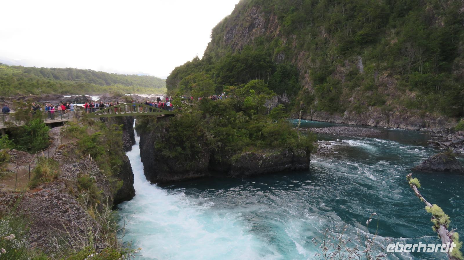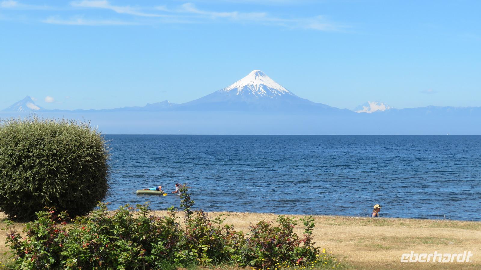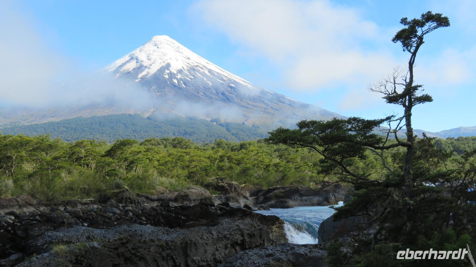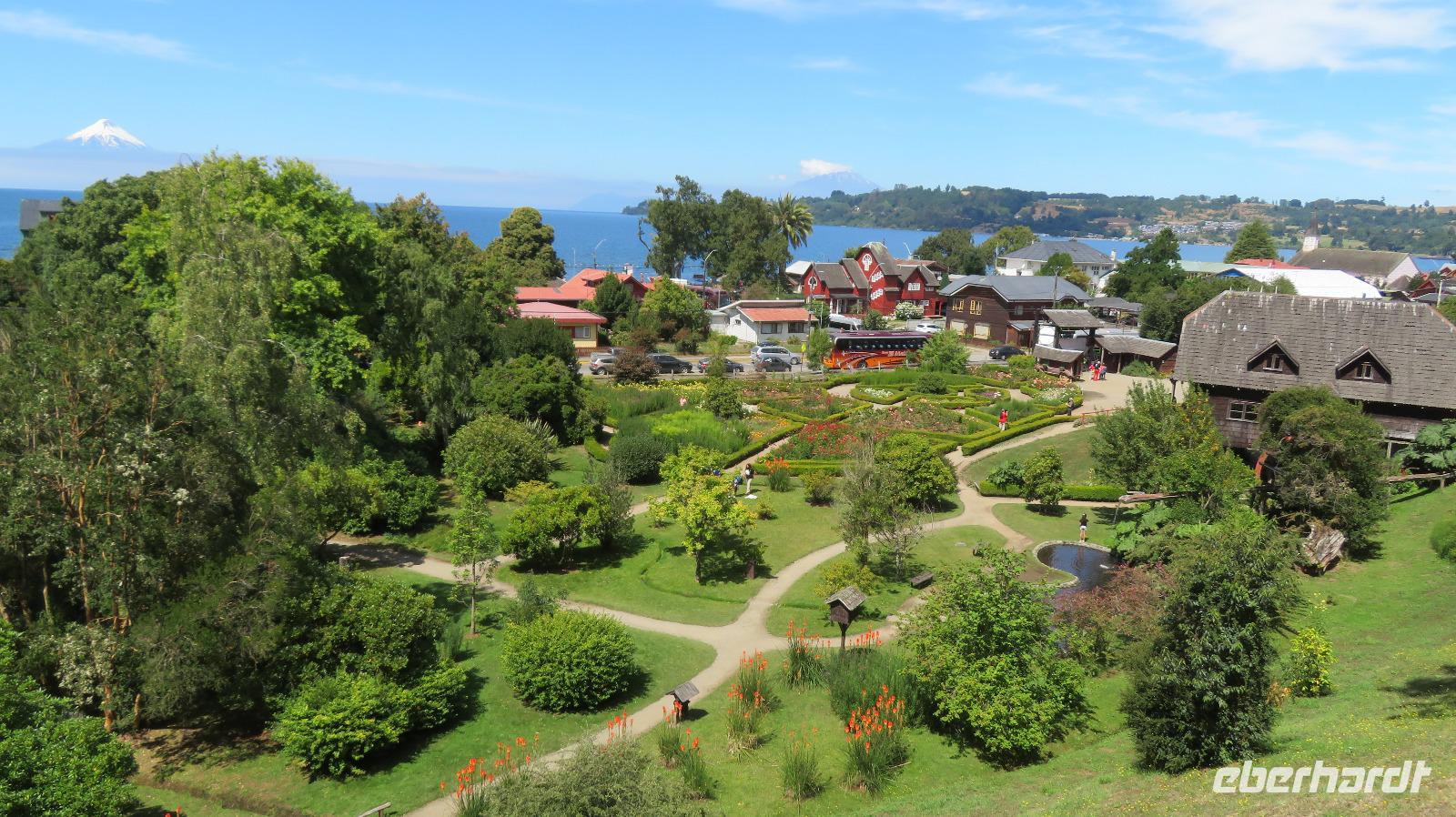 Unser erster Stopp führt uns zu den Petrohue Wasserfälle. Nachdem wir die Wasserfälle in Iguazu kennen gelernt haben, ist das natürlich Kindergarten dagegen. Aber hier macht es eindeutig auch die Umgebung. Im Hintergrund von den Wasserfällen sieht man den Vulkan Osorno, welcher wie ein Mustervulkan aussieht. Er ähnelt ein wenig dem Fuji Vulkan in Japan. Nach der vielen frischen Luft bekommen wir Hunger und speisen zum Mittag leckeren Lachs. Nun waren wir alle wieder bei Kräften und es ging zum deutschen Dorf nach Frutillar. Im 19 Jahrhundert haben sich hier viele Deutsche und Österreicher niedergelassen und man fühlt sich ein wenig wie in Deutschland. An jeder Ecke werben die Tafeln mit Kaffee, Kuchen und Apfelstrudel. Zum Abschluss darf gesagt werden, Stefanie hatte Recht. Der Nebel hat sich verzogen und die Sonne hat die Oberhand übernommen. Somit macht der kleine Spaziergang im Dörfchen gleich doppelt Spaß und wir stellen alle gemeinsam fest, dass wir hier gerne noch ein wenig länger geblieben wären.