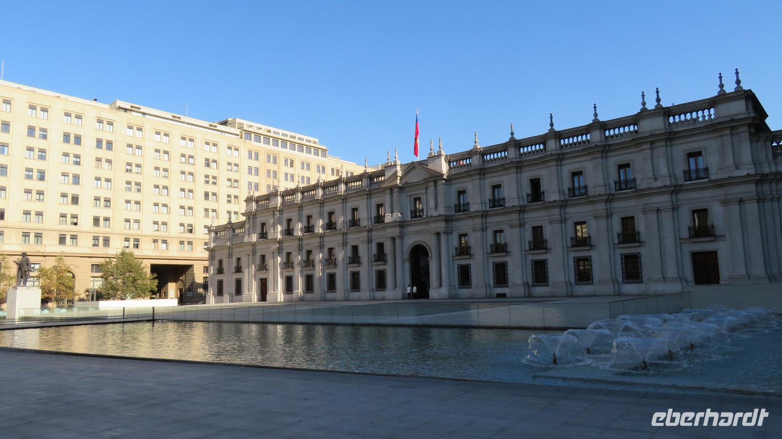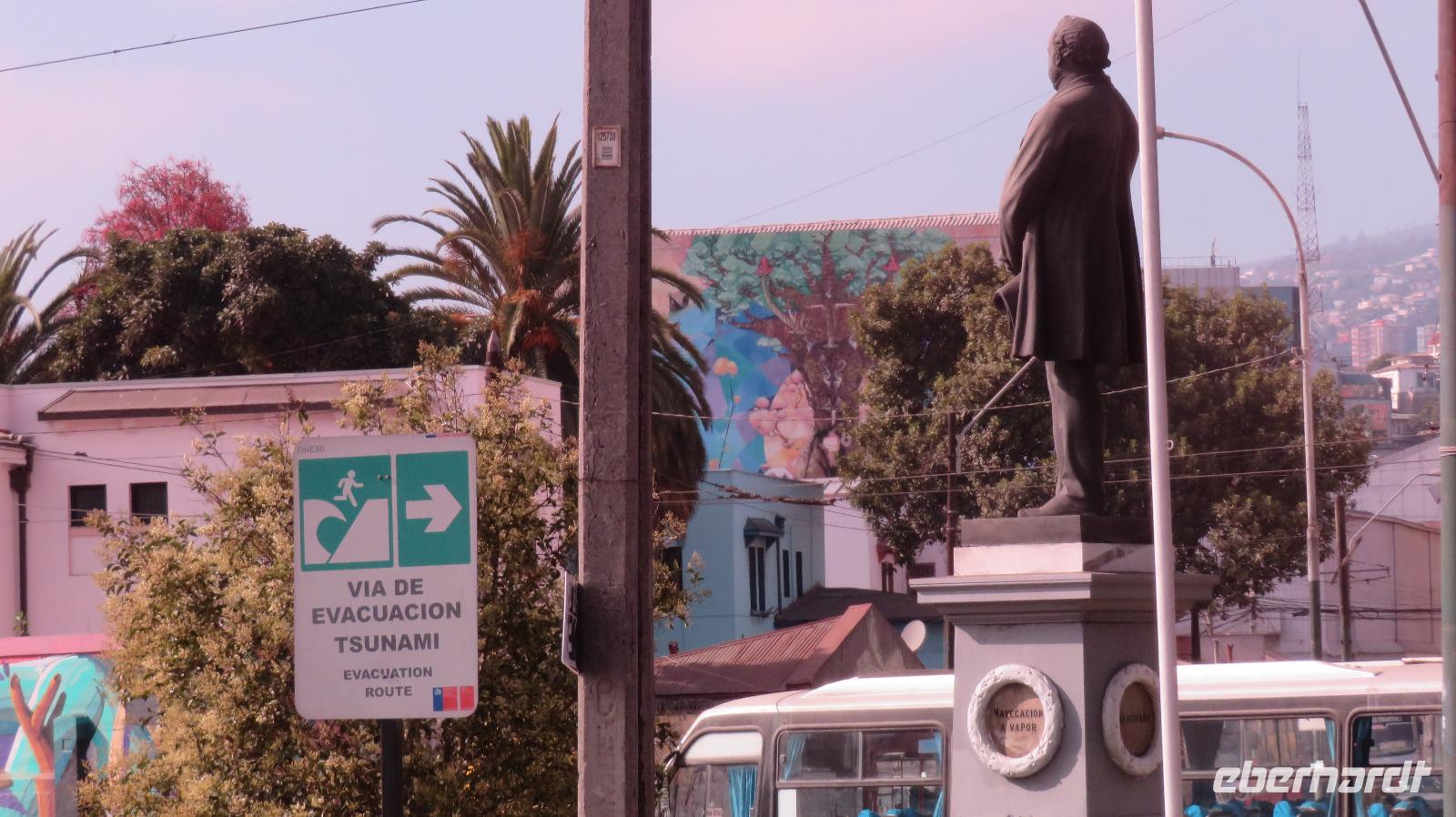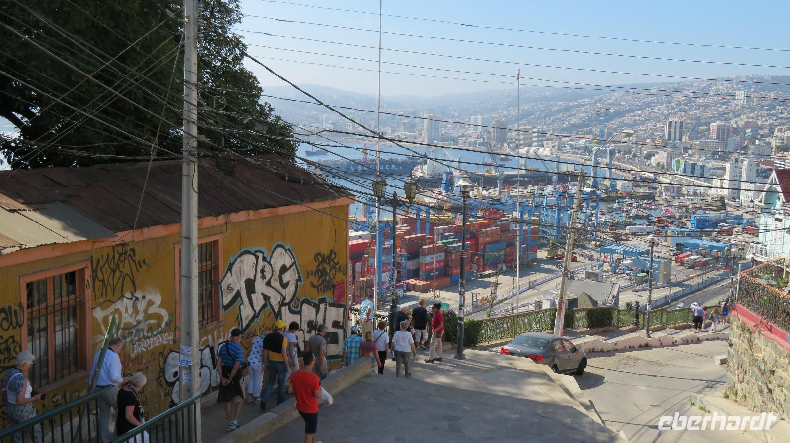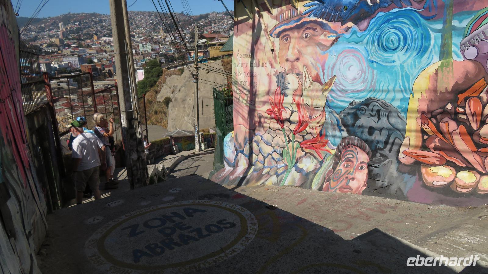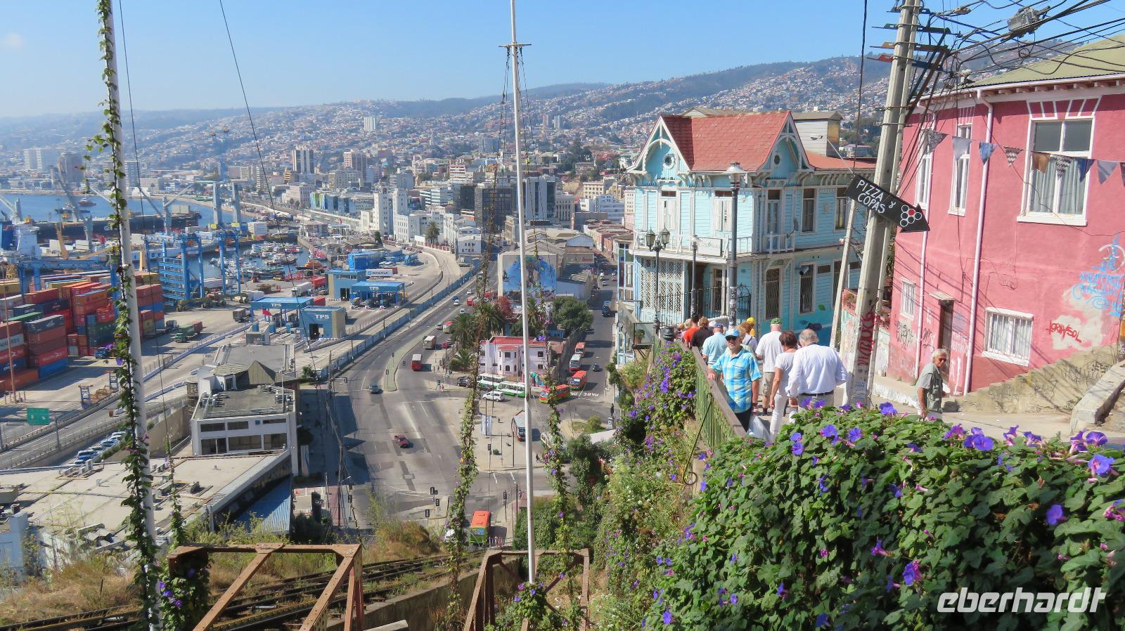 Der Check Out verläuft so schnell, dass unsere Reiseleiterin inklusive unseres Buses noch fehlt. Nachdem beide eingetroffen sind, sinken wir in die Ledersitze nieder und winken dem Schiff zum Abschied. Auf dem Tagesprogramm steht zunächst die chilenische Küstenstadt Valparaíso. Hier wären wir theoretisch direkt mit dem Schiff gelandet, aber die Arbeiter haben letztes Jahr ein Streik im Hafen begonnen und die größeren Reedereien haben daraufhin den Hafen gewechselt. Somit geht es nun von San Antonio mit dem Bus nach Valparaiso. Unsere Rheinländische Reiseleiterin Michelle bringt uns die kleine knusprige morbide Stadt etwas näher und ich muss sagen, sie gefällt mir. Wir fahren mit dem Bus am neuen Nationalkongress, der Kathedrale und weiteren imposanten Gebäuden wie die Bank Santander vorbei. Um sich einen besseren Überblick zu verschaffen, nutzen wir das hier typische Fortbewegungsmittel, die Zahnradbahn. Diese, gefühlt uralte Technik bringt uns in kurzer Zeit nach oben und hier hat man eine herrliche Sicht auf das Hafengelände. Im Anschluss geht es zu Fuß eine wunderschöne Straße wieder nach unten. Die Häuser sind teilweise mit tollen Bilder an der Wand versehen und die Türen sind nett gestaltet. Im Anschluss an den kleinen Spaziergang geht es mit dem Bus weiter nach Vina del Mar. Dem neuen und schicken Ort der Gegend. Nach einer kleinen Tour durch die Stadt geht es für uns anschließend nach Santiago. Hier starten wir direkt mit einer kleinen Stadtrundfahrt und können uns somit gleich auf morgen freuen, denn dann sehen wir noch mehr von der schönen Stadt. Das Abendessen nehmen wir im Hotel ein und die netten abschließenden Worte sind einfach wunderbar. So kann ein Abend doch gerne ausklingen.