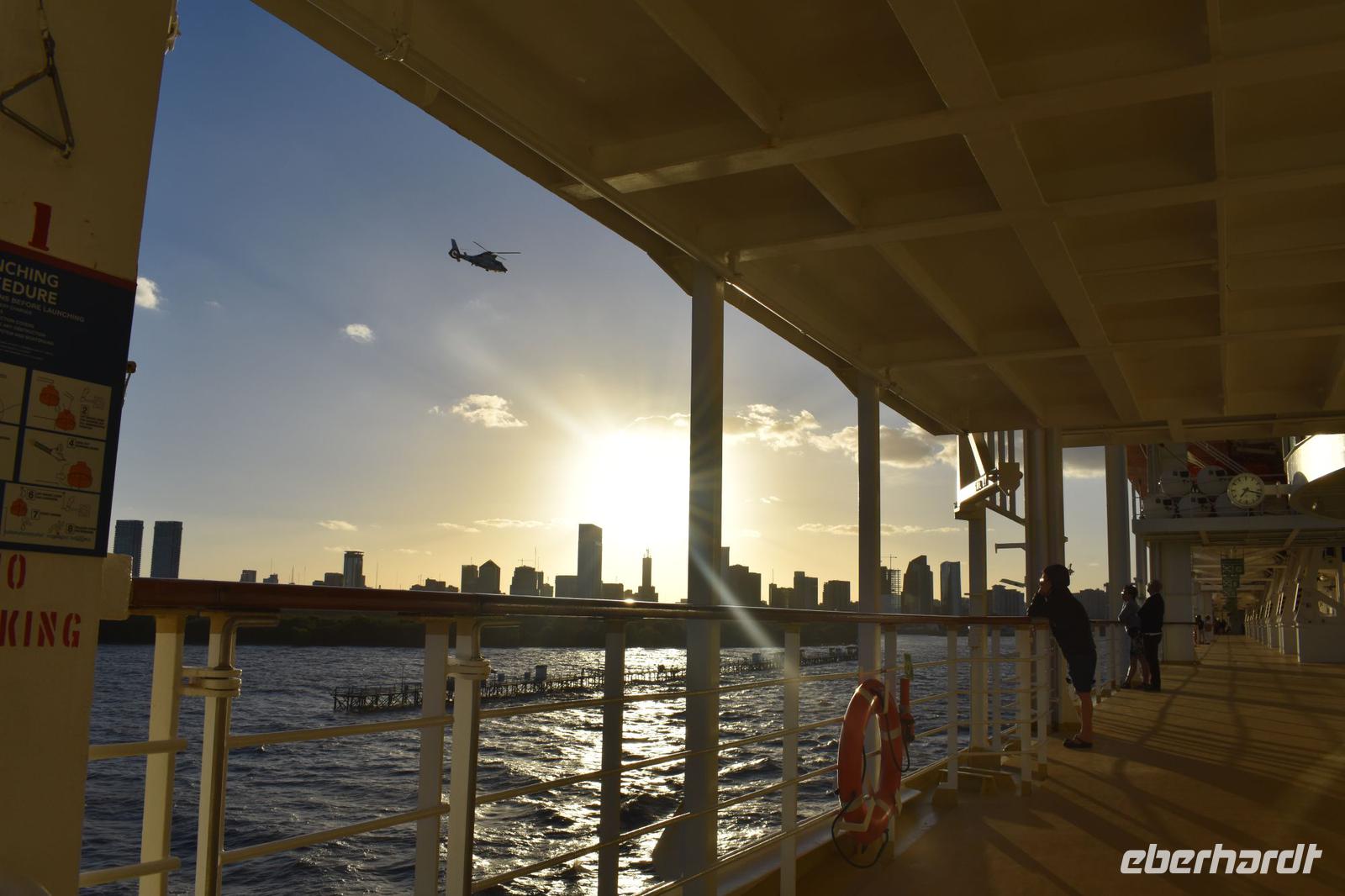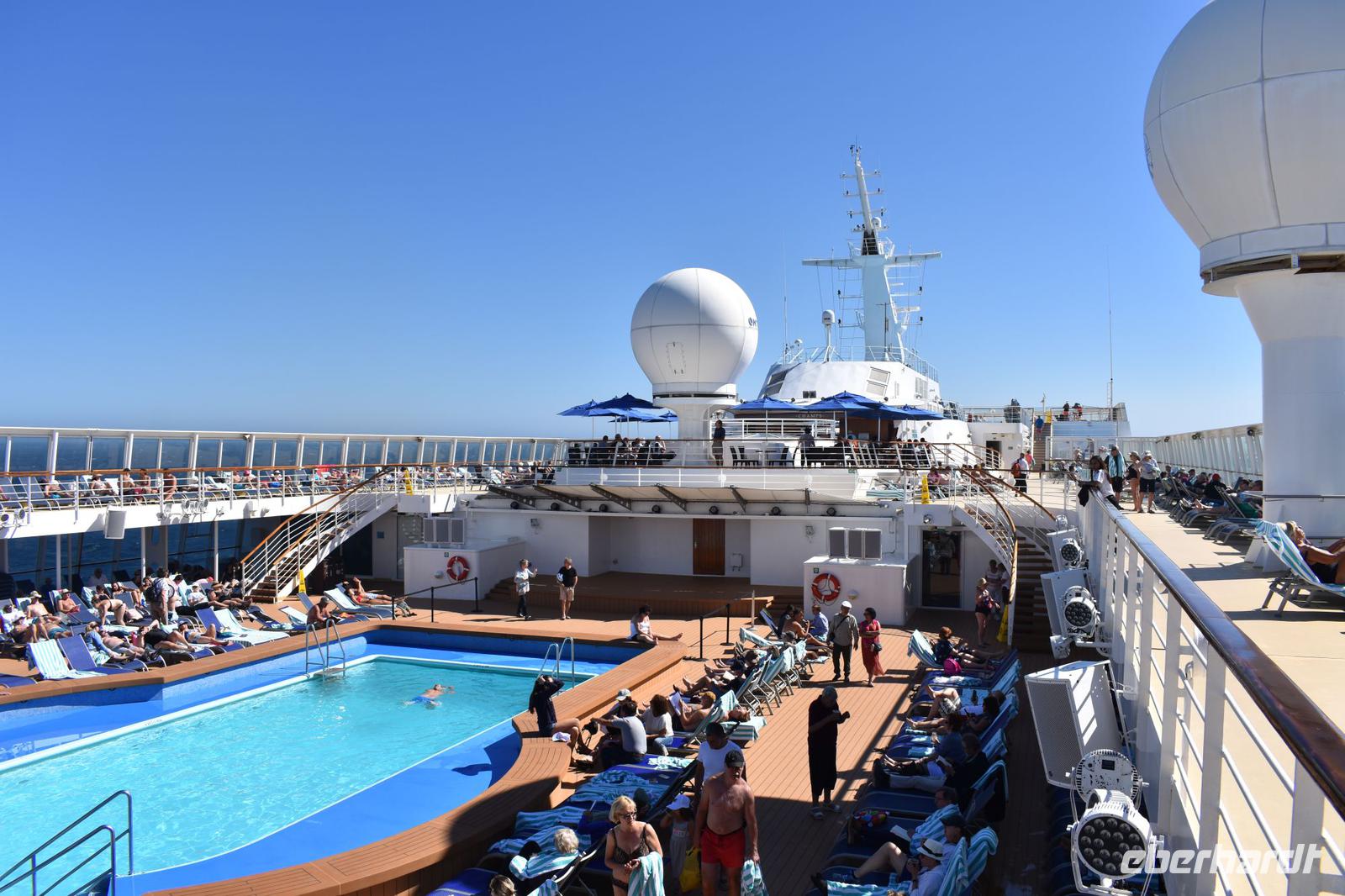 Für den heutigen Tag stand ein Seetag auf dem Programm. Die Sonne schien kräftig und man musste sich gut mit Sonnencreme einschmieren, damit man nicht verbrennt, sobald man sich auf dem Oberdeck aufgehalten hat. Aber es gab auch genügend schattige Orte wo man den ein oder anderen Cocktail genießen konnte, den man auch quasi Gratis im Getränkepaket mit inkludiert hatte. Langeweile konnte eigentlich nicht aufkommen, da das Schiffsprogramm mit über 100 Veranstaltungen einiges zu bieten hatte. Am Abend gingen wir gemeinsam in das á la carte Restaurant Seven Seas und genossen die leckeren Gänge.