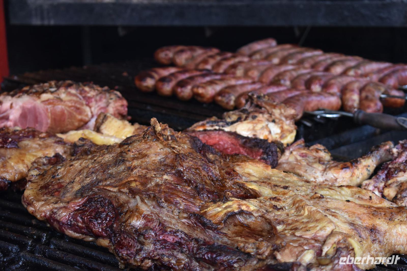 Nach dem Frühstück starteten wir mit dem Bus vom brasilianischen Foz do Iguacu in Richtung argentinische Grenze. Diese erreichten wir bereits nach zehn Minuten Fahrzeit und überquerten anschließend den Fluss Iguázu, der in Sichtweite in den Paraná mündete. An dieser Stelle konnten wir das Ufer dreier Länder auf einen Streich sehen - Brasilien, Argentinien und Paraguay. Nun erreichten wir aber auch die Grenzkontrolle der Argentinier. Nach mehr als einer Stunde warten waren alle Formalitäten abgeschlossen und wir konnten endlich passieren. Bis zu den argentinischen Wasserfällen kosteten wir ein Stück von einem paraguayischen Käse-Brot, genannt Chipa. Wir durften unsere Uhren noch um eine Stunde nach hinten stellen und kamen schließlich am Nationalpark Iguázu in Argentinien an. Mit der kleinen Bimmelbahn fuhren wir ein ganzes Stück durch den Park in Richtung Teufelsauge. Wir gingen dann zu Fuß weiter über die stählernen Plattformen. An dieser Stelle wurde einem die unglaubliche breite des Flusses richtig bewusst. Vorne auf der Plattform angekommen wurde man durch die Gischt des Teufelsauges eingeweicht und die Kameralinsen mal wieder vernebelt. Dennoch ist dieses ein absolut beeindruckender Ort und ein wahnsinniges Naturschauspiel des herabrauschenden Wassers. Als wir alle zurückgekehrt waren fuhren wir mit der Eisenbahn den halben Weg zurück, damit wir auch noch einen weiteren Pfad entlang der Wasserfälle besichtigen konnten. Jeder Aussichtspunkt, jede Abbiegung brachte eine neue spannende Perspektive auf die tosenden Wasserfälle. Dann mussten wir leider diesen magischen Ort verlassen und zum Flughafen fahren. Während des einchecken und auch während wir warteten ging drei Mal das Licht im gesamten Flughafen plötzlich aus, sprang zum Glück aber direkt wieder an. Der Betrieb lief weiter als wäre nichts gewesen. Doch war es schon ein bisschen erschreckend und beunruhigend. Aber am Ende verlief alles reibungslos und wir konnten wie geplant nach Buenos Aires, in Argentiniens Hauptstadt landen. Dort angekommen fuhren wir ins Hotel und von dort nur eine dreiviertel Stunde später zum Restaurant La Bisteca im angesagten Stadtteil Puerto Madero. An diesem Abend bekamen wir ein phänomenal leckeres Buffet serviert, was zum einen durch grandiose Qualität glänzte aber zum anderen auch fast keinen Wunsch offenließ. Am Grill wurden verschiedenste argentinische Fleischspezialitäten direkt auf den Teller geschnitten - Provecho!