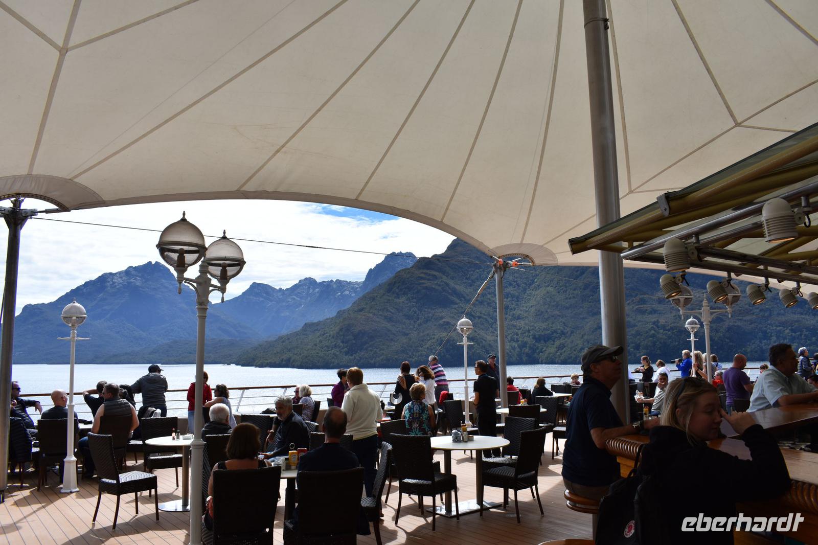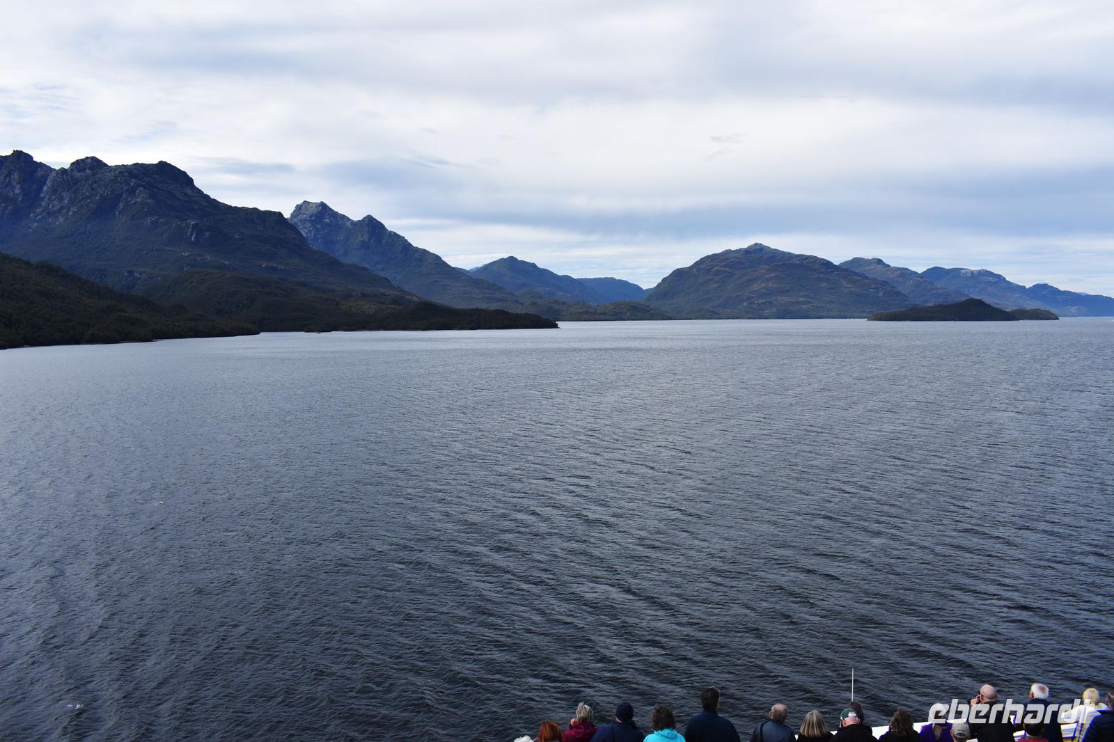 Vom offenen Meer sind wir dann wieder in eine Fjord-Straße eingebogen. Wir schipperten an der Isla Kent vorbei und zwischen Isla James und Isla Melchor hindurch. Eine herrliche Insellandschaft die viele begeistert hat. Nun wurde es auch wieder wärmer und man konnte im Pullover die Sonne genießen und das Panorama genießen.