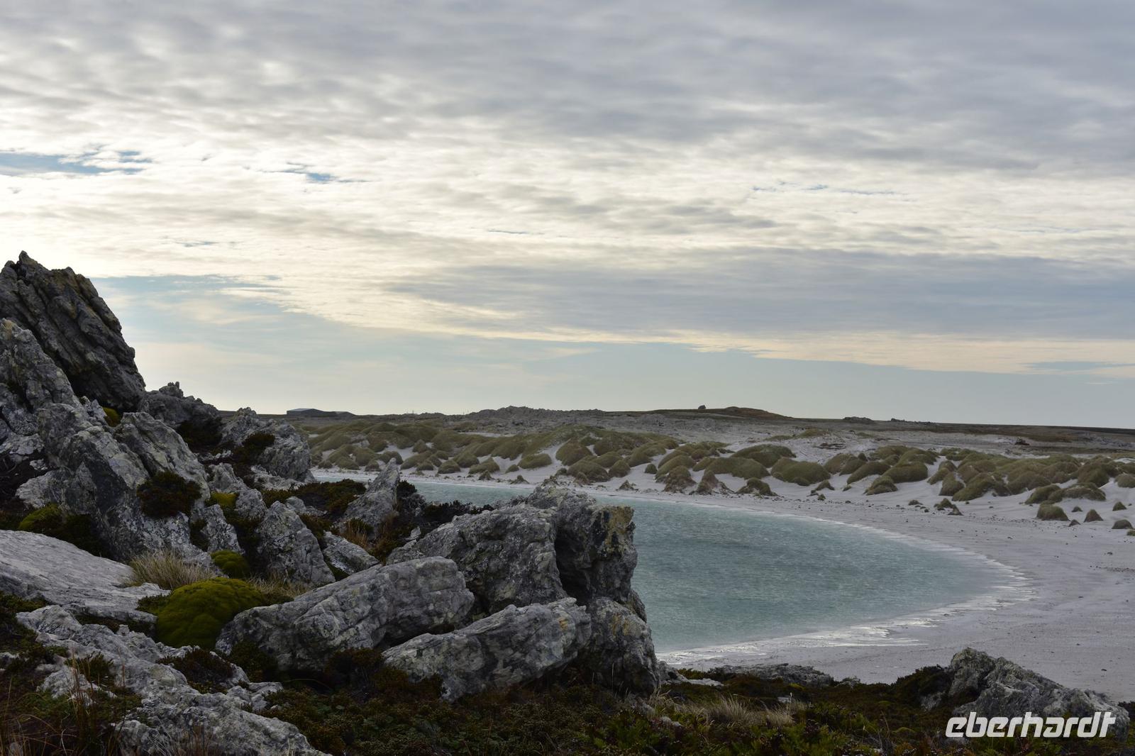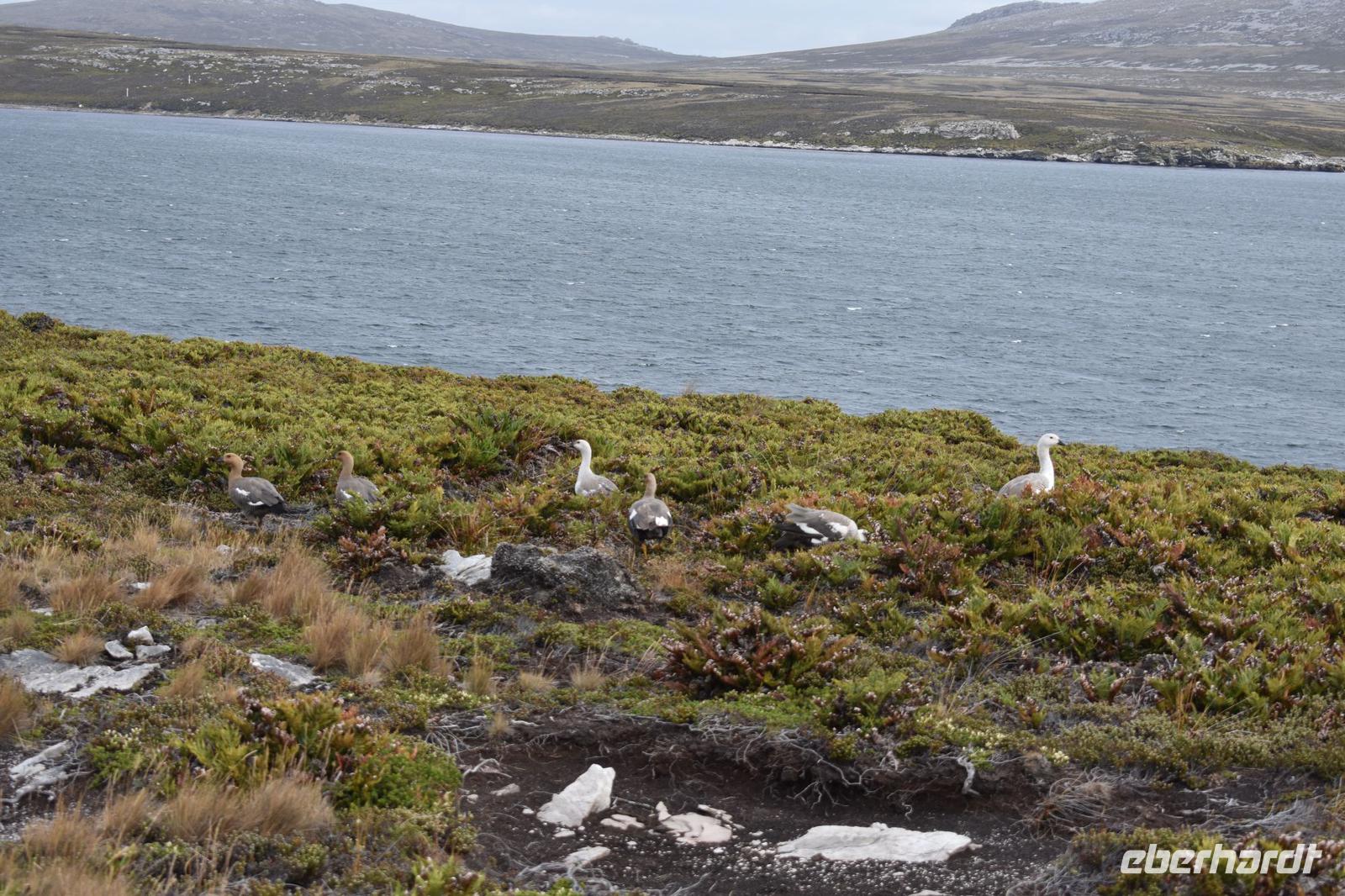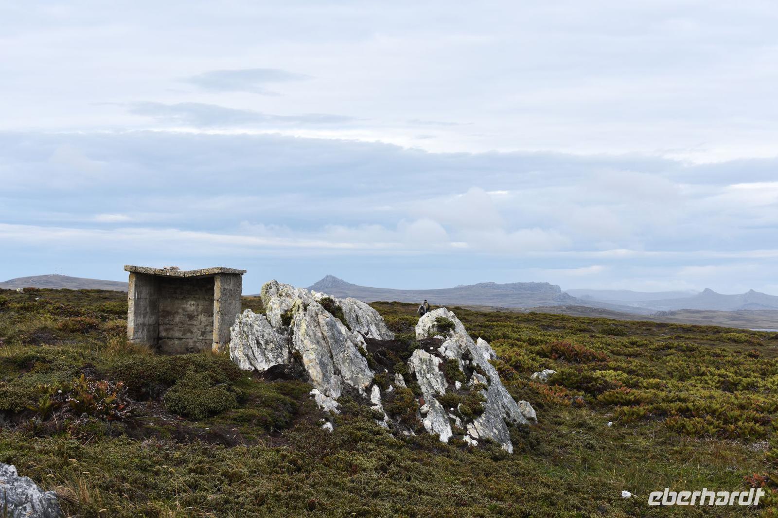 Die putzigen kleinen Kerlchen versteckten sich teilweise im hohen Gras oder hatten dort kleine Höhlen gegraben. Pinguin-Kolonien sammelten sich am nahezu weißen Sandstrand der Bucht. Die Küste war größtenteils mit flachen Pflanzen und Torf-Erde überzogen. Helle Felsen ragten in die Höhe. Auf der gegenüberliegenden Seite der Bucht kamen ein paar Sanddünen hervor die mit hellgrünem Gras bewachsen waren. Auf einer Anhöhe stand ein rostiges Artefakt aus kriegerischen Zeiten. Die Flugabwehrkanone (Flak) war teilweise zerfallen, eignete sich aber gut als Fotomotiv. Wir genossen die Landschaft und die Natur in der Nähe der Gypsy Cove. Wir beobachteten die Magellan-Pinguine und auch Magellan-Gänse waren zu sehen. Aus der Ferne sah man Stanley sowie unser Kreuzfahrtschiff in einer Bucht liegen.
