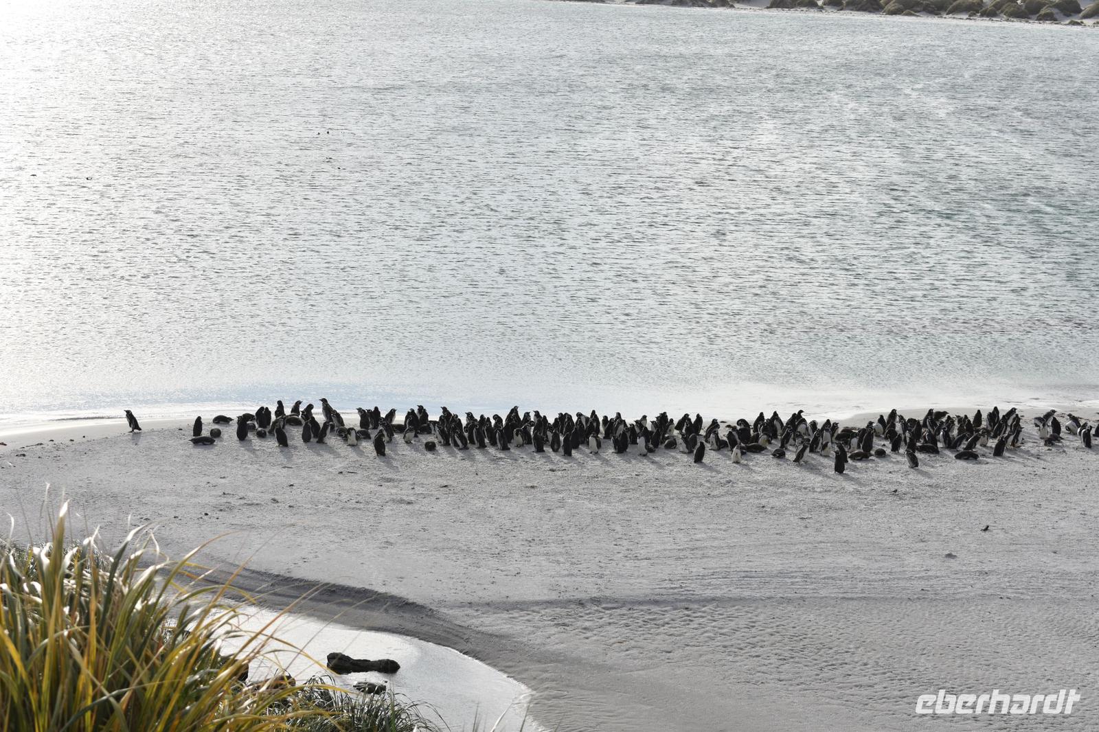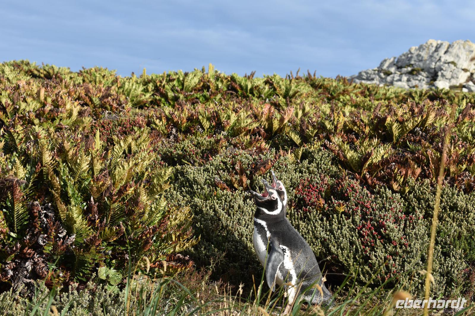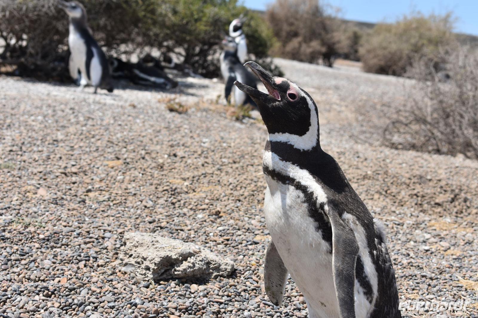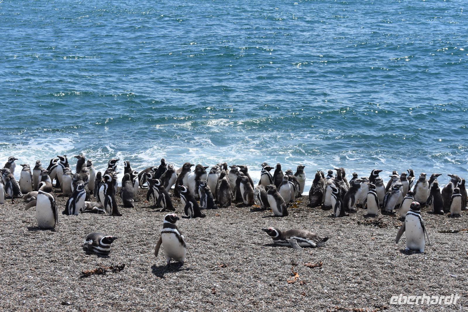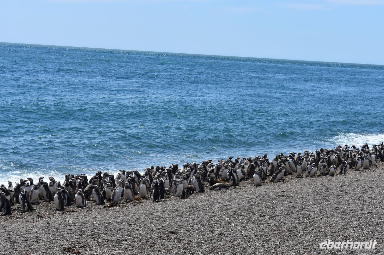 Jedoch desto näher wir dem Meeresufer kamen, so dichter wurde die Zahl der Magellan-Pinguine. Dann schließlich an dem Kiesstrand: Hunderte, Tausende, Hunderttausende, ja Millionen mussten es sein! Soweit man nur gucken konnte, dicht gedrängte Pinguine. Ein wirklich wunderbarer Anblick dieser äußerst gigantischen Pinguin-Kolonie verzauberte uns bei brennendem Sonnenschein.