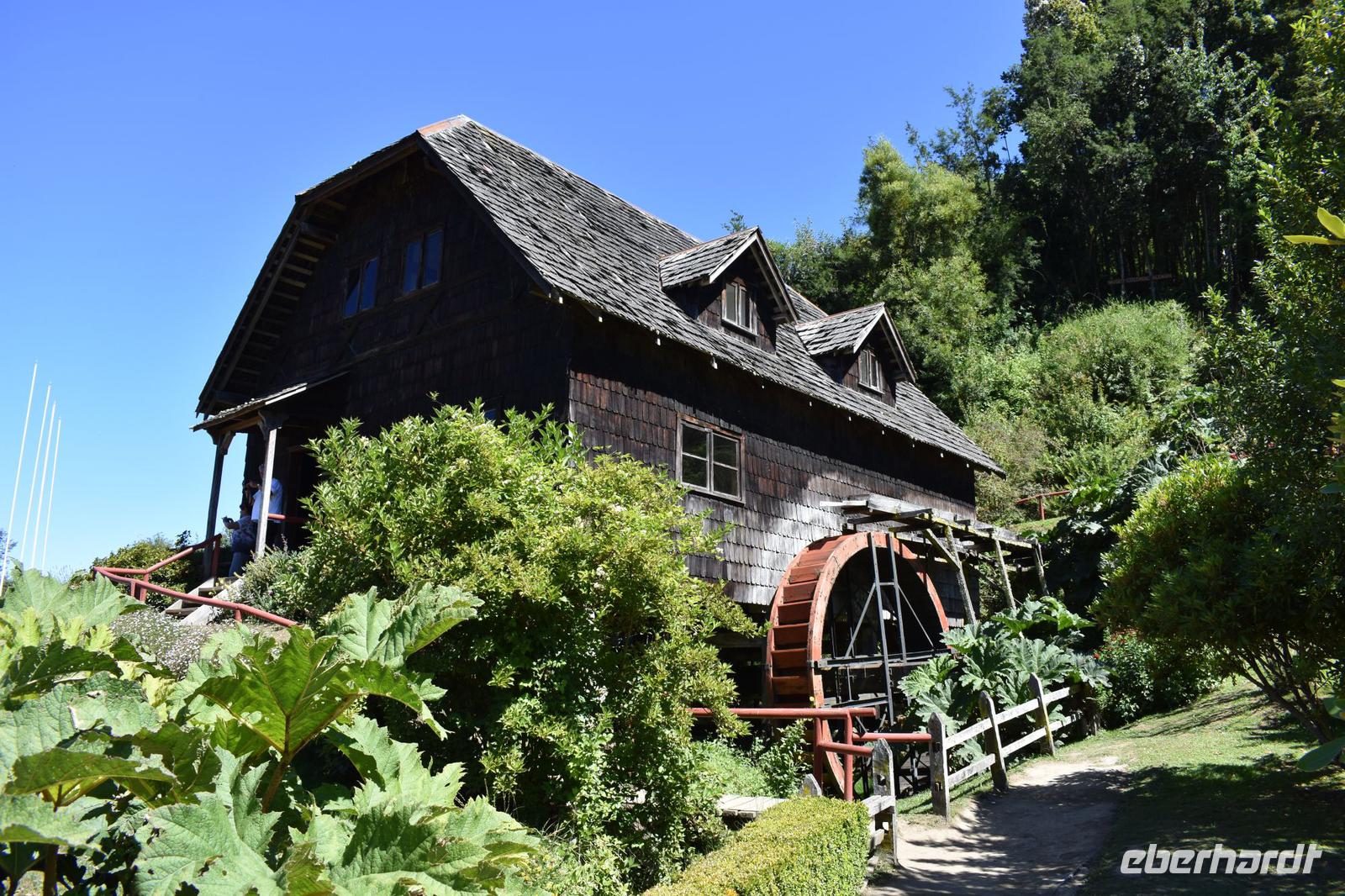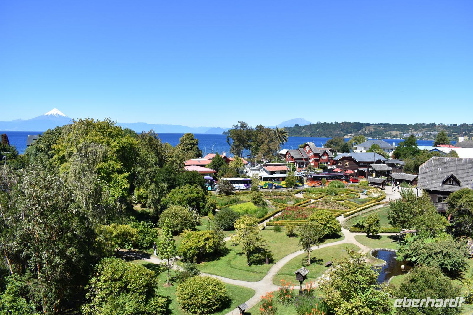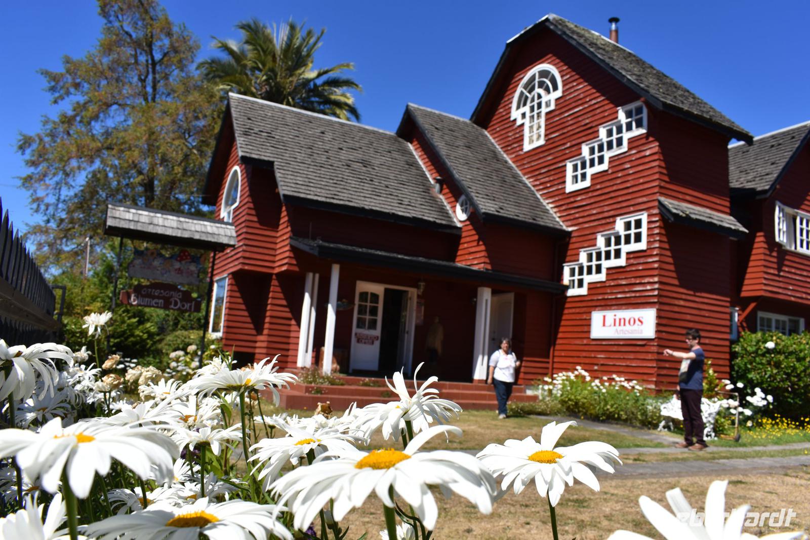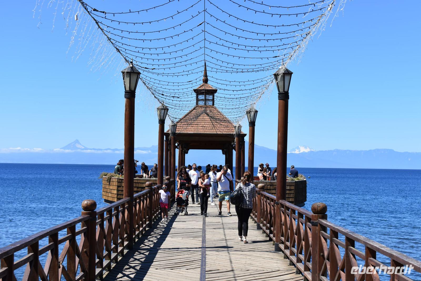 Vor dem Mittag fuhren wir nach Puerto Varas zurück und sahen uns diesmal die urige Plaza mit der anliegenden Hauptgeschäftsstraße an. An der Plaza wuchsen einige Ulmo-Bäume (Chilenische Scheinulme) die in voller, weißer Blüte standen. Genossen ein paar freie Minuten auf der Plaza und sahen uns auch den Hafen an, an dem ein paar witzige Schrott-Skulpturen positioniert waren. Es war sonnig und warm, vom See Llanquihue weht eine leichte Brise. Anschließend fuhren wir nach Frutillar, wo noch vieles ziemlich deutsch ist. Zahlreiche urige Holzhäuser, die mit deutscher Handwerkskunst im 19. Jahrhundert gefertigt wurden und teilweise liebevoll restauriert sind, hatte die Gemeinde für uns zu bieten. In einem deutschen Restaurant - „Club Aleman", gab es eine leckere Mahlzeit für uns. Nicht zu vergessen den Pisco Sour, den wir dort serviert bekamen. Ein typisches Getränk dieser Region, der mit einer Art Grappa, reichlich Zitrone und Zucker angemischt wird.