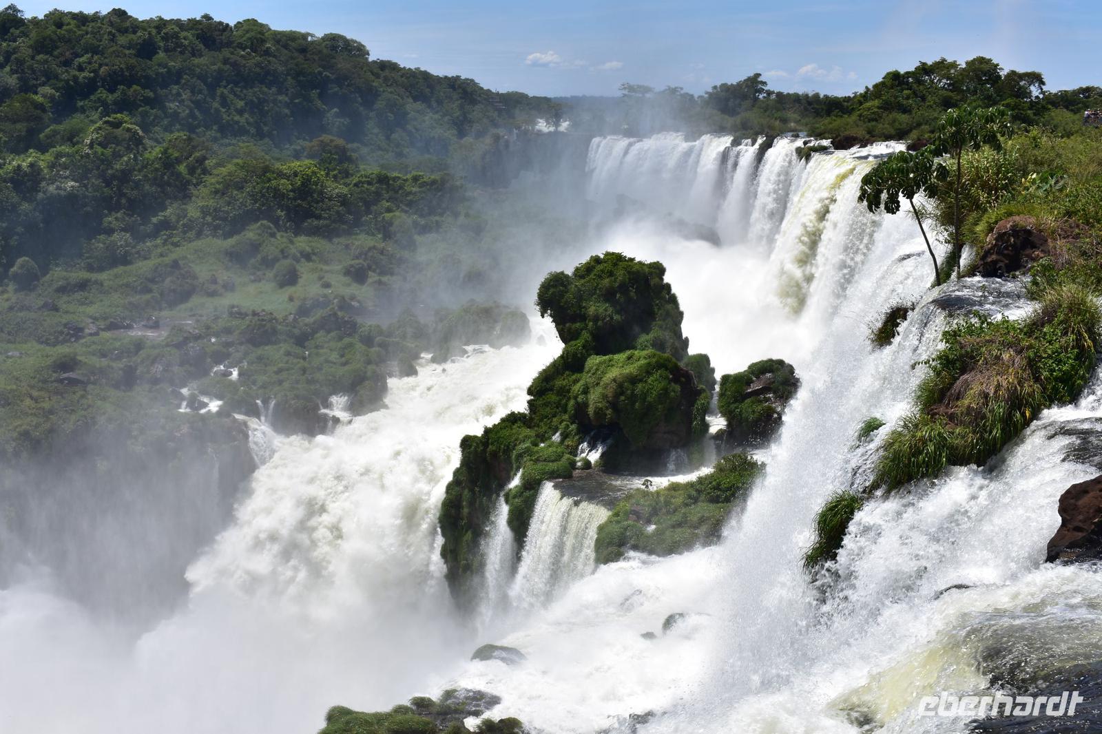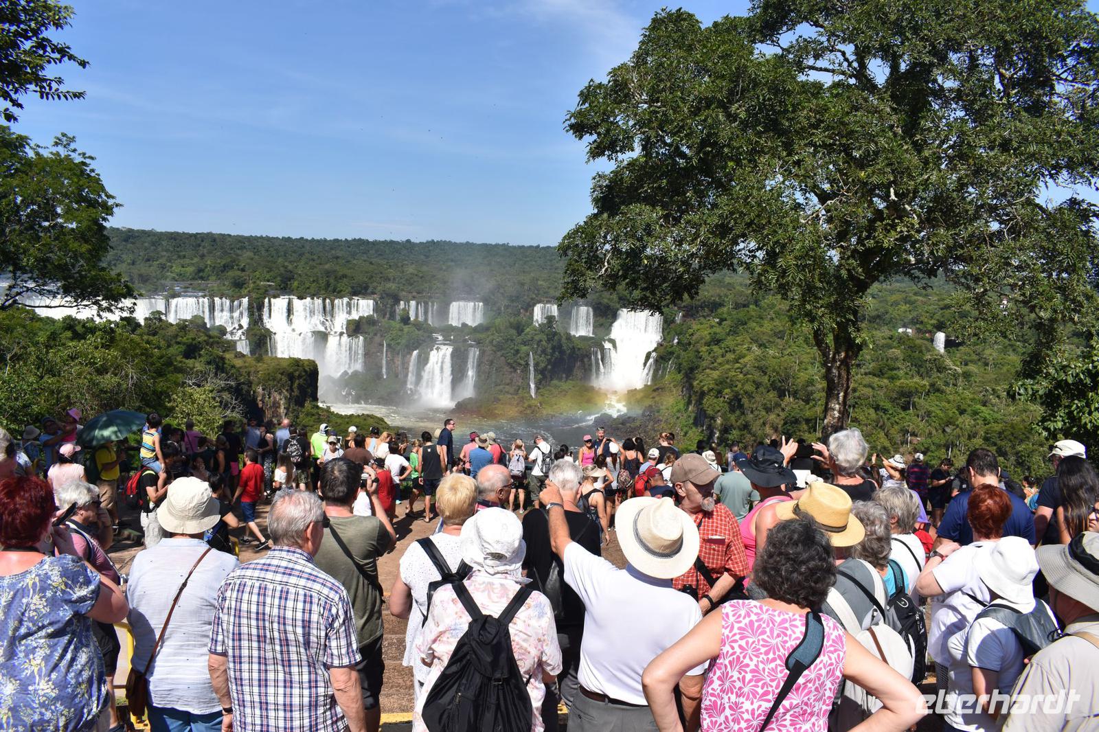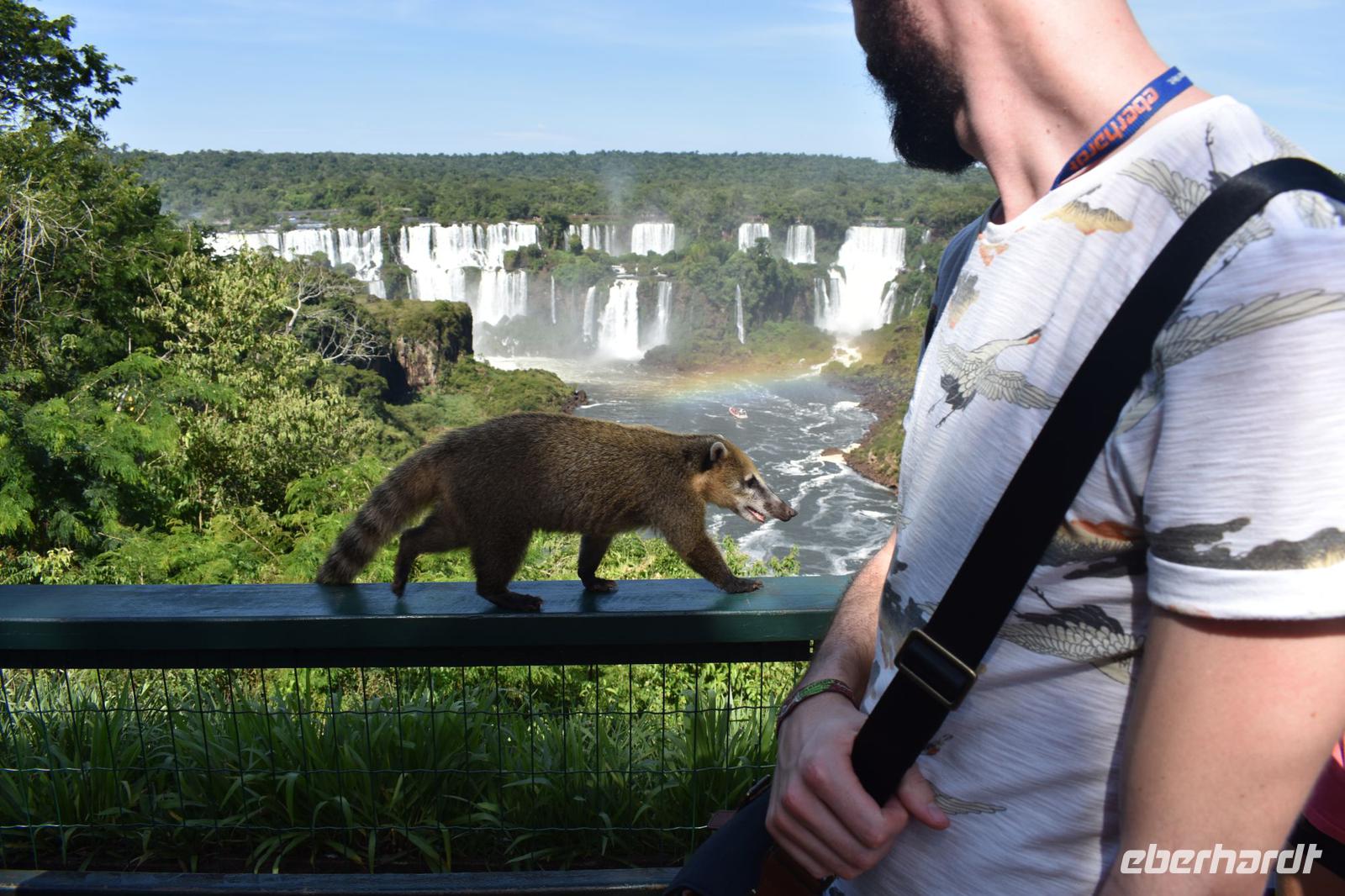 Mitten in der Nacht klingelte Wecker. Um halb fünf Uhr morgens gab es Frühstück, eine halbe Stunde später fuhren wir mit dem Bus zum Internationalen Flughafen von Rio de Janeiro. Mit der Airline Latam ging es in die 1.200 Kilometer entfernten Wasserfälle. Eduard, unser örtlicher Guide, empfing uns am Zielhafen. Wir fuhren direkt in den Nationalpark des Foz do Iguacu. Wir hatten prallen Sonnenschein über uns und das Wasser des Flusses war strahlend weiß. Mit Erstaunen gingen wir auf den Pfaden der brasilianischen Seite und genossen das gewaltige Herabstürzen der Wassermassen. Gut 1.500 m³ bis über 7.000 m³ die Sekunde, je nach Witterung, fallen rund achtzig Meter in die Tiefe. Auf einer Gesamtlänge von ca. zweieinhalb Kilometern sieht man tosende Gischt aufsteigen und man hört das Grollen der auf die Felsen prallenden Wassermassen. Alles umgeben von einem idyllischen Wald. Auf dem Weg in Richtung Teufelsauge nutzten wir die zahlreichen Aussichtspunkte für Foto- und Video-Aufnahmen. Und am Ende gab es noch eine erfrischende Dusche vom Wasserfall. Wir aßen eine Kleinigkeit zu Mittag, mussten aber gut aufpassen, dass uns unsere Mahlzeit nicht vom Teller geklaut wurde. Die Nasenbären, die wir uns auch auf dem gesamten Weg begleitet hatten, waren sehr gierig und ließen sich nur schwer vertreiben. Trotz dass sie so gierig auf unser Essen waren, sind sie doch sehr niedlich.