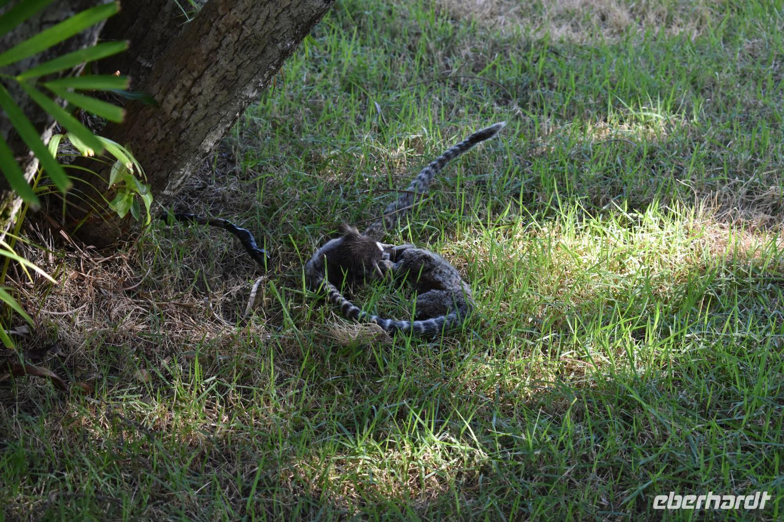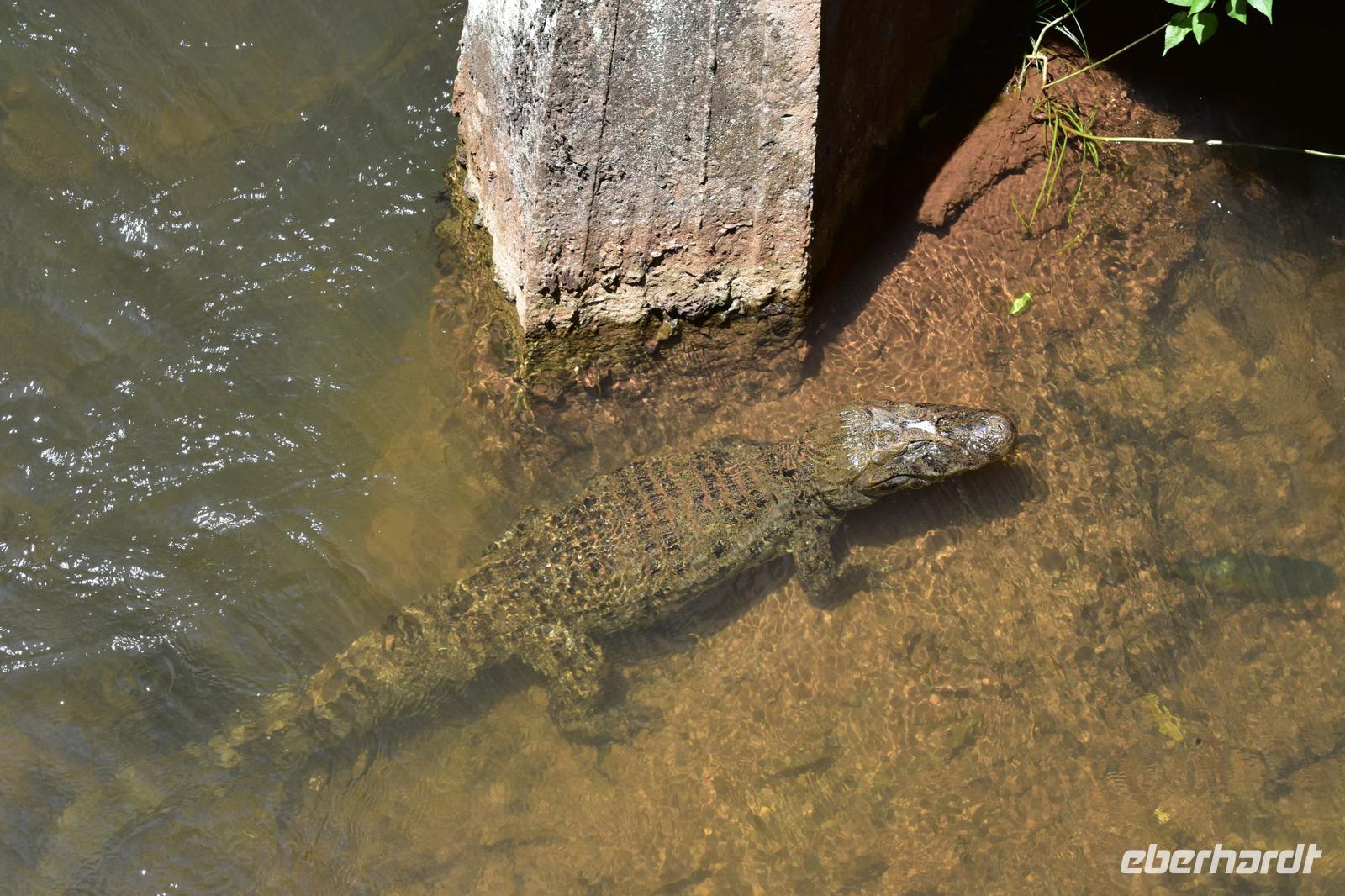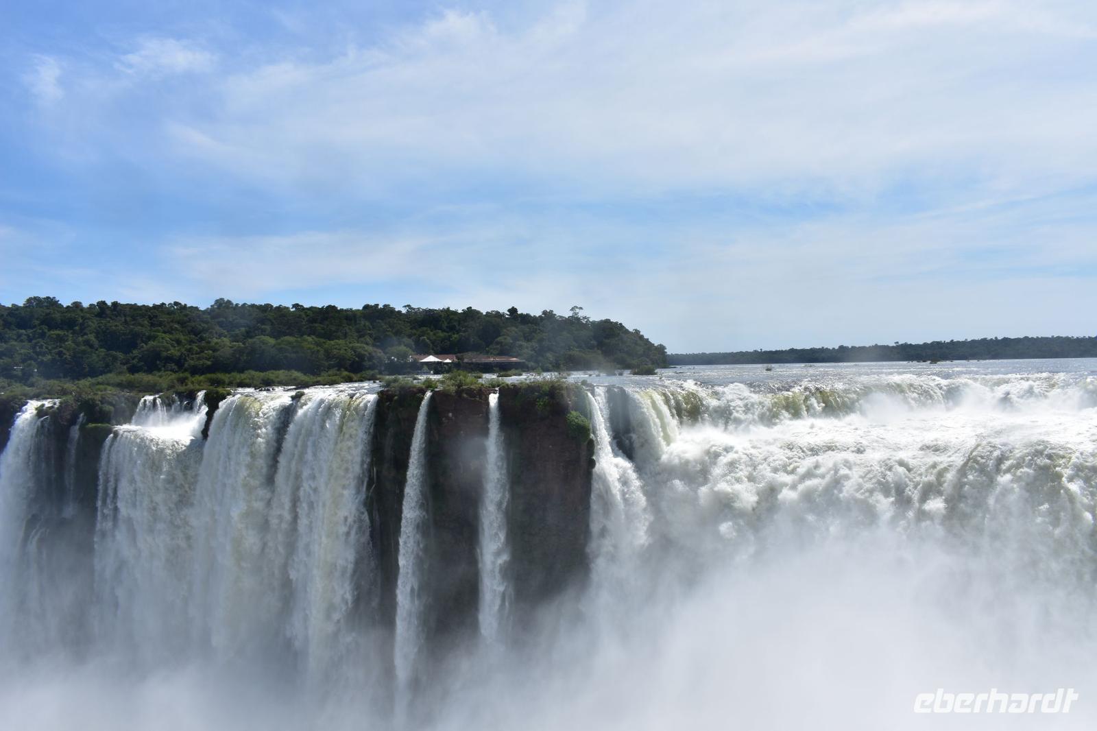 Mitten in der Nacht klingelte Wecker. Um halb fünf Uhr morgens gab es Frühstück, eine halbe Stunde später fuhren wir mit dem Bus zum Internationalen Flughafen von Rio de Janeiro. Mit der Airline Latam ging es in die 1.200 Kilometer entfernten Wasserfälle. Eduard, unser örtlicher Guide, empfing uns am Zielhafen. Wir fuhren direkt in den Nationalpark des Foz do Iguacu. Wir hatten prallen Sonnenschein über uns und das Wasser des Flusses war strahlend weiß. Mit Erstaunen gingen wir auf den Pfaden der brasilianischen Seite und genossen das gewaltige Herabstürzen der Wassermassen. Gut 1.500 m³ bis über 7.000 m³ die Sekunde, je nach Witterung, fallen rund achtzig Meter in die Tiefe. Auf einer Gesamtlänge von ca. zweieinhalb Kilometern sieht man tosende Gischt aufsteigen und man hört das Grollen der auf die Felsen prallenden Wassermassen. Alles umgeben von einem idyllischen Wald. Auf dem Weg in Richtung Teufelsauge nutzten wir die zahlreichen Aussichtspunkte für Foto- und Video-Aufnahmen. Und am Ende gab es noch eine erfrischende Dusche vom Wasserfall. Wir aßen eine Kleinigkeit zu Mittag, mussten aber gut aufpassen, dass uns unsere Mahlzeit nicht vom Teller geklaut wurde. Die Nasenbären, die wir uns auch auf dem gesamten Weg begleitet hatten, waren sehr gierig und ließen sich nur schwer vertreiben. Trotz dass sie so gierig auf unser Essen waren, sind sie doch sehr niedlich.
