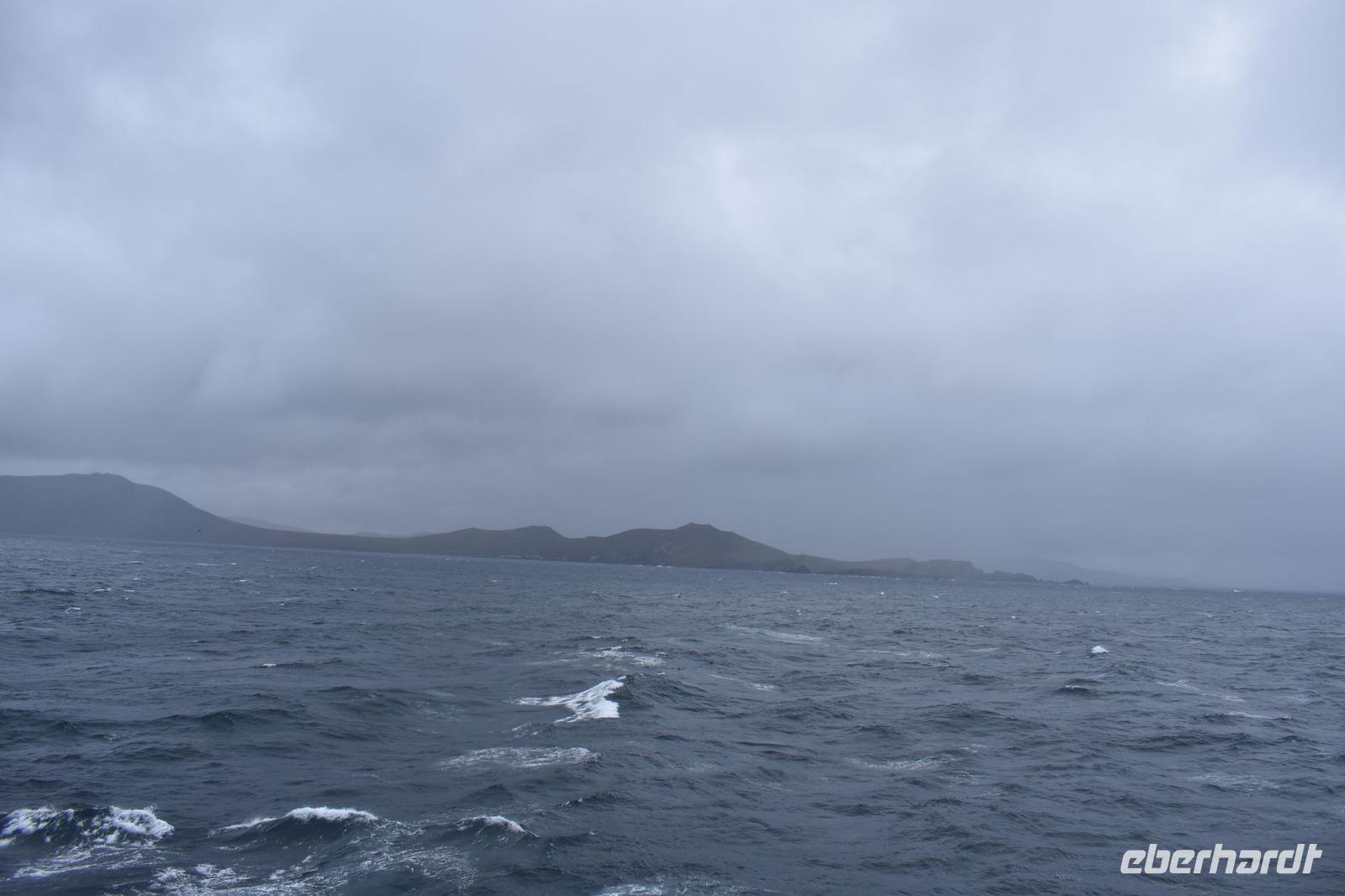 Früh am Morgen wurden wir von einem Sturm überrascht. Das Schiff schwankte schon ganz ordentlich. Sechseinhalb Meter hohe Wellen brachten unseren Kreuzer ziemlich zum Schwanken. Das gehen an Bord viel sehr schwer. Man musste gut aufpassen und sich gut an den Geländern festhalten. Man musste sich auch der eigenen Gewichtsveränderung bewusst sein, die durch zu und Abnahme der G-kräfte entstand. Durch das verstärkte auf- und abschwingen wurde nicht nur der eigene Körper durcheinandergebracht, sondern auch Schränke und Schubladen gingen immer wieder auf und zu. Flaschen vielen um, und auch die Übersichtskarte und Bordkamera viel vorübergehend aus.