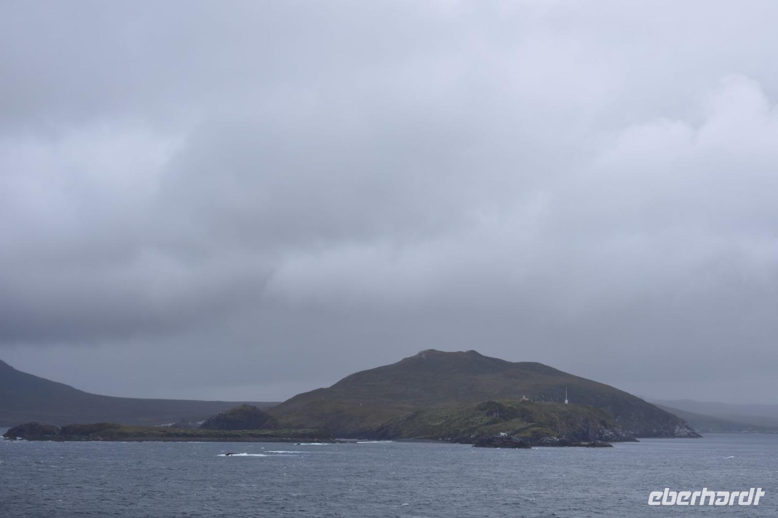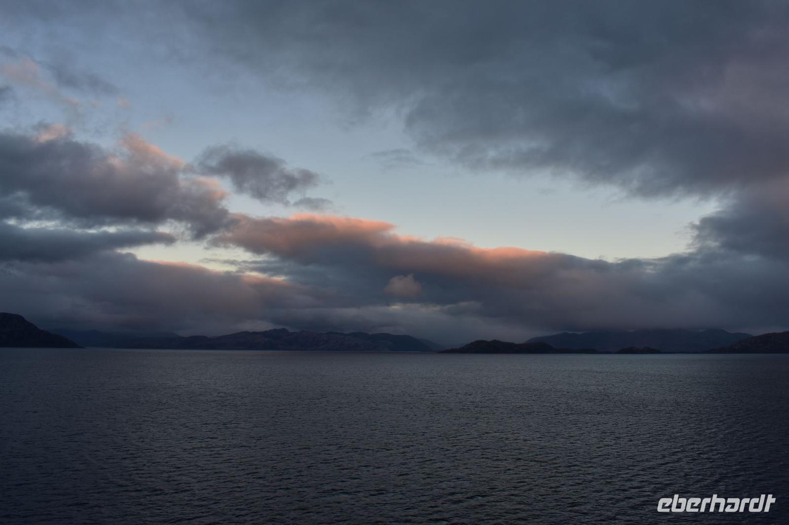 Durch das starke Schwanken des Schiffes wurde mein Gleichgewichtsorgan ganz schön verwirrt. Als Seemanns-Greenhorn konnte ich daher den Vormittag nur in der waagerechten ertragen. Gegen Mittag fuhren wir aber wieder in ruhigere Gewässer und „retteten" uns in einen der zahlreichen Fjorde. Wir fuhren durch schmale Kanäle, ein wenig zick-zack, durch wunderschöne Bergpassagen hindurch. Man sah steile, felsige Küsten, aber auch kleine Kiesstrände, bewaldete Ufer und Hügel sowie gelegentlich etwas Schnee auf den Bergspitzen.
