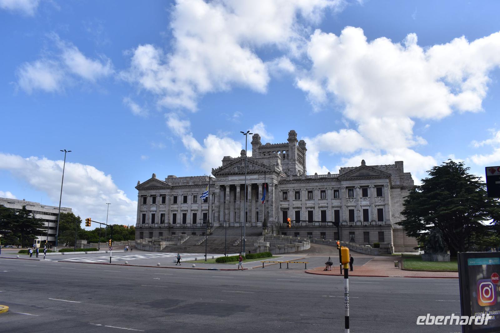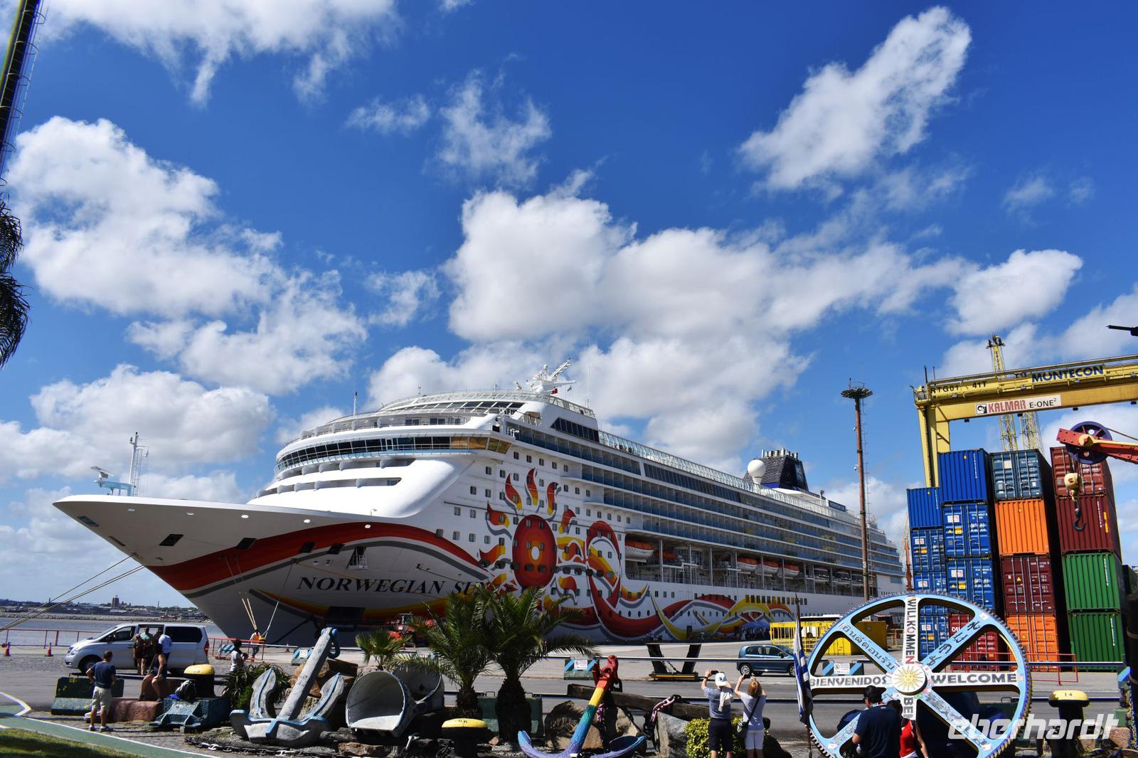 Gegen 9 Uhr gingen wir von Bord der Norwegean Sun und stiegen in den Bus. Der Uruguayer Matías empfing uns herzlich. Als erstes fuhren wir an Teilen der Graf Spee vorbei, einem alten deutschen Kriegsschiff das hier vor der Küste Uruguays auf dem Rio de la Plata gesprengt wurde. An der Plaza de Independencia hatten wir unseren ersten Ausstieg. Wir konnten das alte und neue Regierungsgebäude sehen sowie den Palacio Salvo, der einst höchstes Gebäude Südamerikas war und als ein Hotel errichtet wurde. Eine halbe Stunde später waren wir am Parlamentsgebäude, welches eindrucksvoll dastand, wie man sich eben so ein Parlamentsgebäude vorstellt. Doch die tolle Fassade ist aus italienischem Travertin und die Fensterrahmung mit deutscher Eiche gefertigt. Alles wurde mühselig aus Europa importiert. Von unserem Fotopunkt konnten wir auch den oberen Teil des Antel-Turms sehen. Mit seiner segelartigen Krümmung erinnert dieser beispielsweise an das Bauwerk Burj al Arab in Dubai, was aber sonst keine weiteren Gemeinsamkeiten aufweist. Das Gebäude in Montevideo hat der kanadisch-uruguayische Architekt Carlos Ott entworfen.
