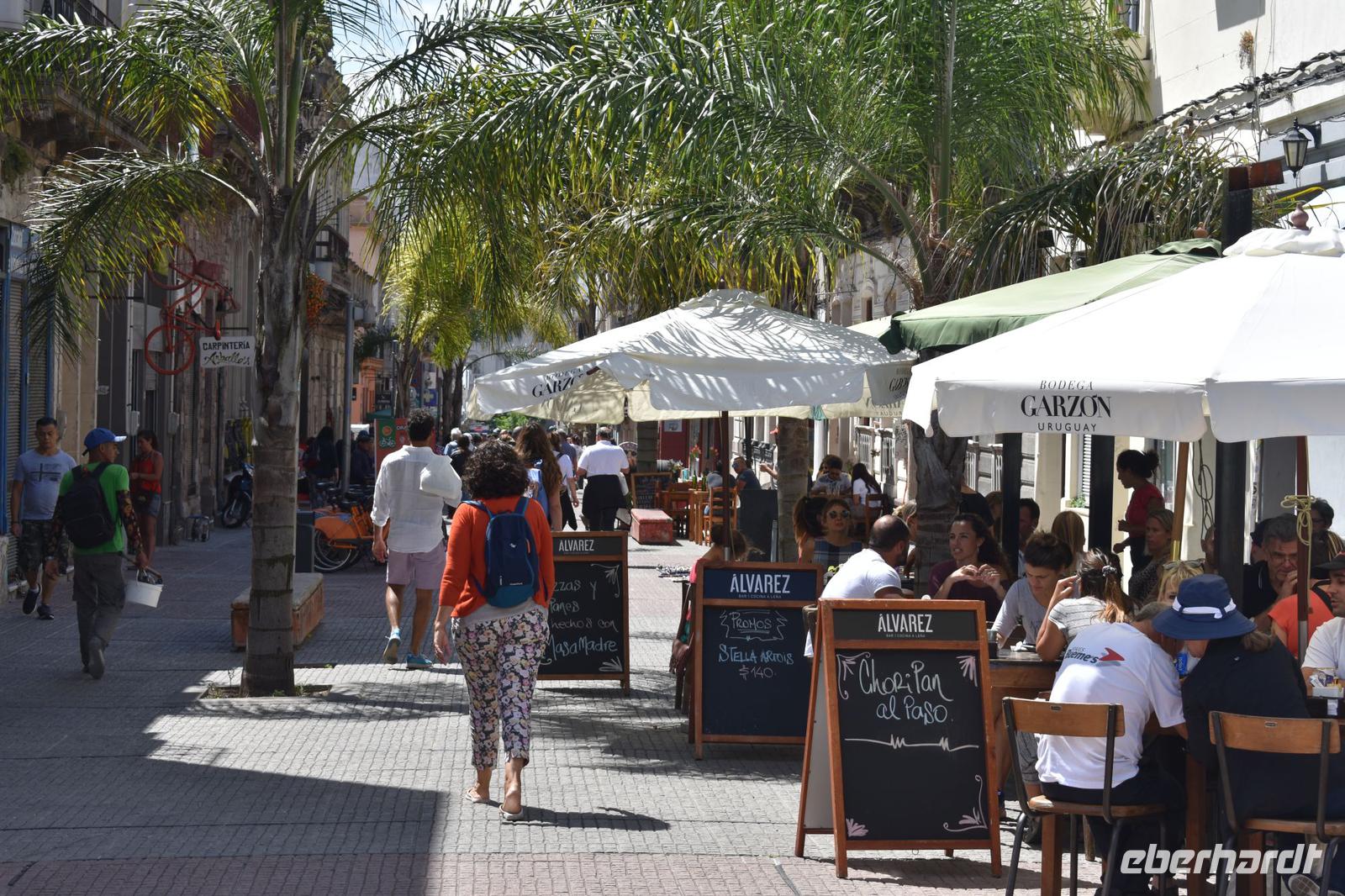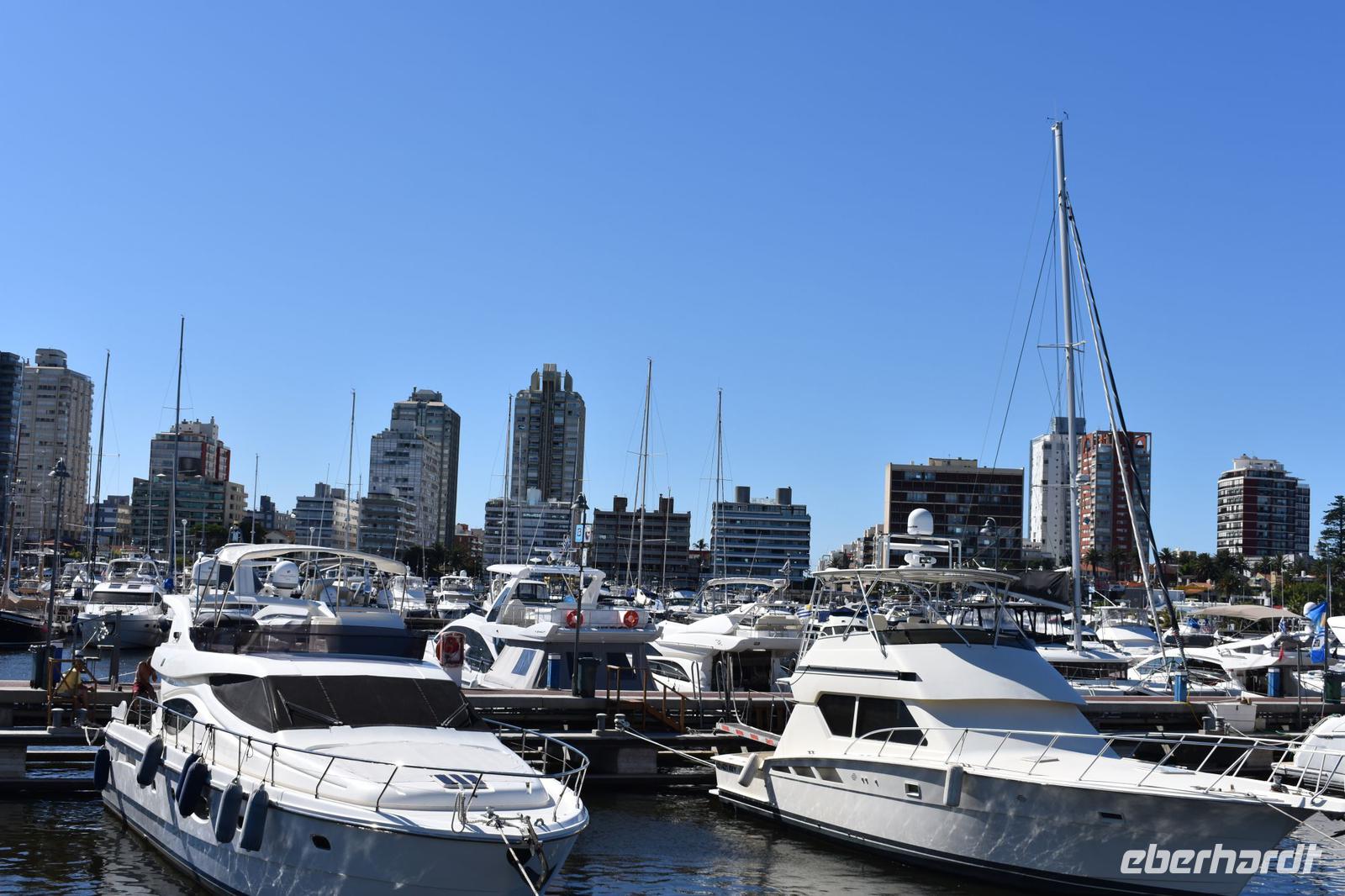 Die meisten unserer Reisegruppe hatten heute keinen Ausflug gebucht. Dennoch verließen wir das Schiff mit Tenderbooten gegen 9 Uhr. Im Hafen von Punta del Este angekommen schlenderten wir an den Yachten vorbei und gingen in Richtung Stadt. An der Touristeninformation, in der bunten Einkaufs- und Restaurantstraße Juan Gorlero, versorgten wir uns mit ein wenig Kartenmaterial.