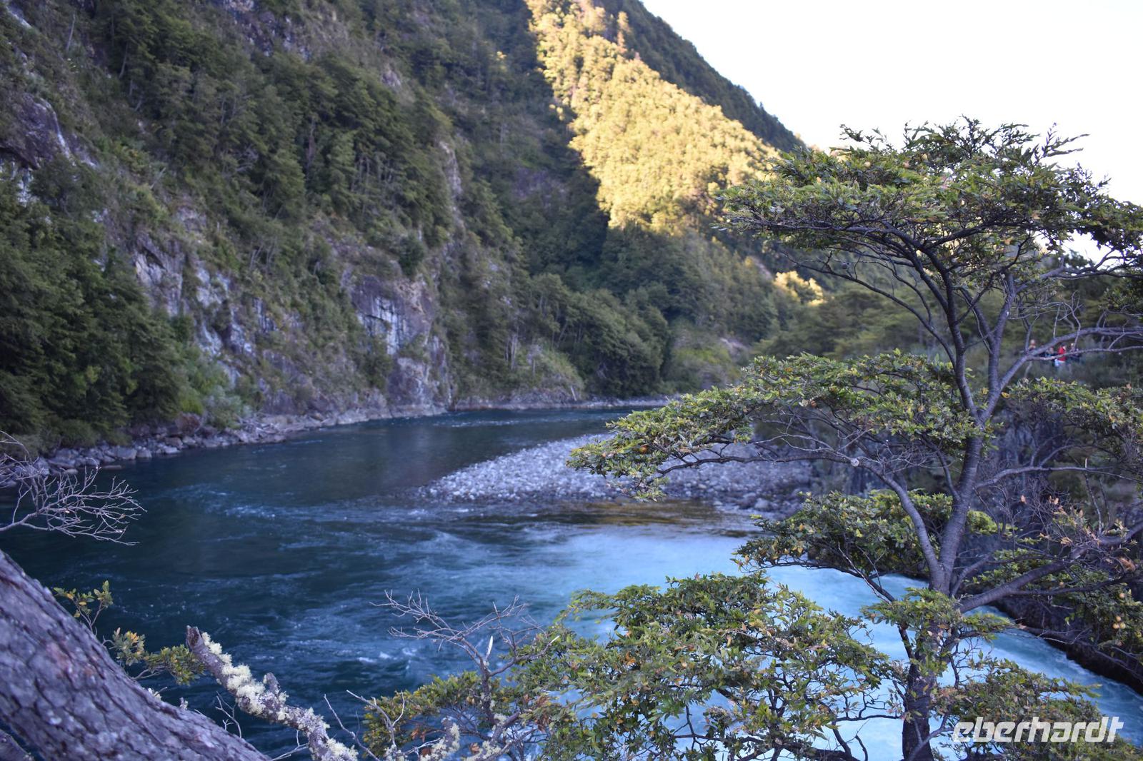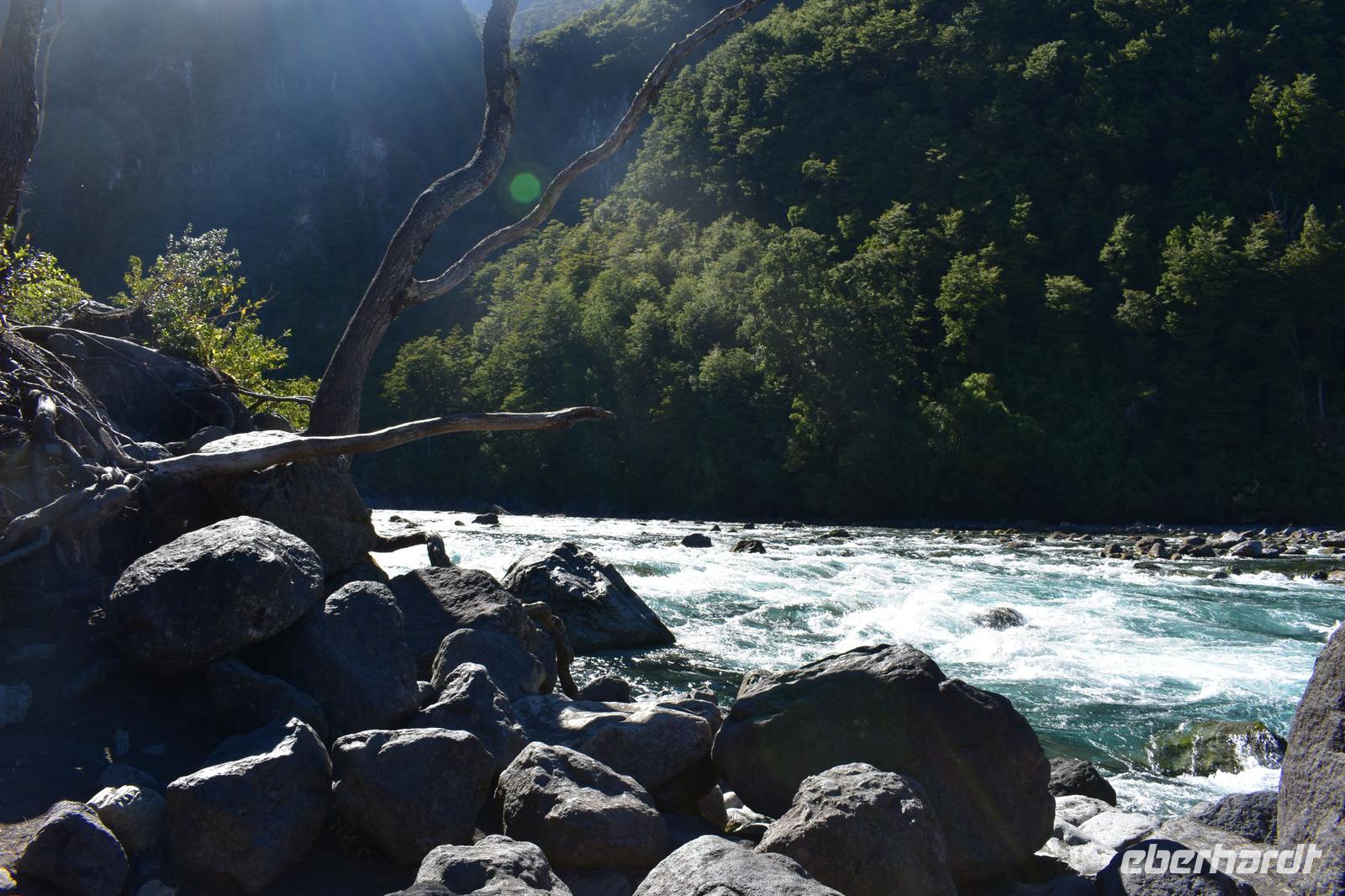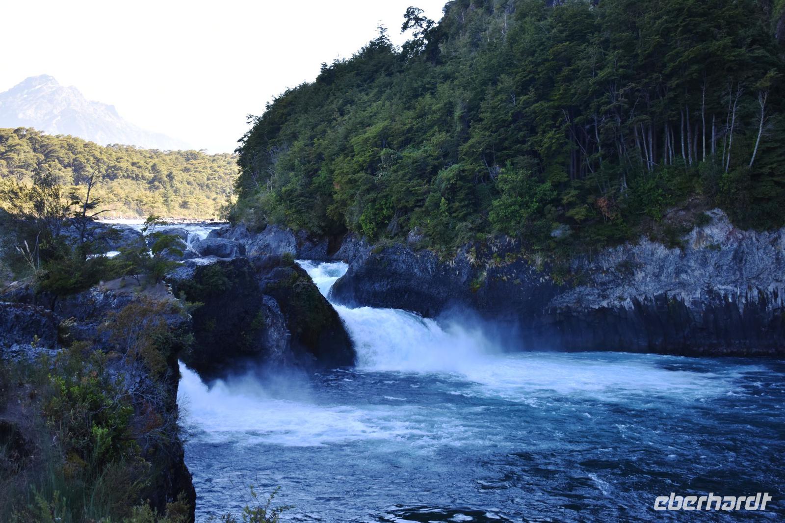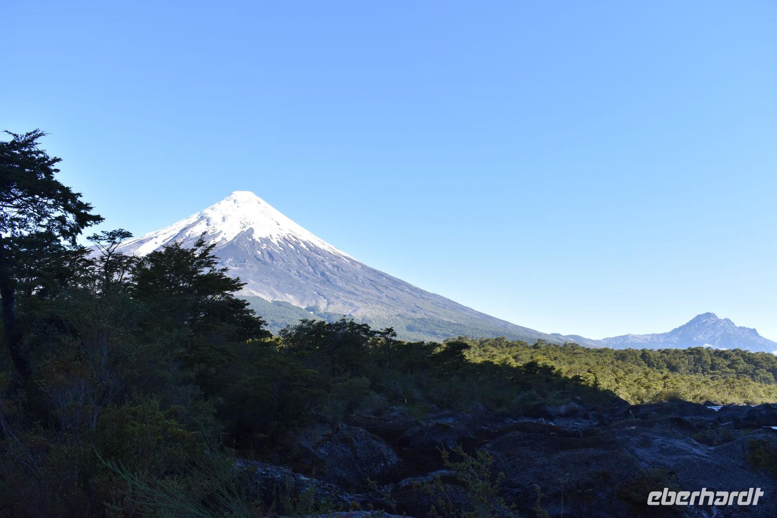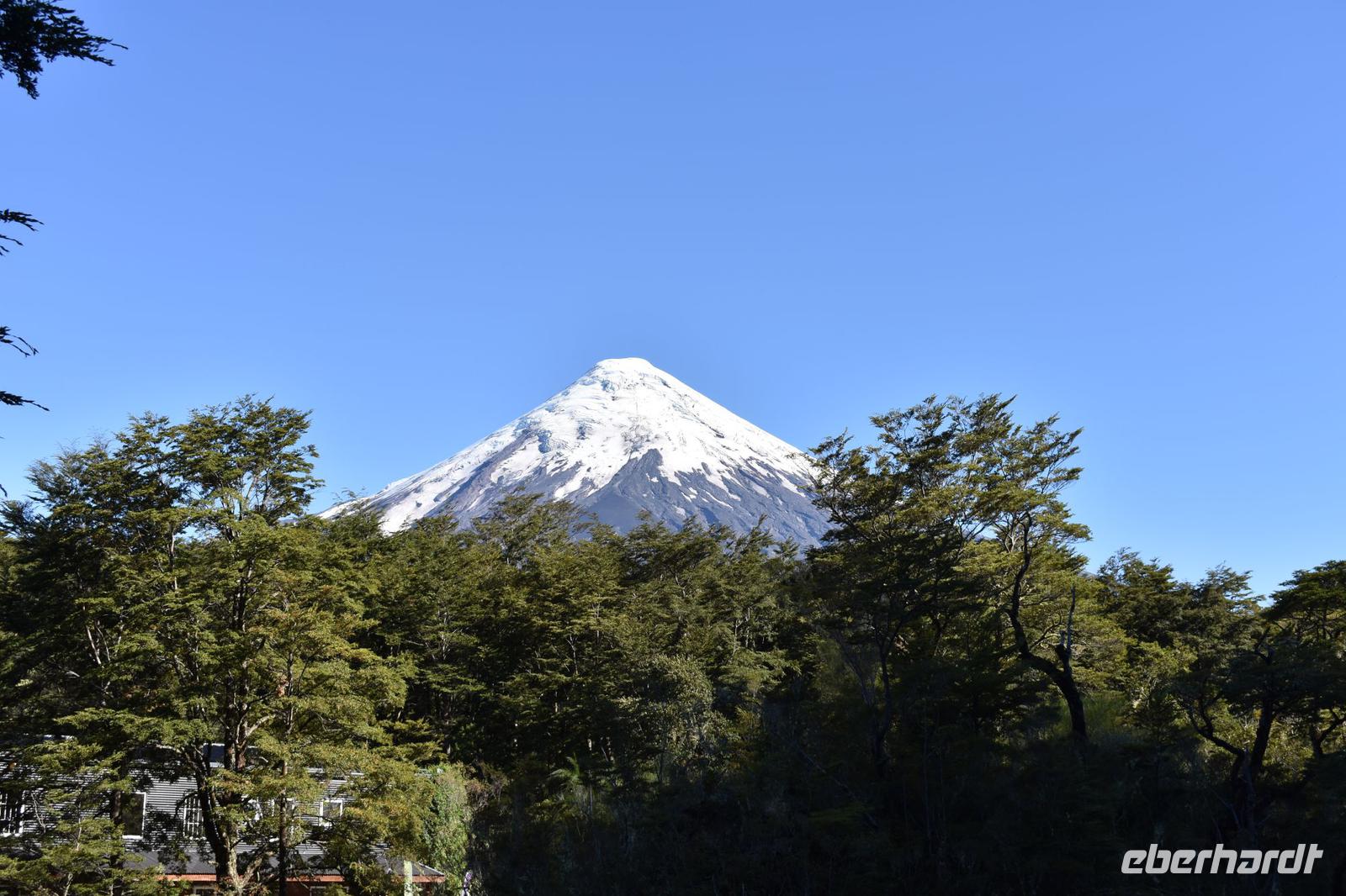 Mit dem Bus fuhren wir durch Puerto Varas, dann am Llanquihue See vorbei, einem großen Gletschersee. Die Gegend war hier wunderbar grün, was daran lag, dass wir im Gebiet eines valdivianischen Regenwaldes waren. In den Ausläufern der Anden, waren wir auf dem Weg nach Petrohue - einem reißenden Wasserfall, der sich zwischen tiefgehende Lavaspalten seinen Weg bahnt. Der im Nationalpark Vicente Pérez Rosales gelegene Fluss Rio Petrohué ist umrahmt von einem Fels-Massiv und grandiosem Wald. Wir sind umgeben von einem herrlichen Bergpanorama. Der krönende Abschluss dieser umwerfenden Gegend, sind zahlreiche Vulkane, die herrlich-schön emporragen. Wir sind umringt von Vulkanen. Der Calbuco Vulkan mit 2.003 Meter Höhe, etwas flacher geschnitten als die anderen, da er sich erst 2015 die Spitze abgesprengt hatte und eine riesige Rauchwolke spuckte - Stephanie zeigte uns Fotos. Der Osorno Vulkan, mit 2.652 Metern, ist für mich der schönste, vielleicht spektakulärste Vulkan. Er ist zuletzt 1869 ausgebrochen und seine Lava war flüssiger als die des Calbuco, was dazu führte das die Spitze nicht abgesprengt wurde. Somit ragt nun ein spitzer, weißer, schneebedeckter Kegel in der Landschaft hervor. Am Fuße wurde er von einer seichten Nebeldecke umrahmt. Und wunderschönes Bild! Heute besteht sogar die Möglichkeit auf diesem Vulkan Ski zu fahren - wirklich genial.