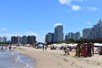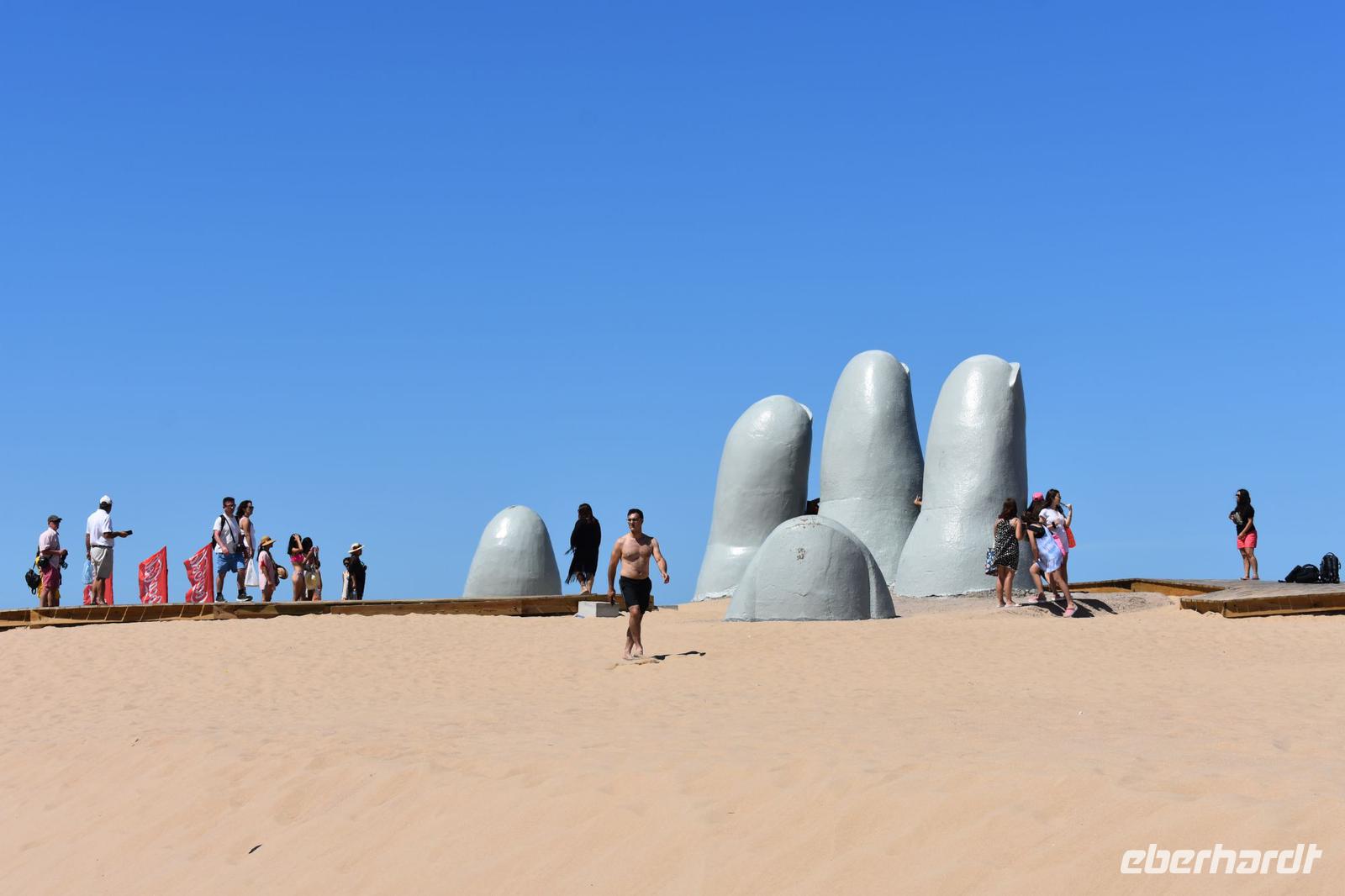 Wir spazierten gemütlich die geradlinige Straße entlang, bis wir zum Playa Los Dedos kamen, wo sich auch ein bekanntes Kunstwerk befindet. La Mano - die Hand, ist ein sehr beliebter Fotopunkt. Einige drängen sich um ein Foto mit dem Kunstwerk zu bekommen, die einem aus dem Sand erhebt. Es weht eine angenehme Brise und zahlreiche Surfer genießen die kräftigen Wellen, die auf dieser Seite des Strandes aufschlagen. Hier verstreuen wir uns, gehen in ein Café, bummeln durch die Straßen, shoppen oder suchen das erfrischende Nass auf. An der Playa Mansa fanden wir ein schattiges Plätzchen. Das Wasser auf dieser Seite war sehr ruhig und lud zu einem Erfrischungsbad ein. Gegen Mittag konnte man eines der zahlreichen Beach-Restaurants aufsuchen und sich von internationaler oder auch uruguayischer Küche überraschen lassen.
