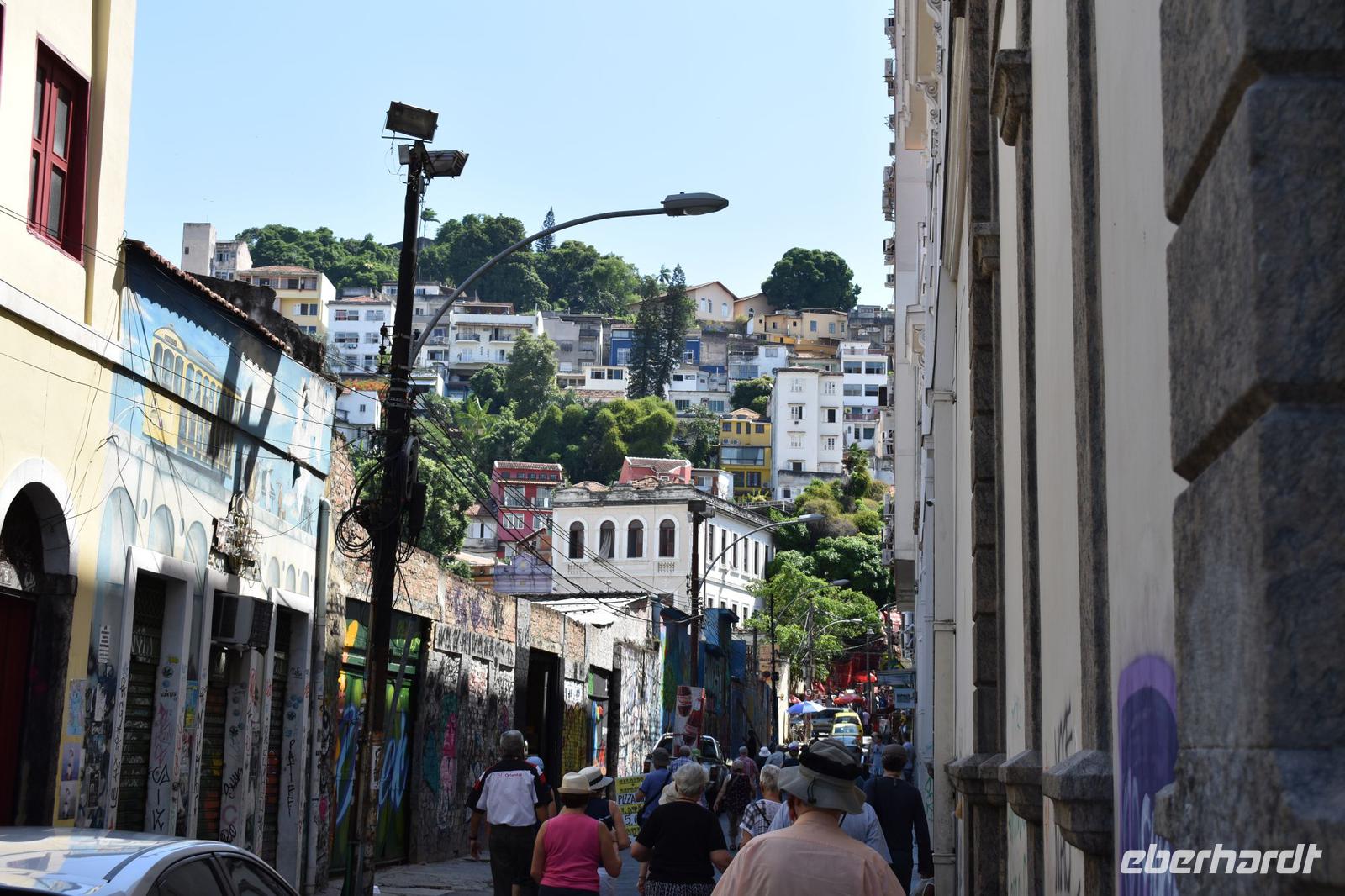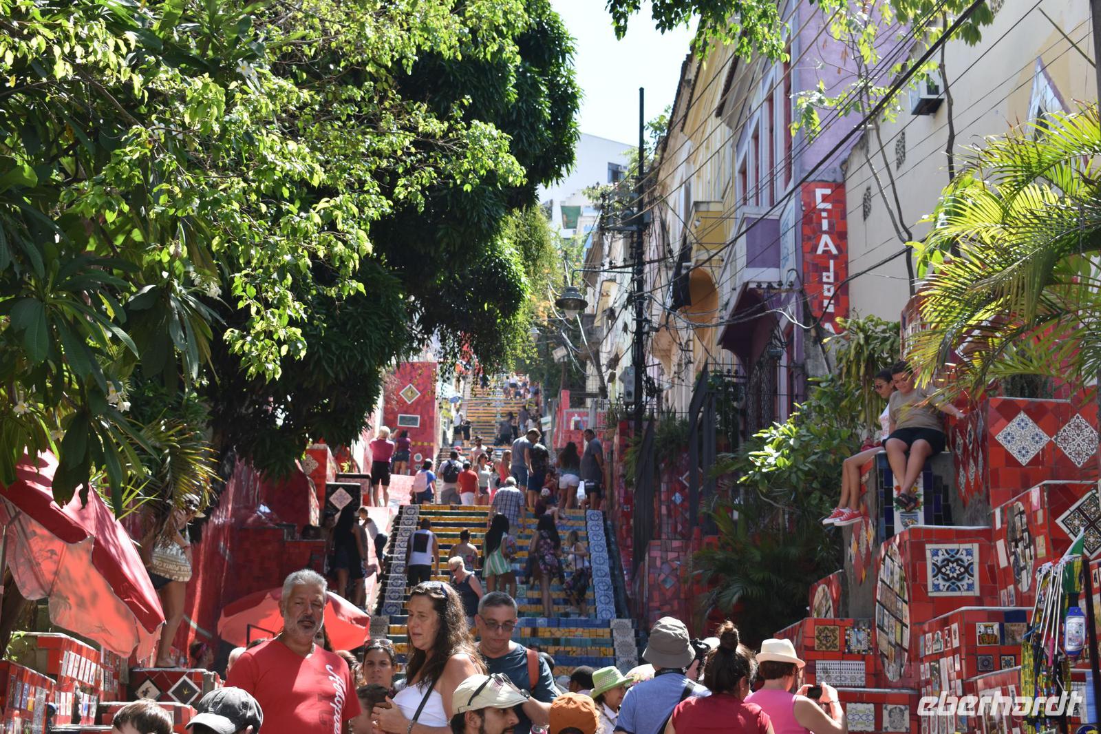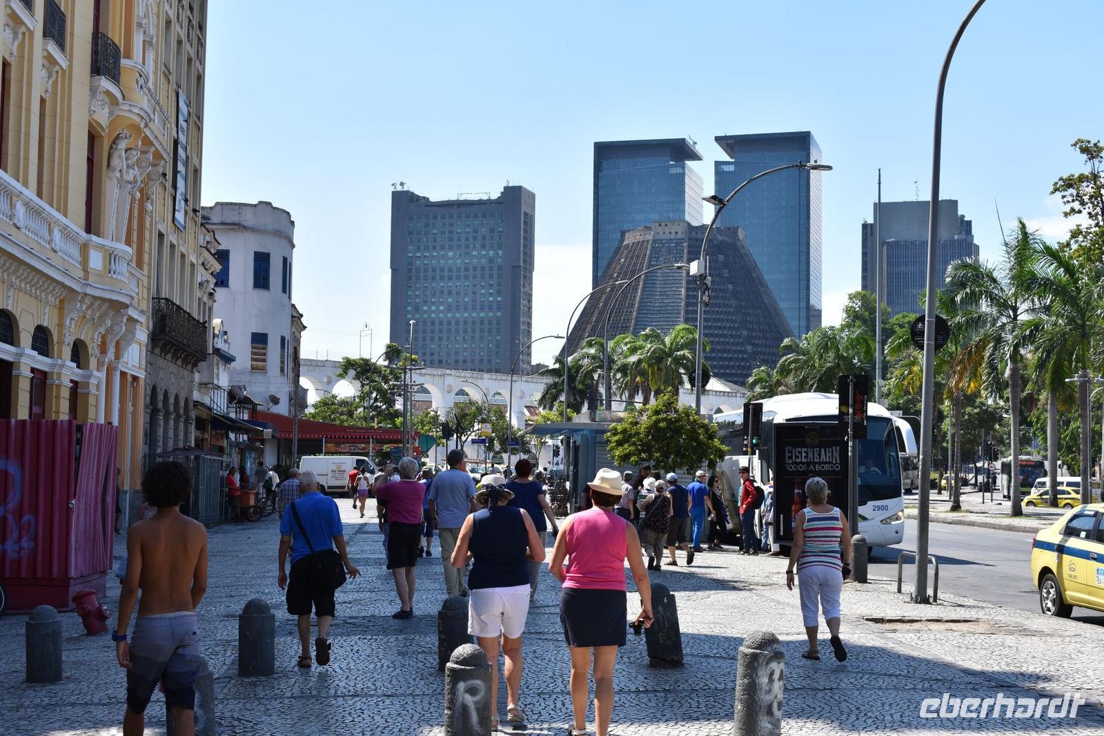 Mit dem Bus ging es weiter in das Zentrum von Rio. Dort haben wir uns die Kathedrale von Rio de Janeiro angesehen, die von außen aussieht wie ein großer Maya-Tempel. Es ging vorbei am weißen Aquädukt und wir spazierten zur Fliesen-Treppe - mittlerweile schon fast ein „must-see" von Rio.