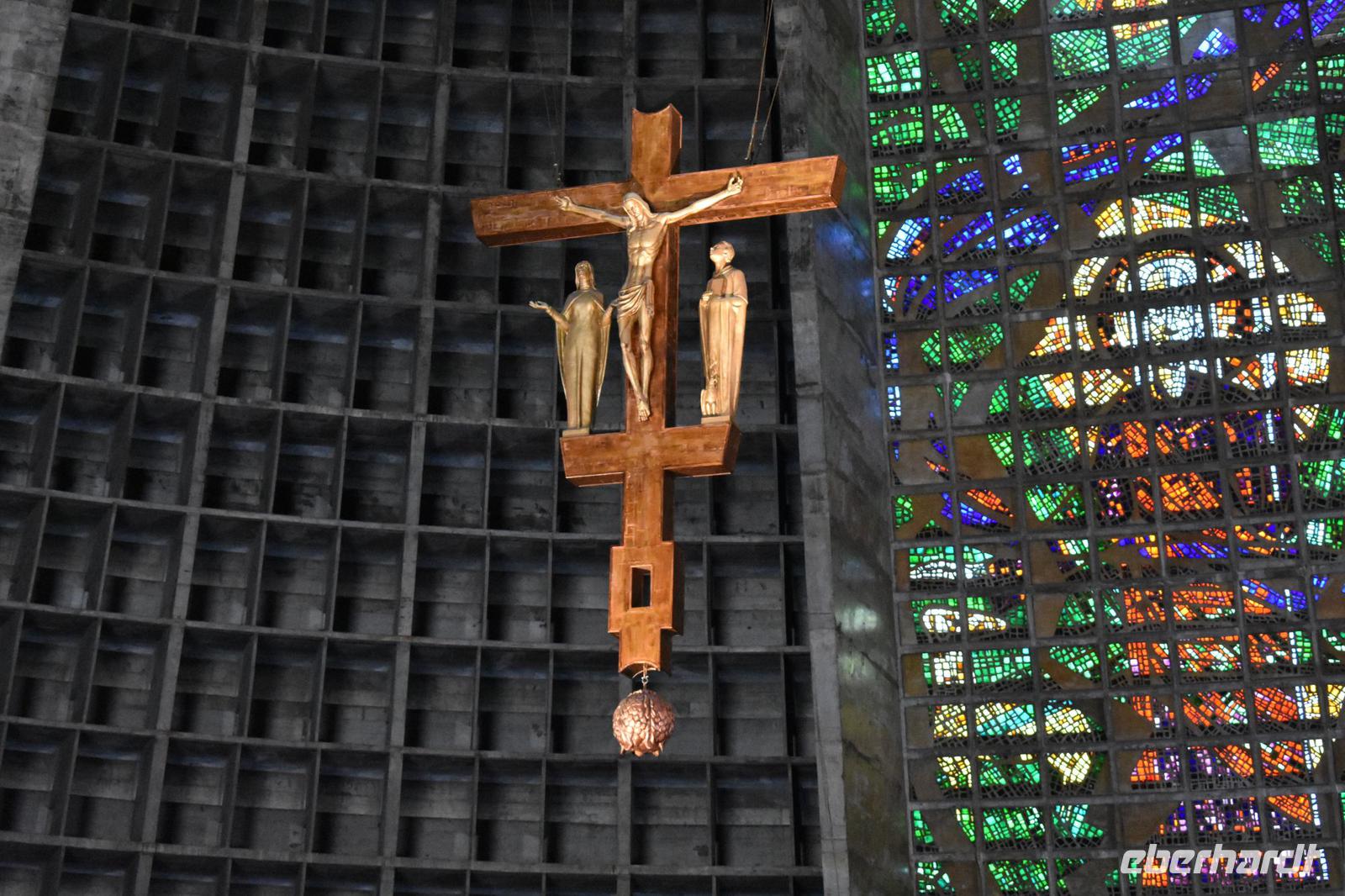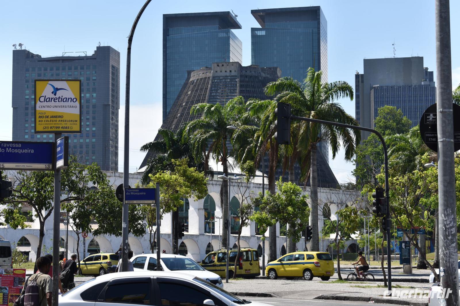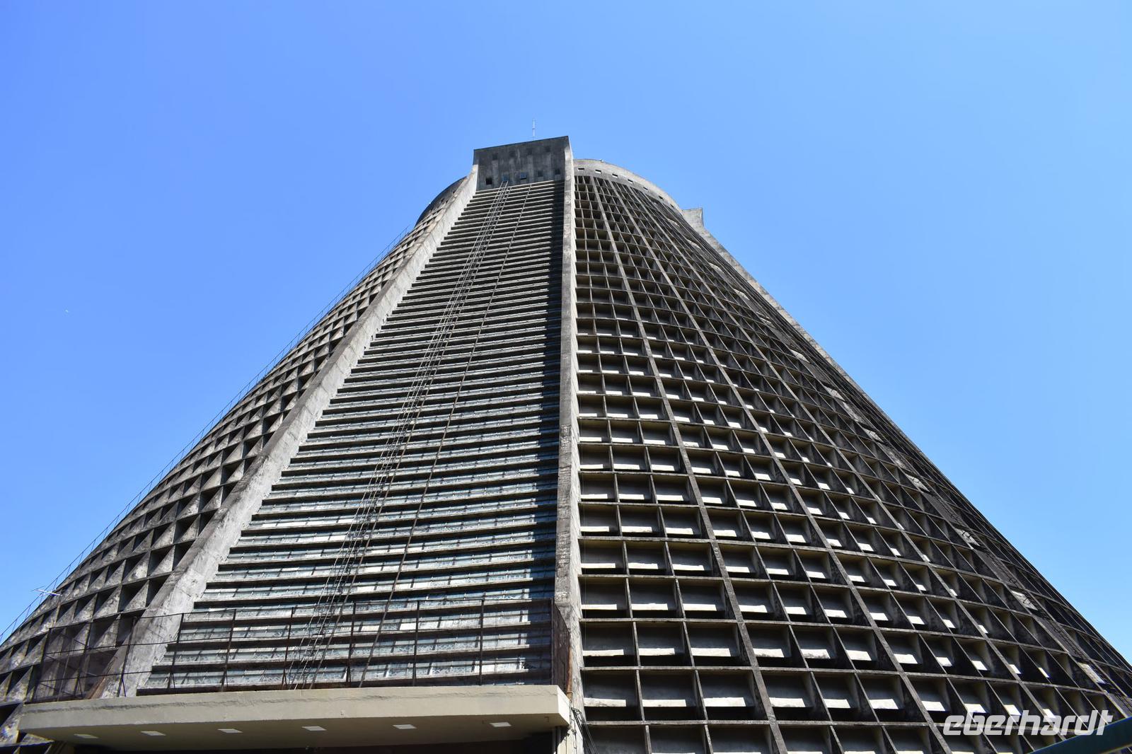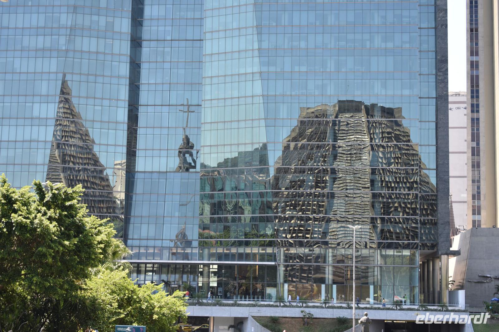Mit dem Bus ging es weiter in das Zentrum von Rio. Dort haben wir uns die Kathedrale von Rio de Janeiro angesehen, die von außen aussieht wie ein großer Maya-Tempel. Es ging vorbei am weißen Aquädukt und wir spazierten zur Fliesen-Treppe - mittlerweile schon fast ein „must-see" von Rio.