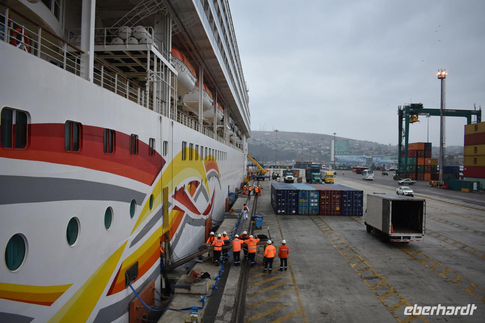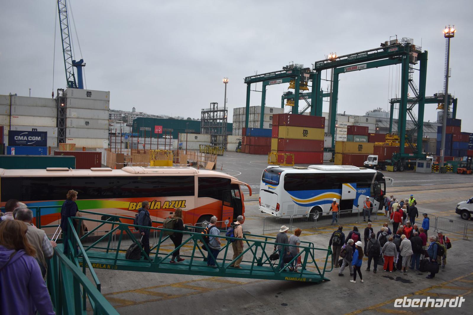 Am Morgen mussten wir uns von der Norwegian Sun verabschieden. Am Abend haben wir schon unsere Koffermarkiert und vor die Zimmertür gestellt. So konnten wir nun entspannt von Bord gehen und unser Gepäck im Hafen entgegennehmen. Ein letztes Mal checkten wir uns aus - Piep! Nach einer kurzen Kontrolle konnten wir unser Gepäck aus einer großen Halle abholen. Doch dann ein kurzer Schreck, ein Koffer war einfach nicht auffindbar. Doch schnell klärte sich, dass er bei der strengen chilenischen Zollkontrolle hängen geblieben war. Er musste dann aber nur kurz geöffnet werden und der Sachverhalt klärte sich schnell und wir konnten unsere Reise nach Valparaíso antreten.