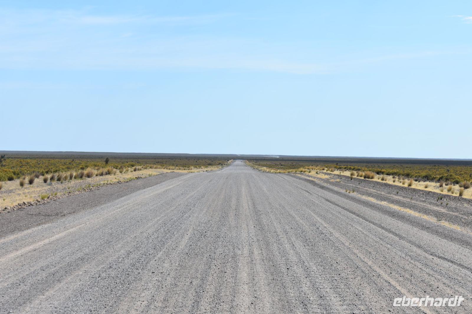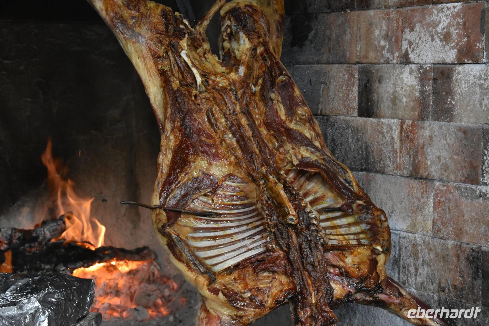 Wir fuhren über eine holprige Schotterpiste immer in nördlicher Richtung. Unserer Fahrer hat gut Gas gegeben, damit wir all unsere Punkte heute schaffen konnten. Nach zweieinhalb Stunden holpriger und erlebnisreicher Fahrt durch die argentinische Pampa kamen wir an der Estancia San Lorenzo an. Zuvor sahen wir noch ein paar Guanakos, Schafe und Pferde. Auf der Estancia empfing man uns mit einem deftigen Leckerbissen. Man servierte uns zum Mittagessen wohlschmeckendes Lamm, das auf ein eisernes Kreuz gespannt war und direkt am Feuer mehrere Stunden gegart wurde. Es ist wohl deshalb so hervorragend lecker, weil in dieser Gegend jedes Schaf rund drei Hektar Auslauf hat - im Schnitt. Denn eine kleine Farm/Estancia hat um die zwölftausend Hektar und müsste zweitausend Schafe hüten, damit sie sich rentieren könnte.