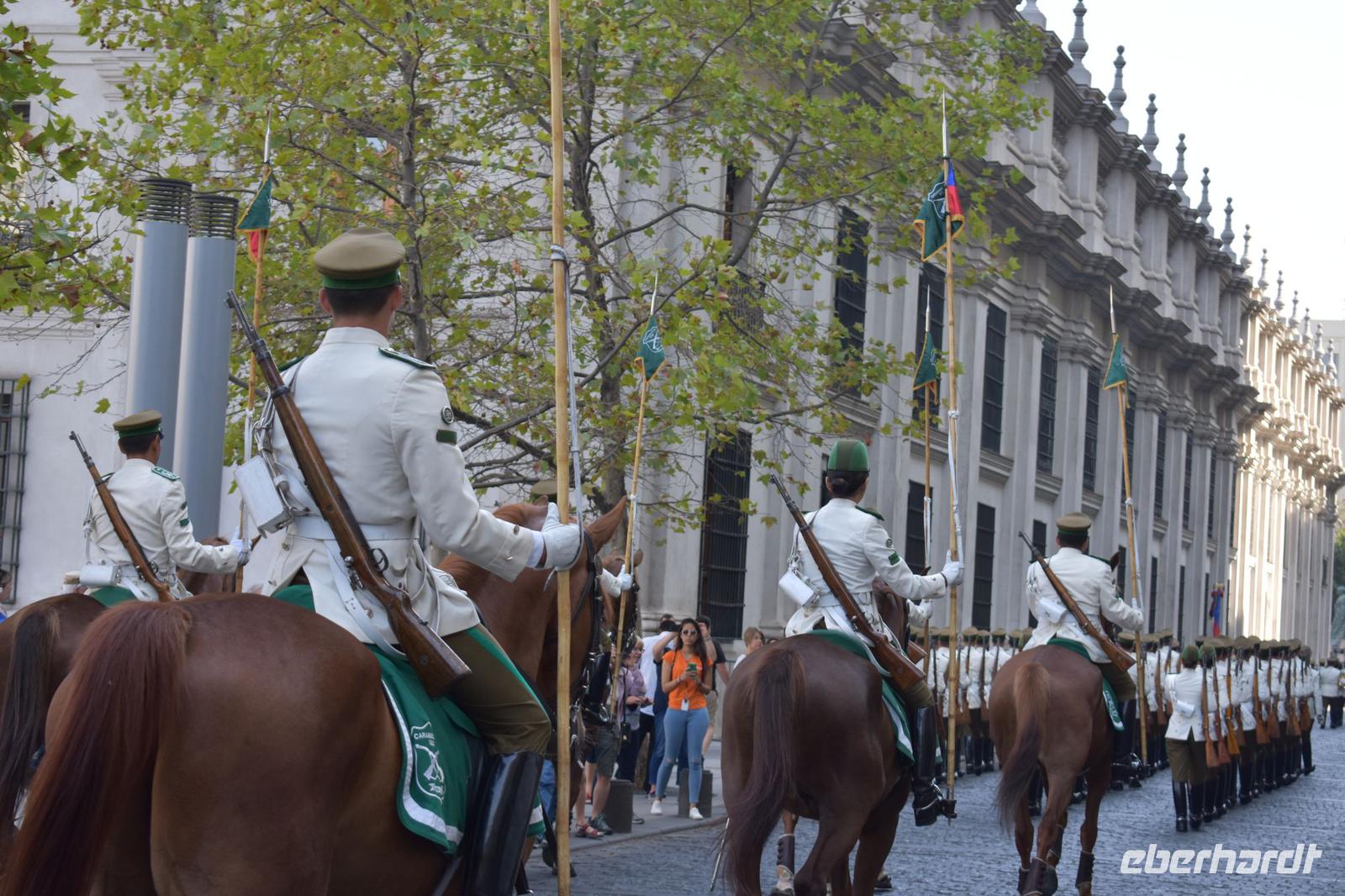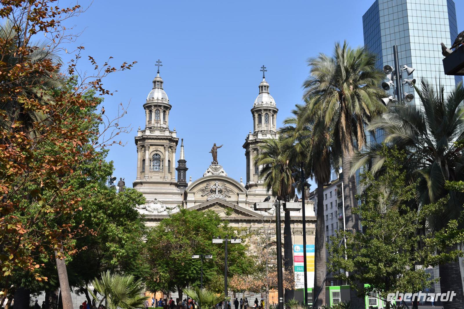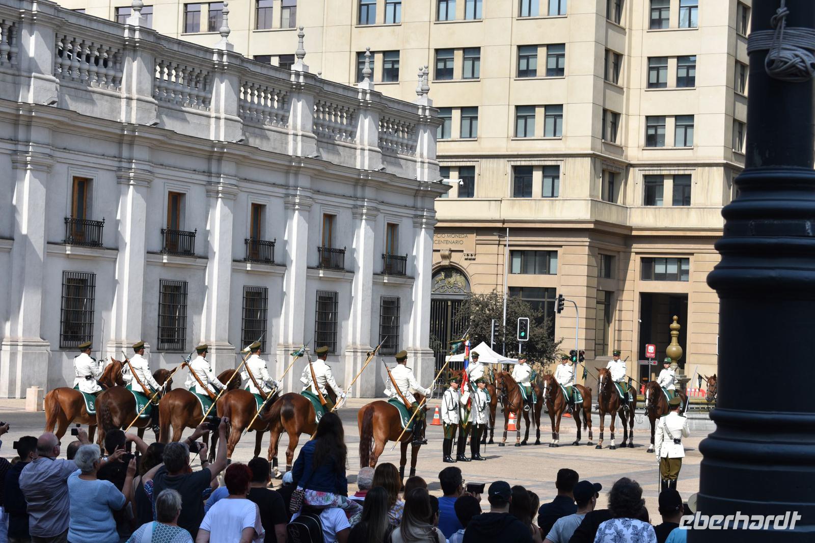 Weiter ging es quasi zur goldenen Mitte - der Plaza de Armas. Übersetzt heißt dies der Waffenplatz und bildet immer den wichtigsten, zumindest historischen Platz einer südamerikanischen Stadt, so hier auch in Chile. Wir drehten eine Runde über die Plaza und sahen uns auch die Kathedrale Metropolitan an, in der erfreulicher Weise gerade auch ein Gottesdienst stattfand. So wurde unser Besuch mit spirituellem Gesang untermauert. Dann spazierten wir an Universitätsgebäuden vorbei, der Iglesia San Francisco de Alameda und gelangten schließlich zum Präsidentenplast La Moneda. Wir machten gerade eine kleine Toilettenpause, da schritt eine Militärparade an uns vorbei. Es war Sonntag und es wurde der Wachwechsel lautstark eingeläutet. Mit einer Kapelle und Reiterei schritten die Soldaten anmutig an uns vorbei. Den Zapfenstreich auf der Plaza de la Constitución konnten wir dann eine Weile beobachten.