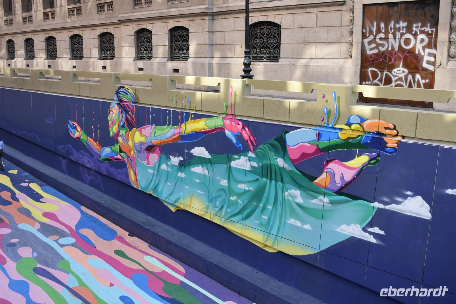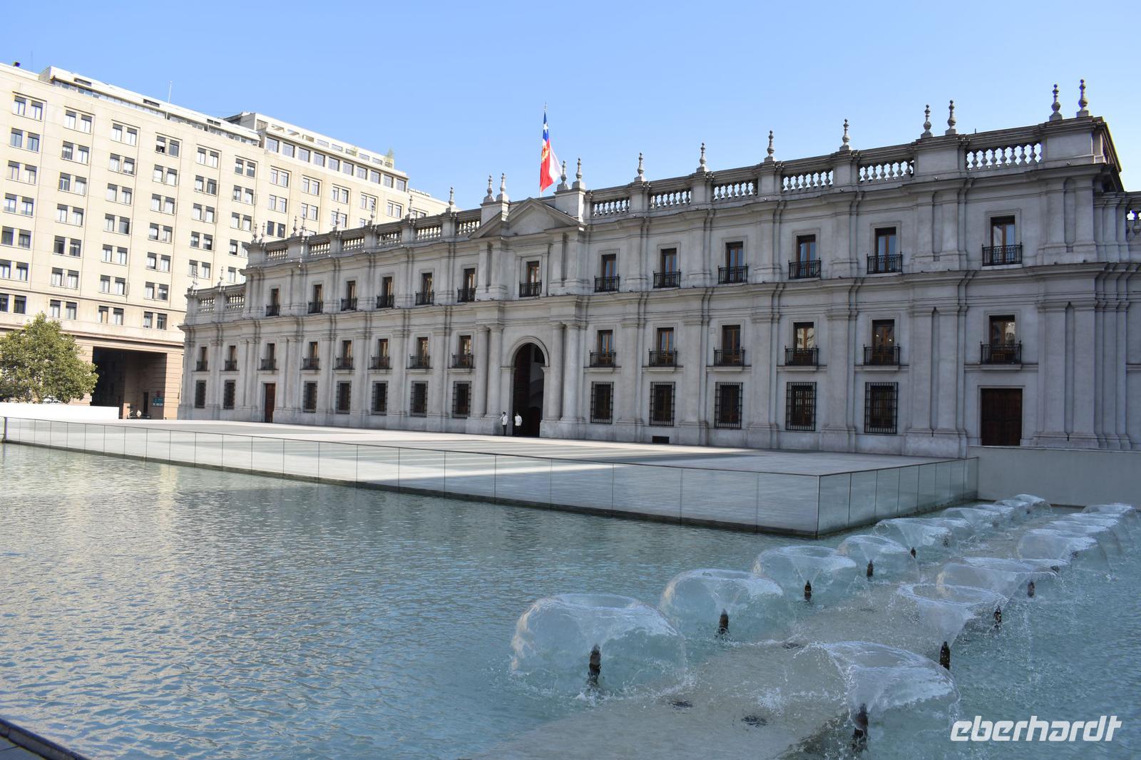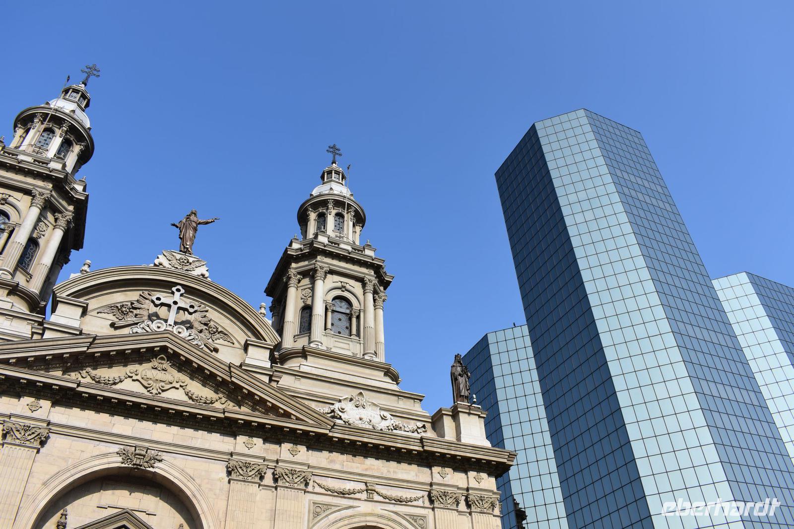 Weiter ging es quasi zur goldenen Mitte - der Plaza de Armas. Übersetzt heißt dies der Waffenplatz und bildet immer den wichtigsten, zumindest historischen Platz einer südamerikanischen Stadt, so hier auch in Chile. Wir drehten eine Runde über die Plaza und sahen uns auch die Kathedrale Metropolitan an, in der erfreulicher Weise gerade auch ein Gottesdienst stattfand. So wurde unser Besuch mit spirituellem Gesang untermauert. Dann spazierten wir an Universitätsgebäuden vorbei, der Iglesia San Francisco de Alameda und gelangten schließlich zum Präsidentenplast La Moneda. Wir machten gerade eine kleine Toilettenpause, da schritt eine Militärparade an uns vorbei. Es war Sonntag und es wurde der Wachwechsel lautstark eingeläutet. Mit einer Kapelle und Reiterei schritten die Soldaten anmutig an uns vorbei. Den Zapfenstreich auf der Plaza de la Constitución konnten wir dann eine Weile beobachten.