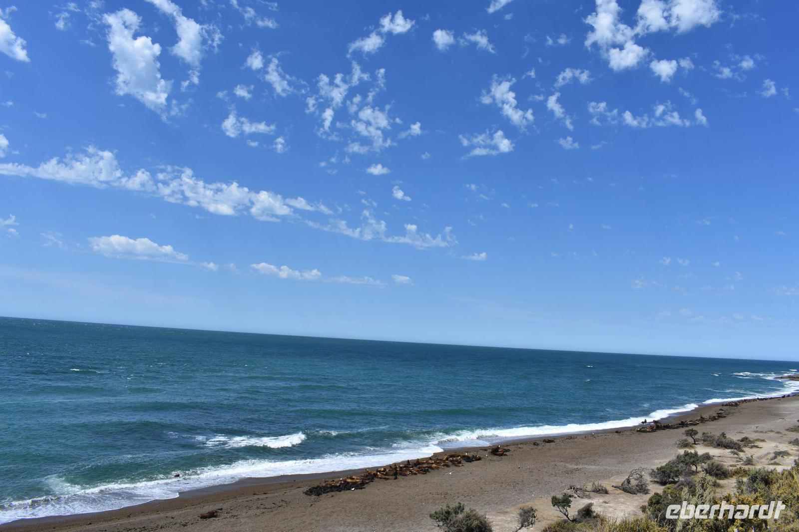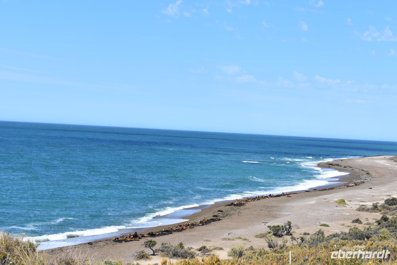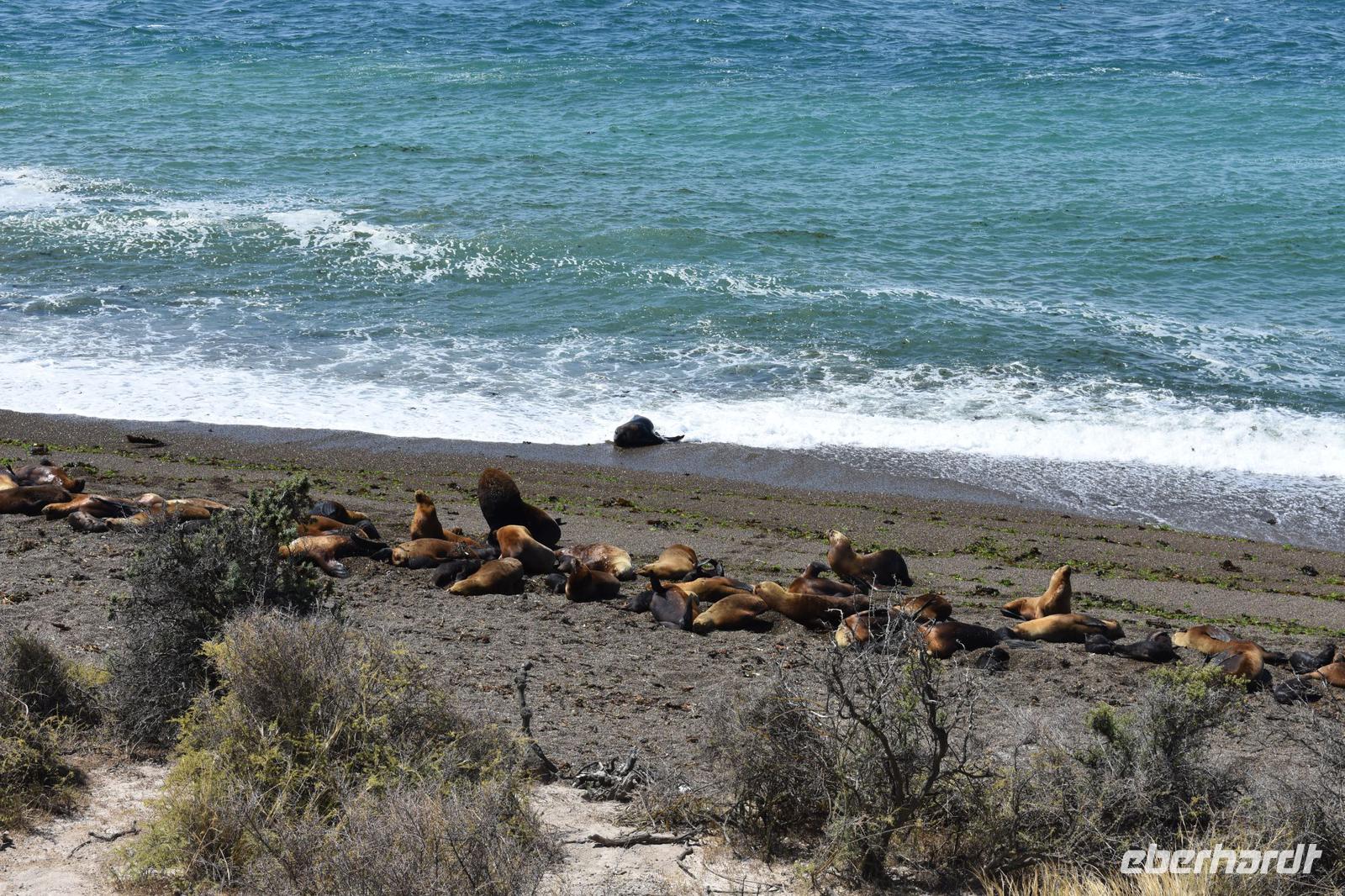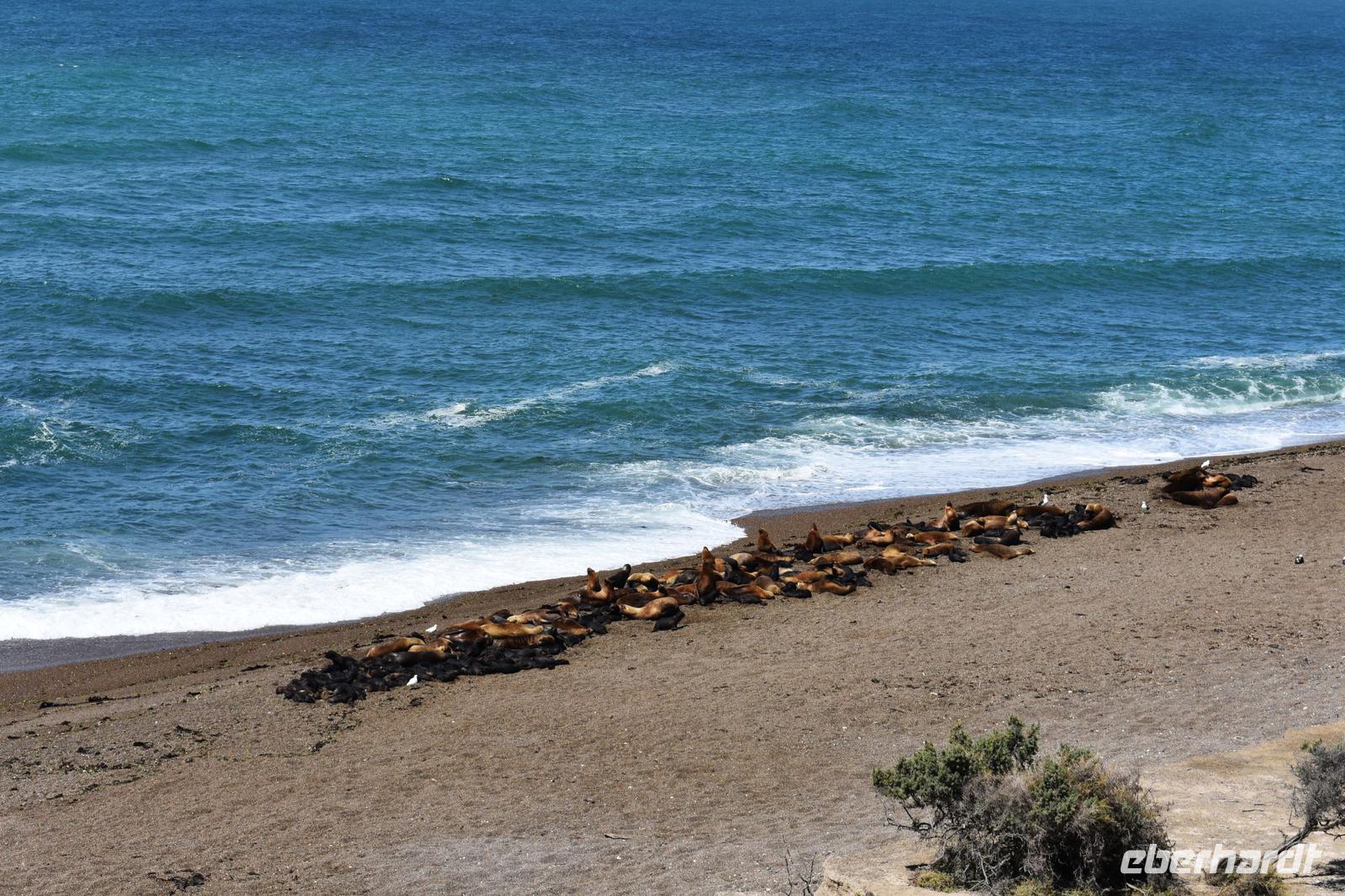 Mit diesem Erlebnis im Gebäck fuhren wir mit dem Bus über die Schotterstraße ein Stück weiter, nach Punta de Norte. Wie der Name es schon sagt, waren wir nun am nördlichsten Punkt von Valdes angekommen. Dort erwarteten uns ein paar Gruppen von Seelöwen. Sie hatten eine Menge Jungen bei sich. Aus der Ferne waren es kleine schwarze Pakete, die sich in der Sonne, nahe der Meeresböschung rekelten. Dicht umgeben von den Weibchen und Männchen. Beim Anblick der Männchen wird einem schnell klar warum sie See-Löwen heißen. Ihr kräftiger Hals ist so bauschig, dass man denken könnte sie hätten eine kräftige Mähne. Immer wieder mussten die Männchen ihr Revier fertigen und jüngere Artgenossen in die Flucht schlagen. Ein spannendes Spektakel.